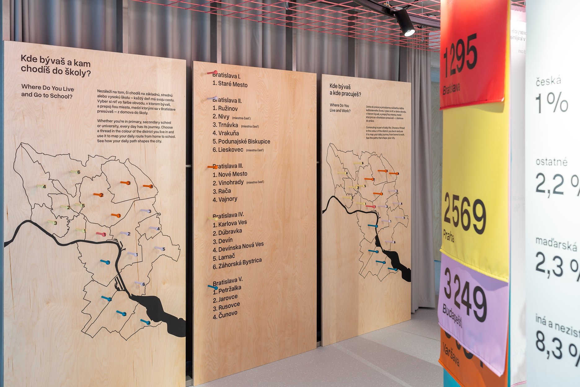 Výstava zobrazuje Bratislavu ako prepojený systém – sieť vzťahov medzi ľuďmi, infraštruktúrou a krajinou.