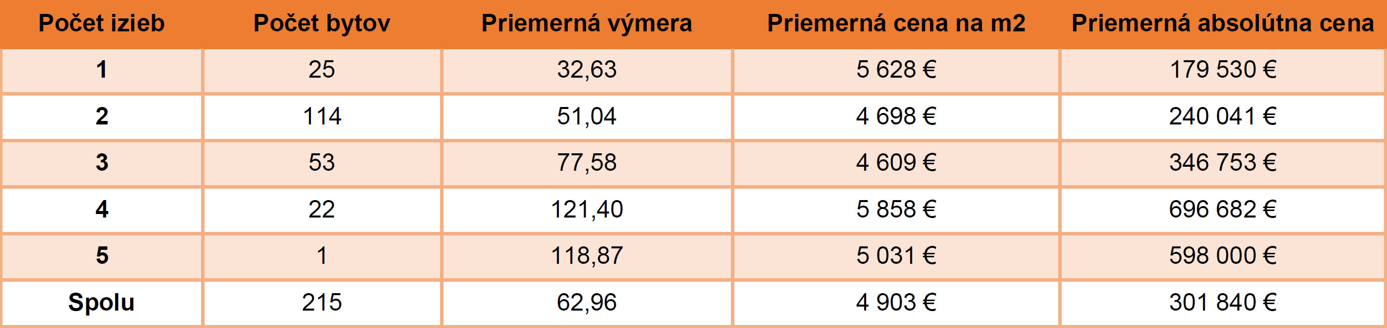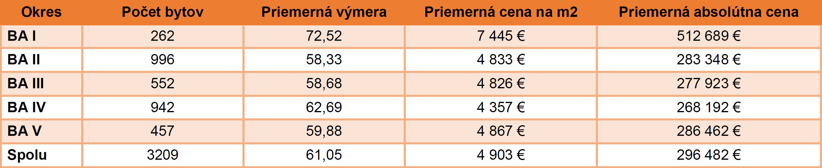 Priemerná absolútna cena bytov v bratislavských novostavbách dosiahla 296 tisíc € vrátane DPH. Medziročne sa tak zvýšila o 10%, čo je dôsledkom kombinácie rastu ceny na štvorec o 15% a poklesu priemernej rozlohy o 5%. Byty v okresoch BA II-BA V sa v priemere predávali za 268 až 2 86 tisíc EUR vrátane DPH. Priemer v starom meste bol pri sume 512 tisíc eur takmer dvojnásobný, čo má za následok vyššia jednotková cena, ale aj o 20% vyššia plocha bytov. Tá sa v priemere za Bratislavu koncom roka pohybovala na úrovni 61 m². Oproti koncu 2021 sa postupne znížila o 5% z 64,5 na 61 m².