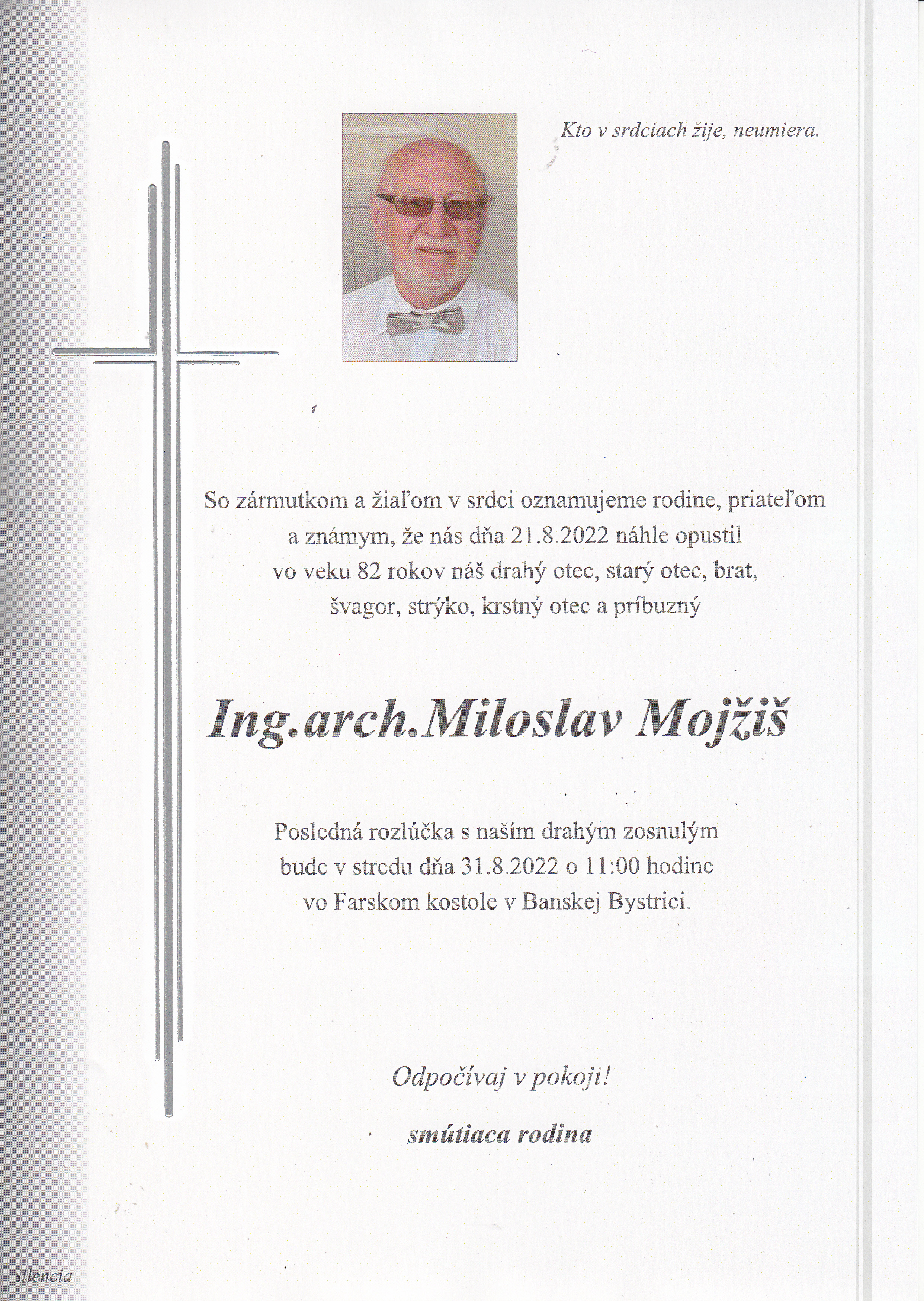 Milé kolegyne a kolegovia. S veľkým zármutkom vám oznamujem smutnú správu, že nás svojim odchodom do večnosti navždy opustil náš priateľ a obľúbený kolega-architekt Miloš Mojžiš.