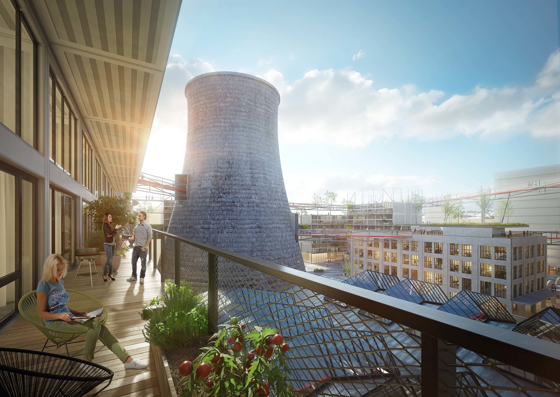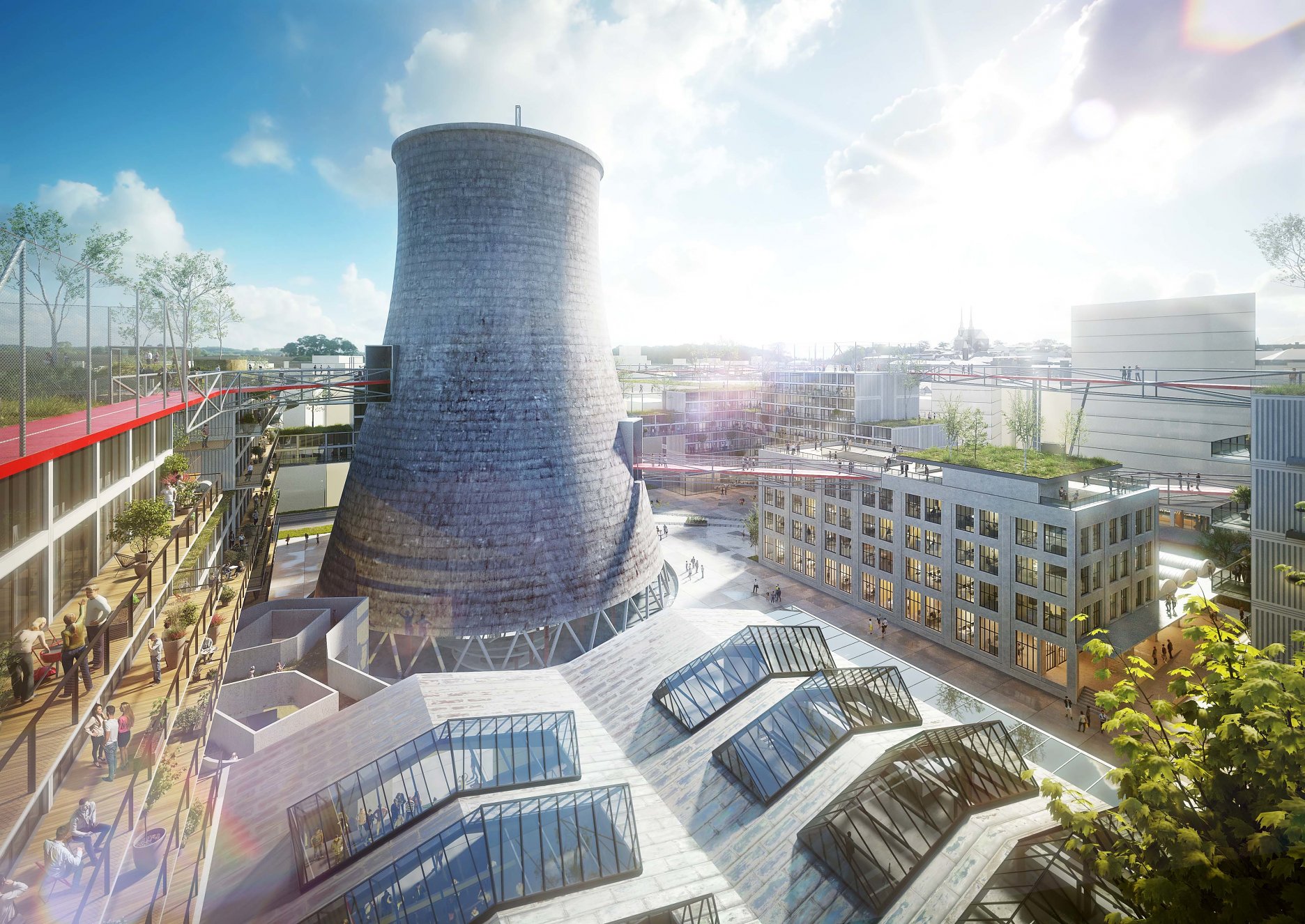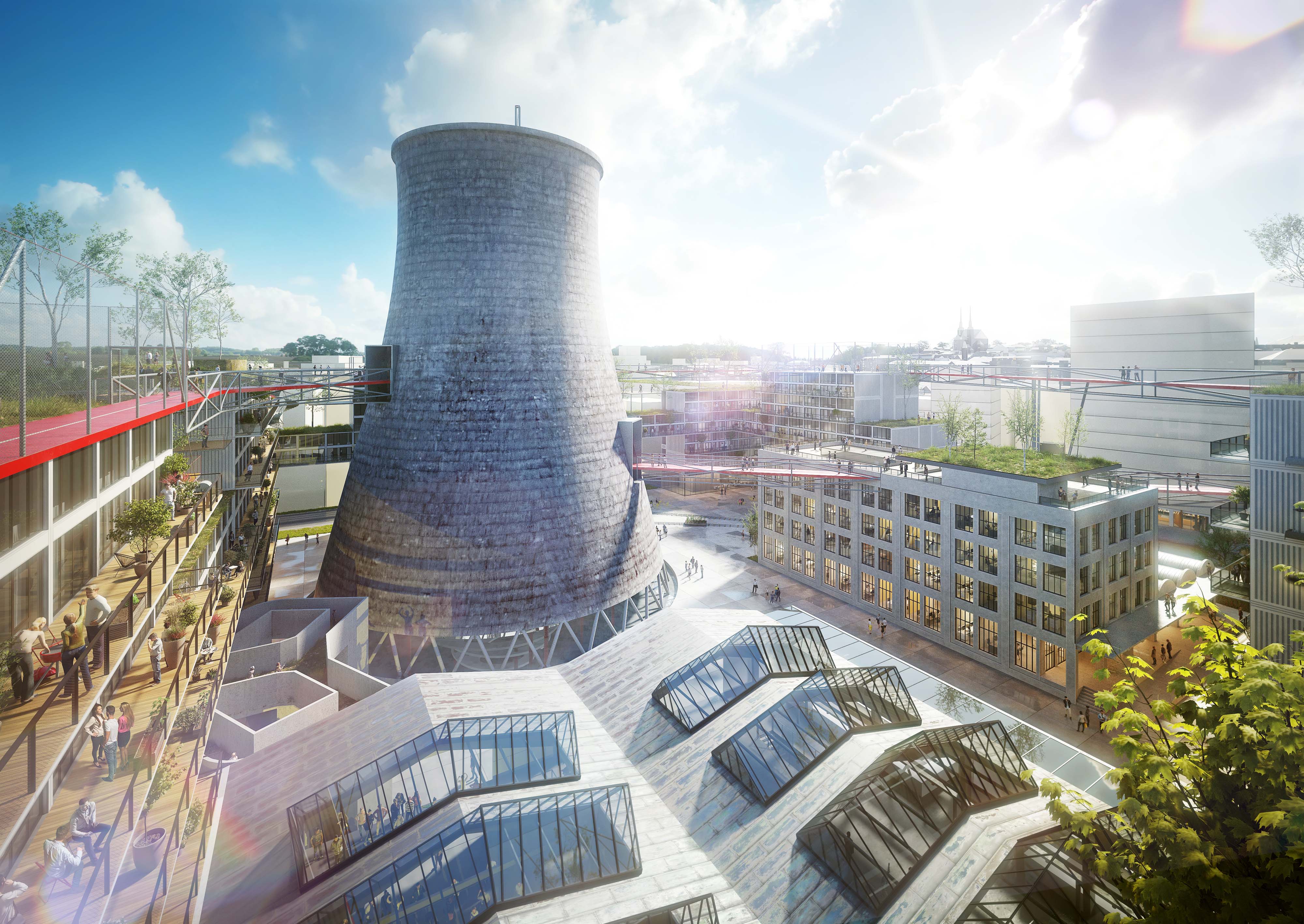 Nevyužívanú strešnú krajinu industriálnej štvrte nahradia nové strešné terasy, športoviská, zeleň... Architekti navrhli 400 metrový skywalk, ktorý prechádza chladiacou vežou a prepája nové budovy s dominantami brownfieldu. “Zelené střechy budou pouze jedním z mnoha aspektů, které povedou ke snížení negativních vlivů výstavby čtvrti na životní prostředí. Cílem města Brna a ateliéru A8000 je vybudovat chytrou čtvrť. Součástí přípravy projektu jsou proto například kulaté stoly s experty včetně energetiků či poskytovatelů základní infrastruktury,” vysvetľujú architekti.