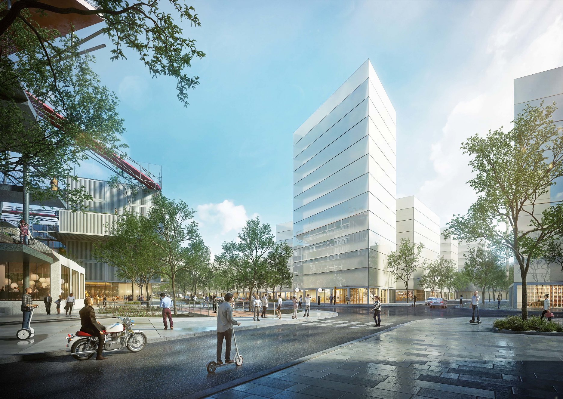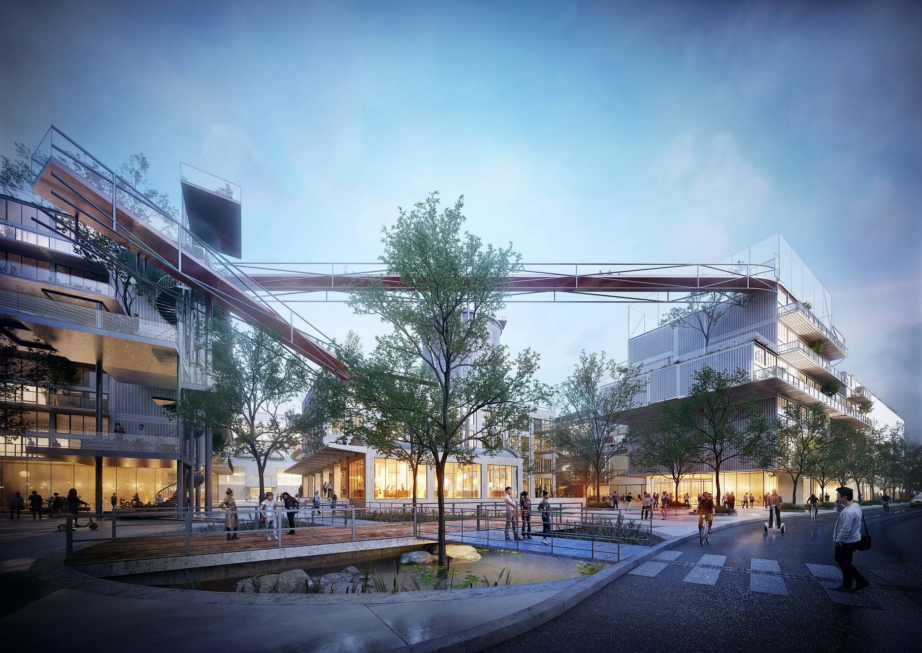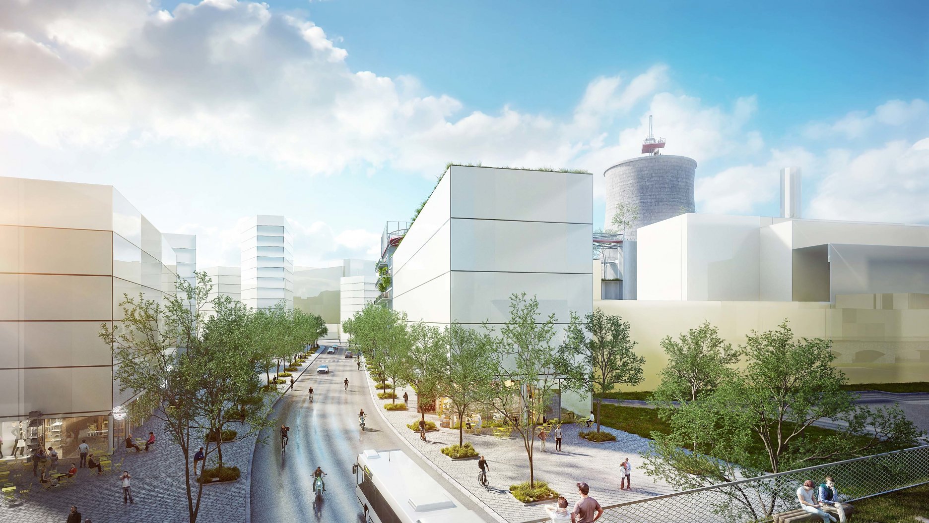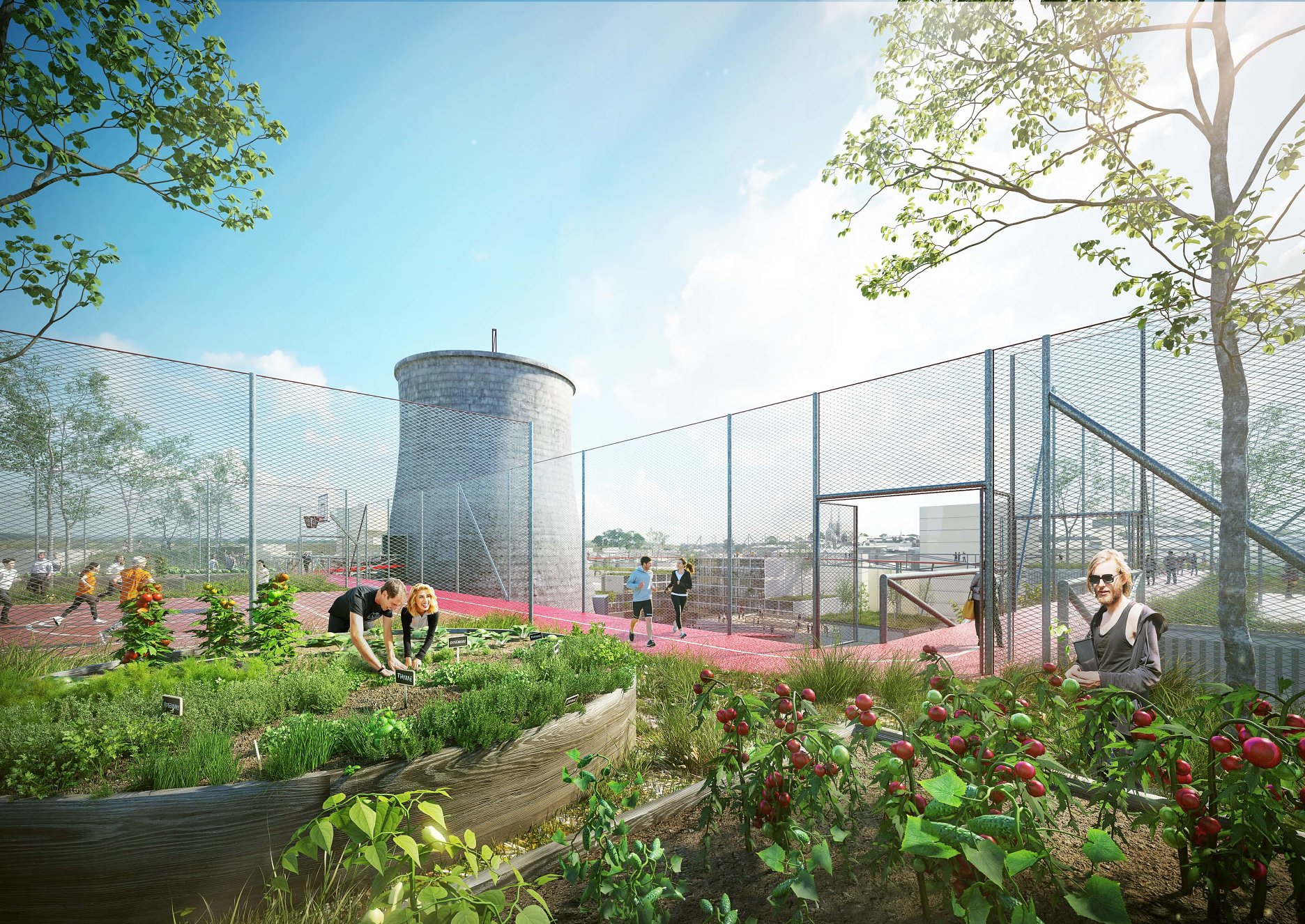 Nevyužívanú strešnú krajinu industriálnej štvrte nahradia nové strešné terasy, športoviská, zeleň... Architekti navrhli 400 metrový skywalk, ktorý prechádza chladiacou vežou a prepája nové budovy s dominantami brownfieldu. “Zelené střechy budou pouze jedním z mnoha aspektů, které povedou ke snížení negativních vlivů výstavby čtvrti na životní prostředí. Cílem města Brna a ateliéru A8000 je vybudovat chytrou čtvrť. Součástí přípravy projektu jsou proto například kulaté stoly s experty včetně energetiků či poskytovatelů základní infrastruktury,” vysvetľujú architekti.