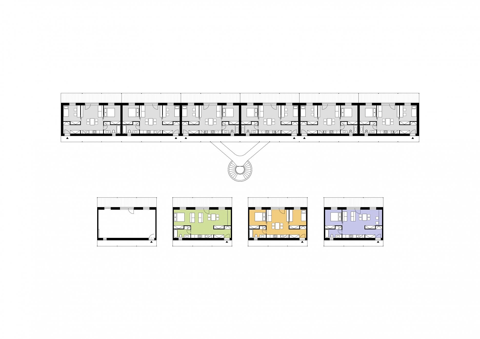 Tento dům vznikl jako dostupné sociální bydlení inspirované pavlačovým domem Hannese Meyera z 30. let v Dessau. Koncept jsme aktualizovali a přetvořili do moderní podoby. Každá bytová jednotka má 55 m² a lze ji řešit jako 3kk, 2kk nebo 1kk. Obslužné místnosti jsou orientované k pavlači, obytné prostory do krajiny, což zajišťuje soukromí a zároveň rozšiřuje obytný prostor o pavlač o šířce 2 metry. Byty lze skládat vedle sebe, měnit jejich počet i počet podlaží. Požárně odolná kovová schodiště vytvářejí kontrast s dřevěnou konstrukcí a podtrhují kombinaci technického a přírodního přístupu. Design podporuje individualizaci – balkony i okna lze upravit, takže si obyvatelé sami tvoří vizuální mozaiku, která dává domu osobitý charakter.