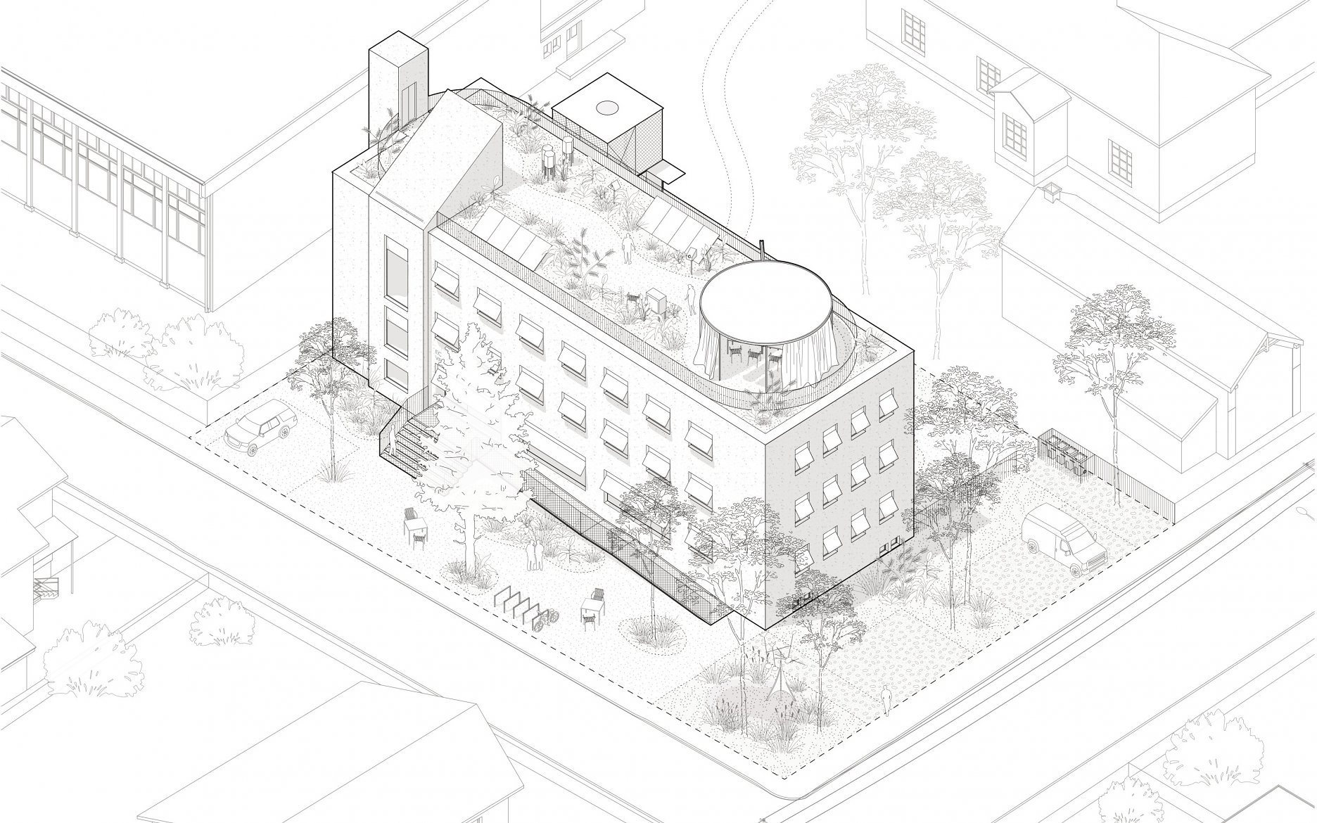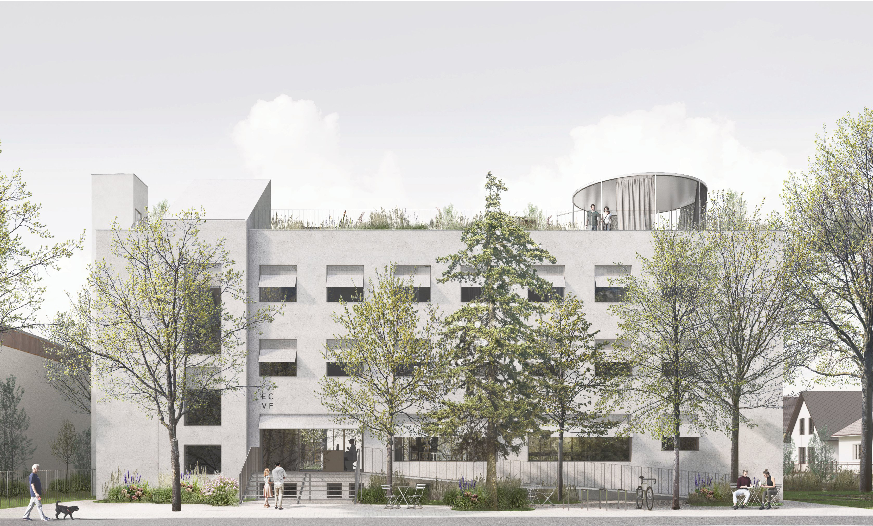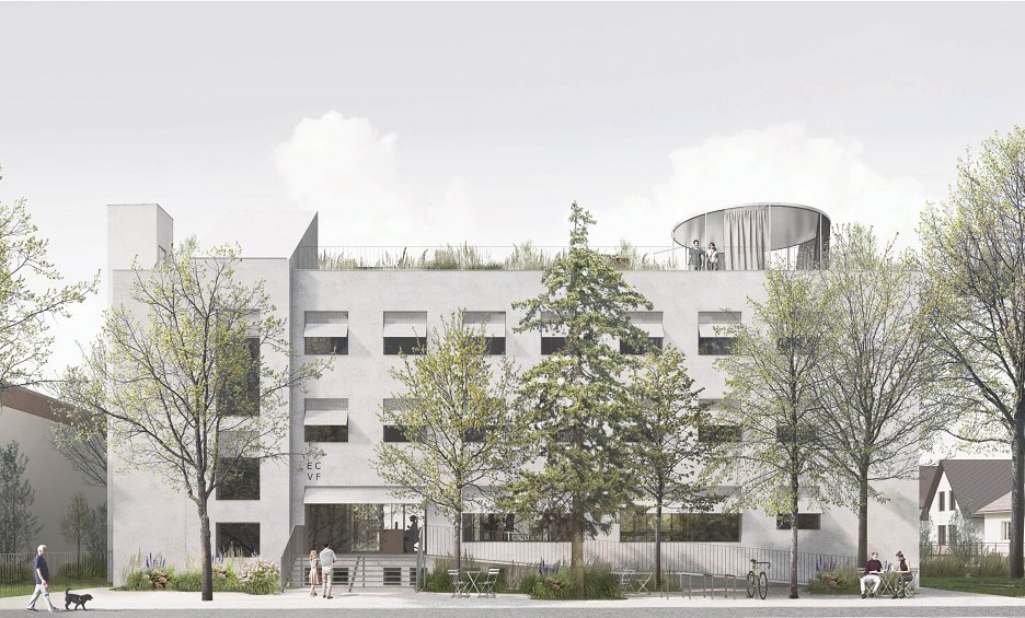 Naopak fasáda objektu je obohatená dômyselným systémom s pasívnymi teplo-technickými vlastnosťami. Veľkosti otvorov sú v zásade zachované, no zmenou lícovania rámov okien je dosiahnuté väčšie presklenie a vyššie solárne zisky bez potreby zásadného stavebného zásahu. Porota tak vysoko hodnotí najmenej “technokratické” riešenie pre dosiahnutie “zeleného” architektonického konceptu, minimálnu uhlíkovú stopu zabezpečenú redukovaním potreby stavania nových konštrukcií a búrania existujúcej substancie. Návrh v exteriéri počíta s odstránením ostatných menších objektov, ako pochopiteľným dôsledkom minimalistického prístupu. Existujúce časti pôvodných prvkov oplotenia a ponechanie parkovania na južnej strane, však verejne prístupné plochy zbytočne fragmentujú. Stráca sa tak potenciál kvalít exteriérového využitia. Návrh aj napriek tomu zostáva vo svojej podstate veľmi kultivovaný.