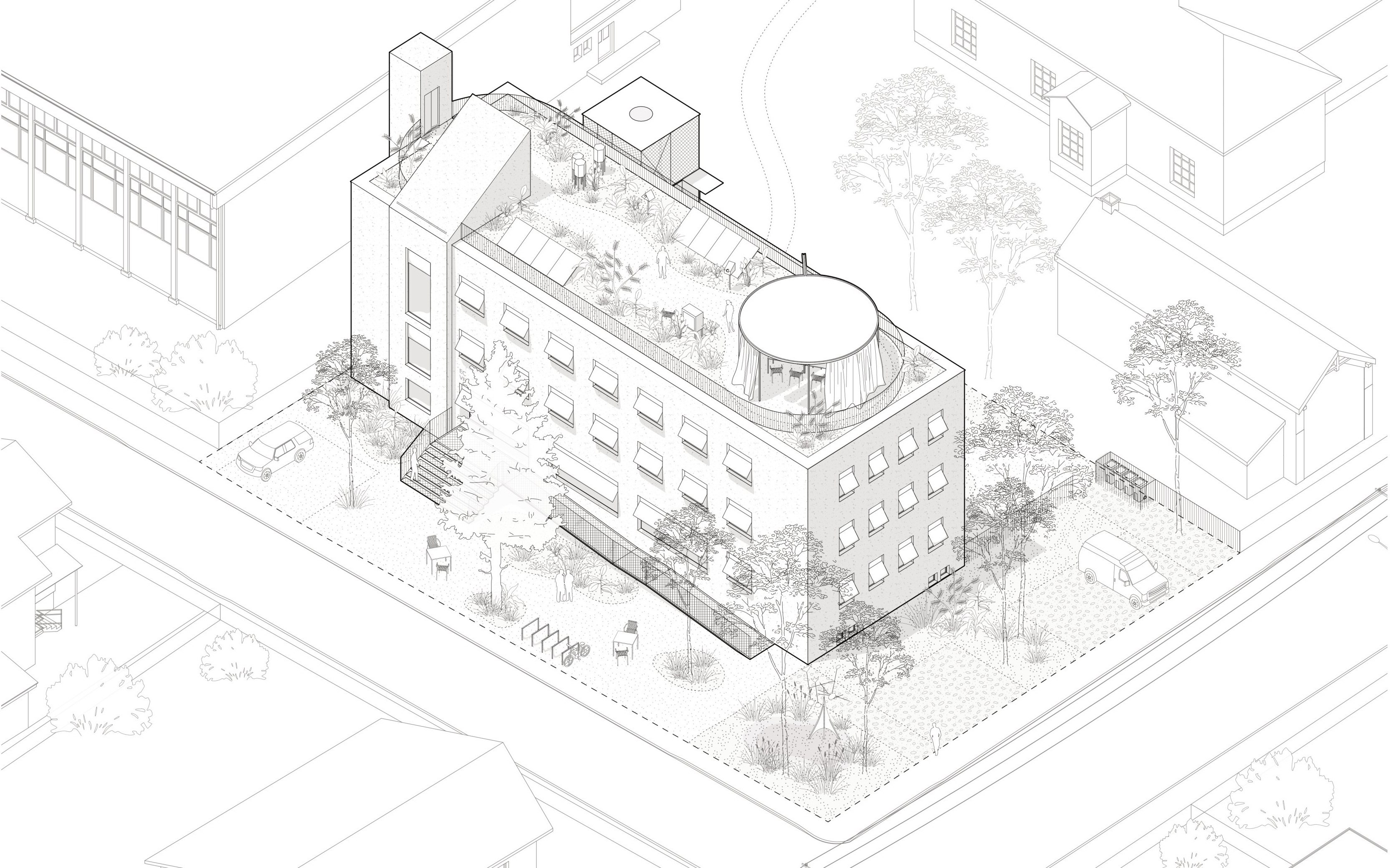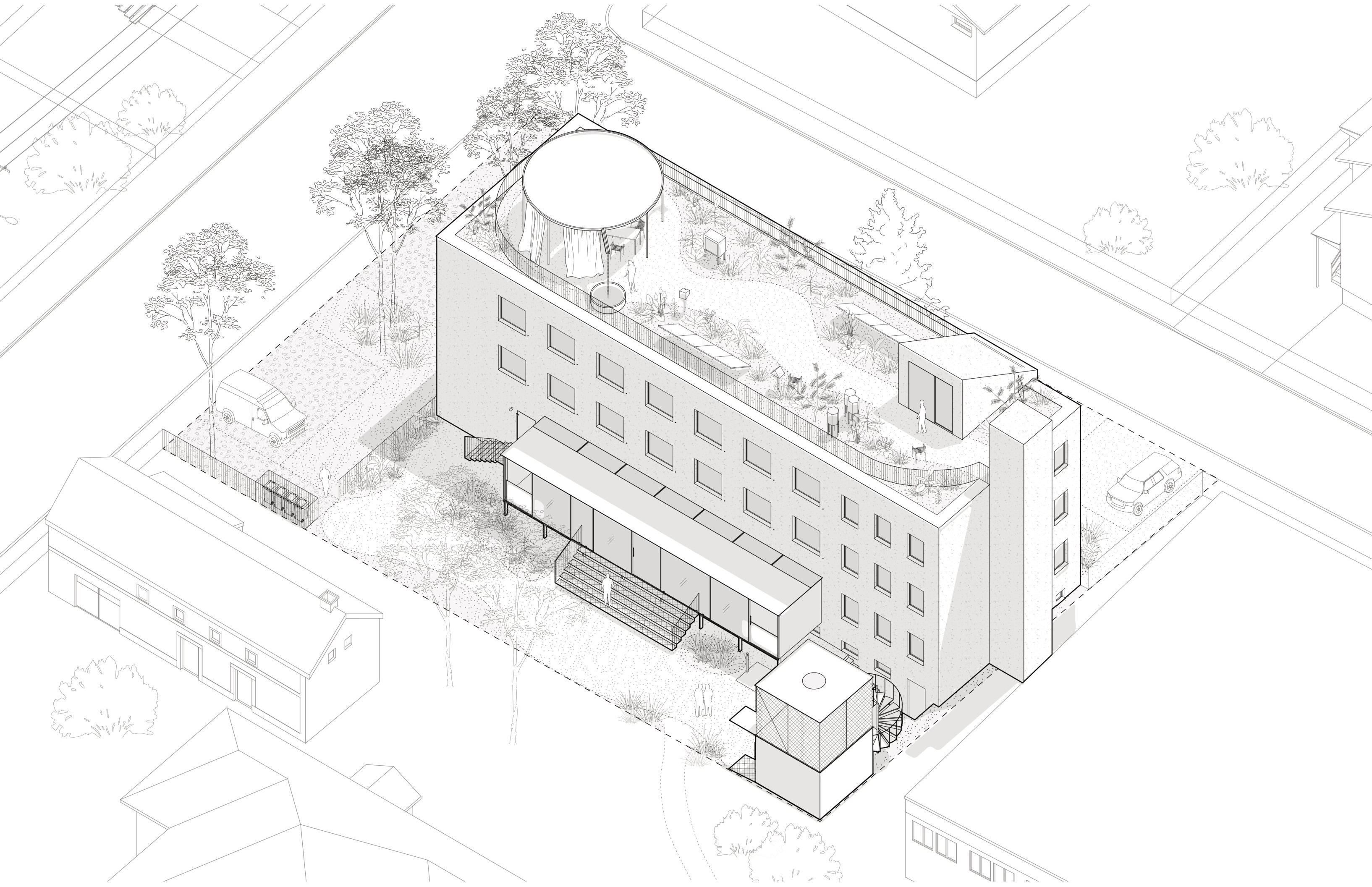 Návrh pracuje so zachovaním ostatných objektov, mení ich funkčné využitie a dotvára v ich medzipriestore kryté terasy a nové vstupy. Tieto intímne zákutia a mikropriestory spoločných častí sú silným momentom. Zapĺňajú však veľkú časť riešeného územia na úkor exteriérových plôch. Z hľadiska náročnosti, sa celkovo jedná o najkomplikovanejší prístup k úprave pôvodného objektu, ktorého opodstatnenosť je diskutabilná.
