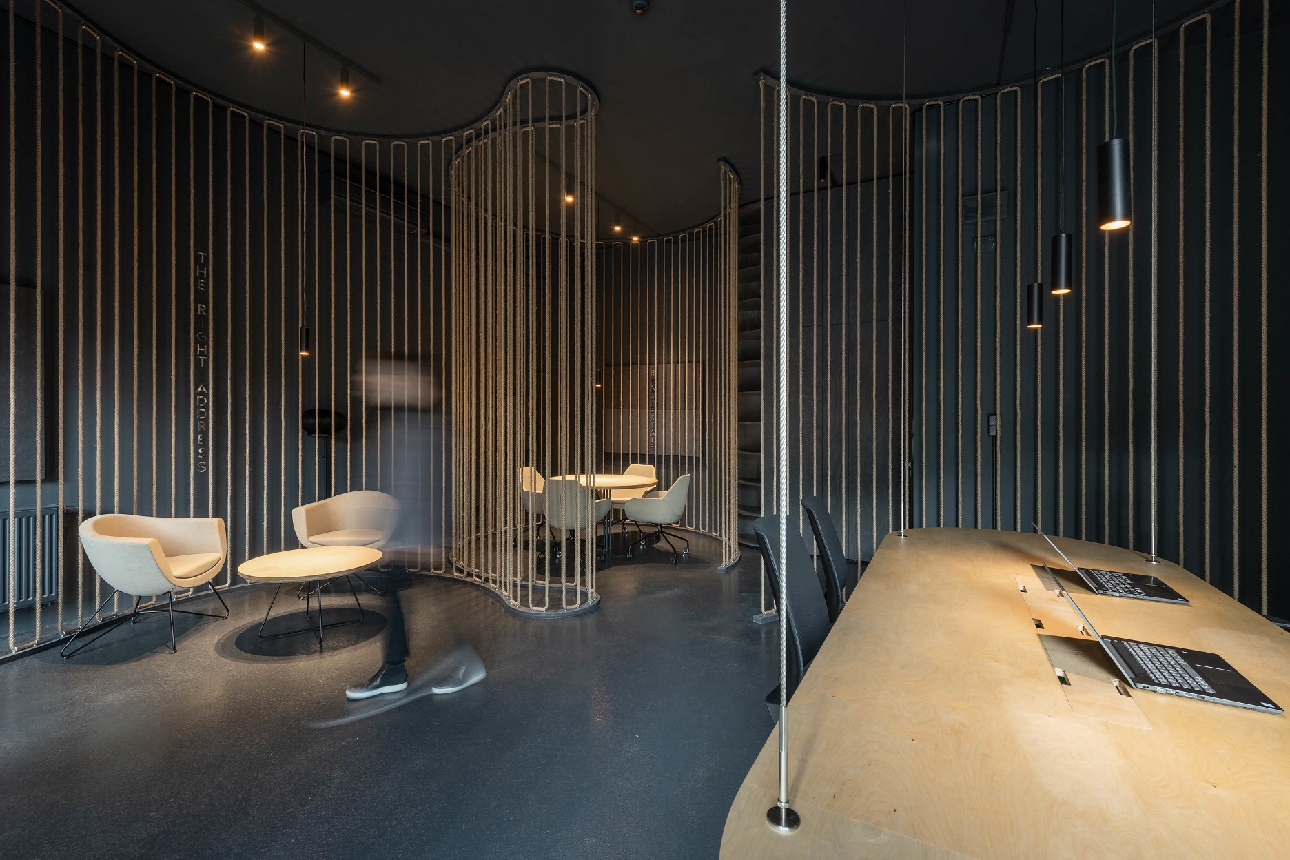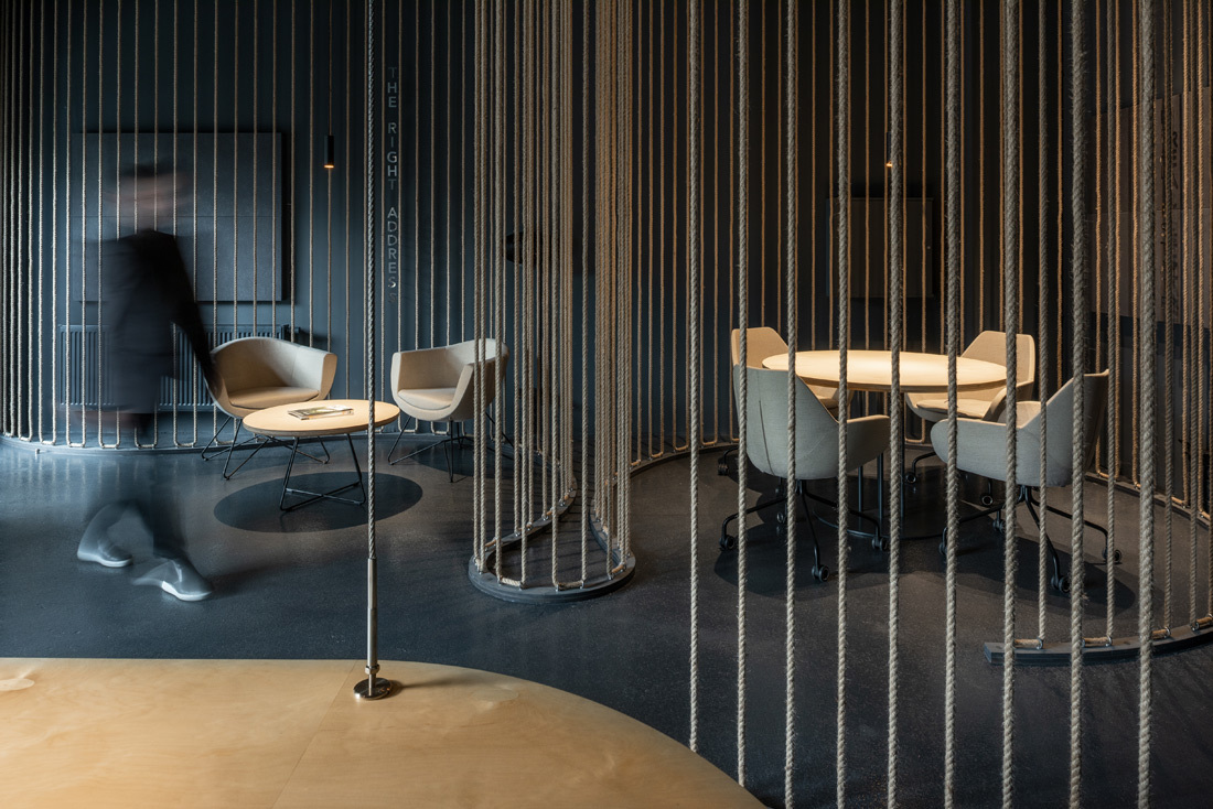 Abstrahovanú kulisu pre každodennú prácu dotvárajú precízne autorské detaily. Realizácia nesie autorský rukopis Petra Gondu, ktorý s motívmi svetlo vs. tieň a transparentnosť vs. solídna materialita pracoval aj pri scénografických projektoch...