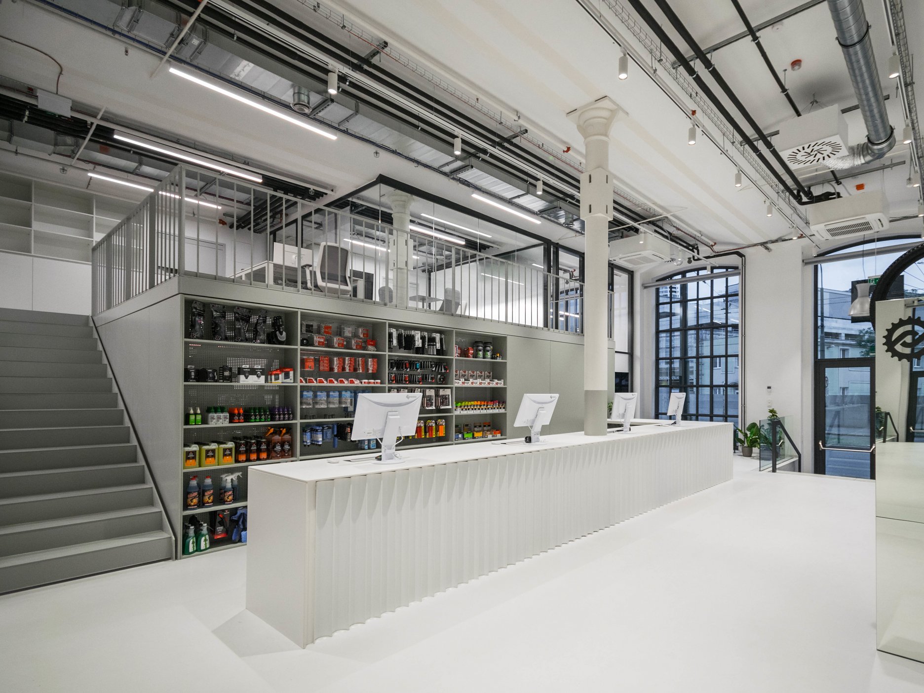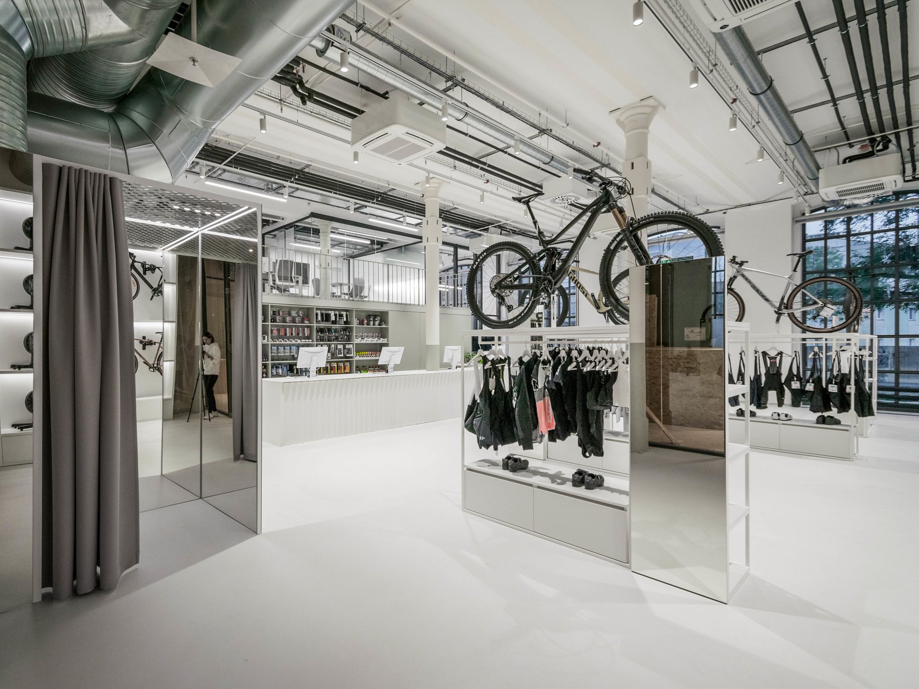 Minimalistický priestor pre cyklistický sortiment na prízemí objektu Pradiareň 1900.