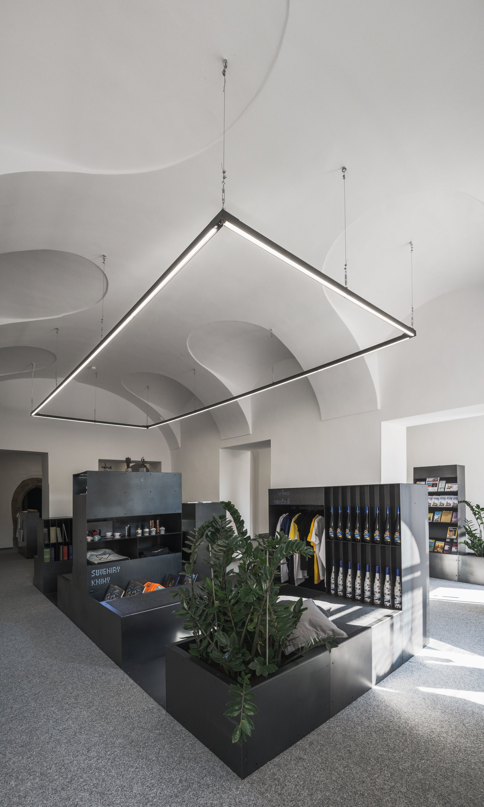 Kompaktné bloky zariadenia odsadené od obvodových konštrukcií umožňujú voľne vnímať klenutý interiér starej radnice.