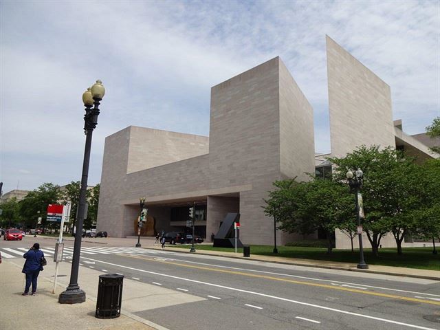 Pei vytvořil ve Washingtonu jedno ze svých nejvýznamnějších děl a jeho Východní budova nechybí v žádné učebnici moderní architektury. Se svým antikizujícím sousedem zdánlivě nemá nic společného, ale záměrně Pei použil na obklad průčelí stejný materiál – narůžovělý mramor, dokonce nechal znovu kvůli tomu otevřít zrušený lom v Knoxvillu ve státě Tennessee. Vstupní nice dominuje kovová plastika Henryho Moora. Lichoběžníkový pozemek rozdělil architekt na dva trojúhelníky. Ten větší je zasvěcen uměleckým sbírkám, ten menší pak technickému a badatelskému zázemí.