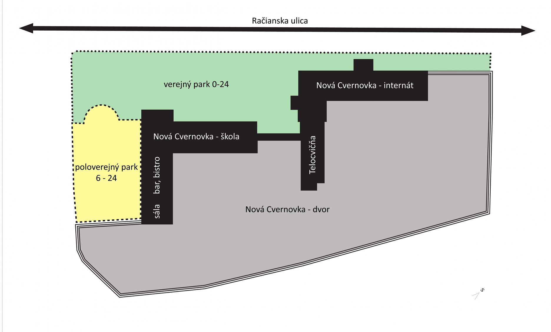 Nadácia Cvernovka sa rozhodla, že časť areálu o ploche približne 8 200m² premení na verejný park s novými funkciami slúžiacimi návštevníkom Novej Cvernovky, ako aj obyvateľom okolitých štvrtí. Priestor verejnej časti parku medzi Novou Cvernovkou a Račianskou ulicou bude voľne prístupný 24 hodín denne. S týmto rozhodnutím súvisí aj zámer odstrániť existujúci múr s oplotením oddeľujúcim ulicu od areálu, vybudovať cyklotrasu na mieste súčasného chodníka pre peších a jeho presunom do samotného parku. Riešenie cyklotrasy vzniklo aj na základe konzultácií s Petrom Netrim, odborníkom na udržateľnú a cyklistickú dopravu z občianskeho združenia Cyklokoalícia.