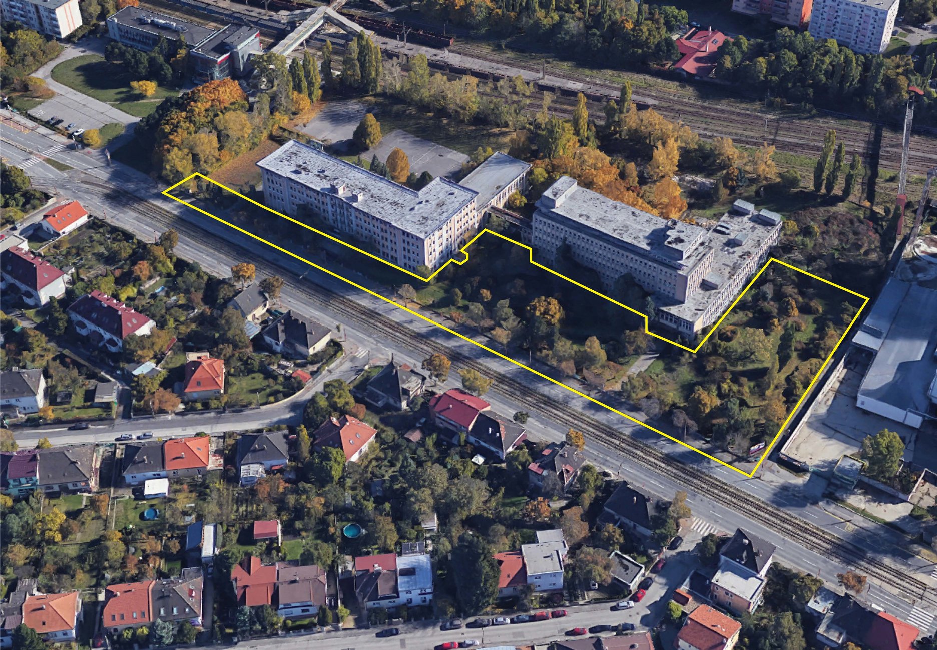 Súčasťou areálu sú modernistické stavby pôvodnej školy a internátu postavené podľa projektu architekta Vladimíra Karfíka. Areál je situovaný na severnej hranici mestskej časti Bratislava - Nové Mesto, pri frekventovanej Račianskej ulici. Susedí so štvrťou Biely Kríž, areálom bývalého závodu Palma-Tumys, železničnou stanicou Bratislava - Predmestie a sídliskom Nobelova/Dimitrovka.