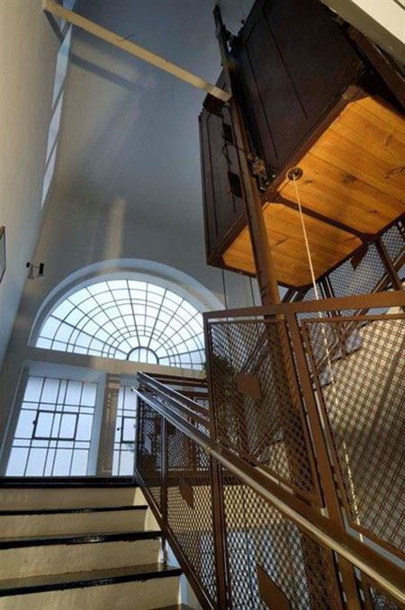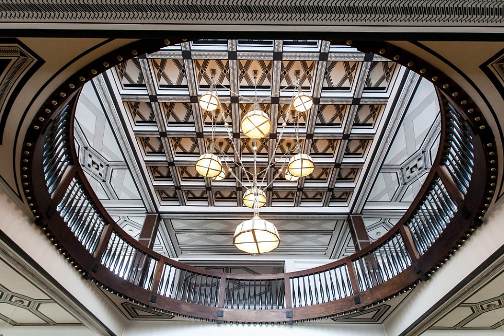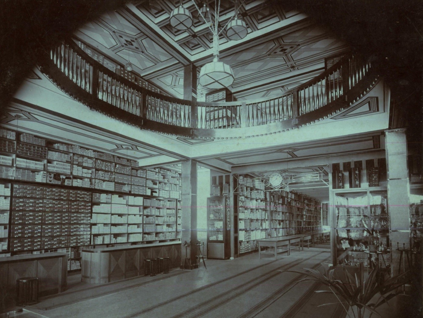 Velmi zajímavé bylo i vnitřní uspořádání. Přízemí a patro propojoval velký kruhový světlík, z ochozu v patře tedy mohli návštěvních pozorovat přízemní provoz a těm, kteří byli dole, se zase otevíral krásný pohled na kazetový strop s lustrem, jejž tvořila krystalická svítidla zavěšená na řetízcích. Vše je laděno v prudce elegantní černo-bílo-hnědé kombinaci s jemným geometrickým dekorem, který jasně prozrazuje inspiraci vídeňskou architekturou uměleckých dílen Wiener Werkstätte a pracemi jejich zakladatele, brtnického rodáka Josefa Hoffmanna. Velkorysé řešení průčelí i interiéru umožňovala zvolená železobetonová konstrukce, tedy systém, který byl tehdy využíván spíše u velkých industriálních staveb. Gočár využil uvnitř domu invenčně i další vynález té doby – sklobeton. Impozantní bylo i technické vybavení, včetně osobního výtahu spojujícího přízemí a patro, který byl před časem restaurován a je opět funkční.