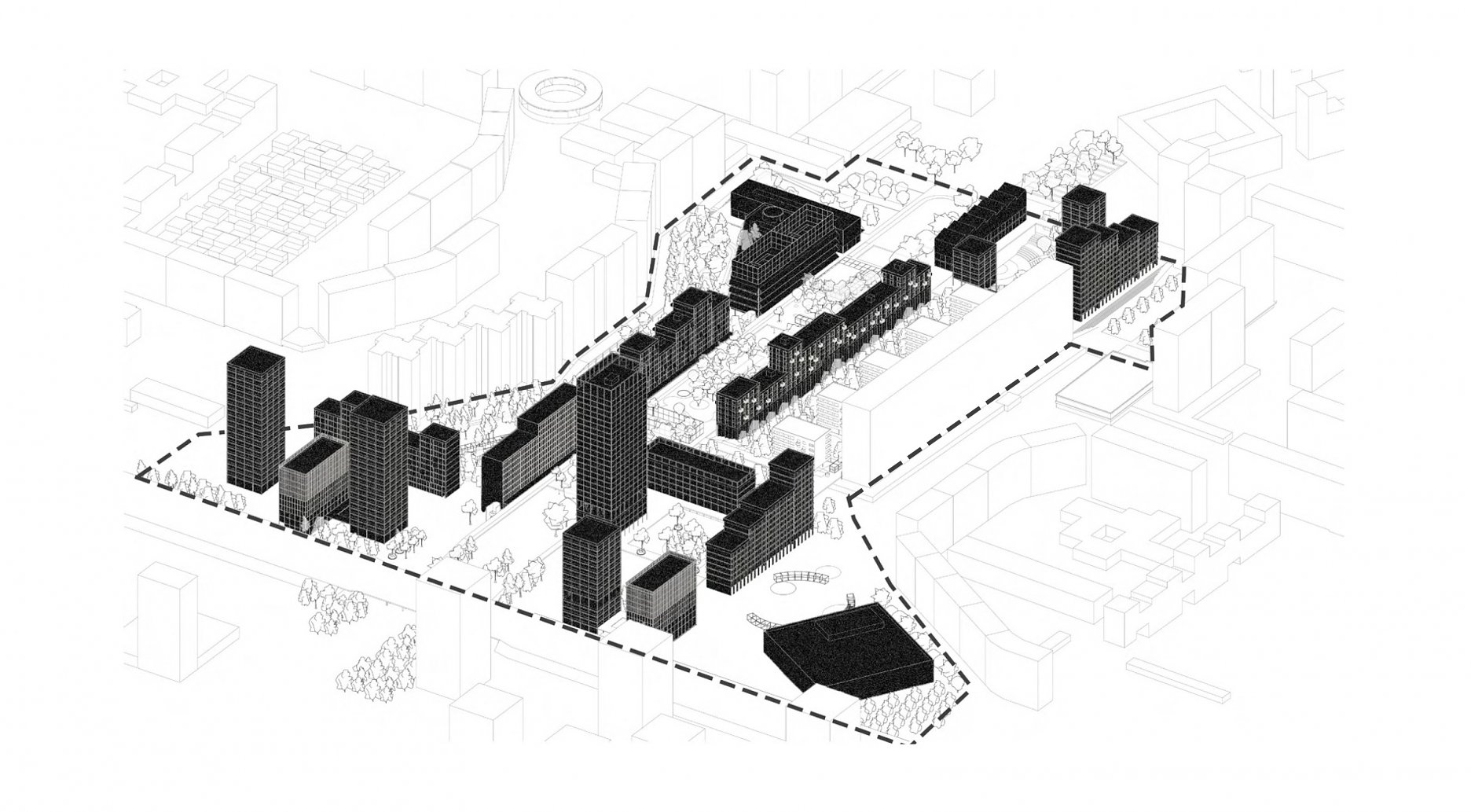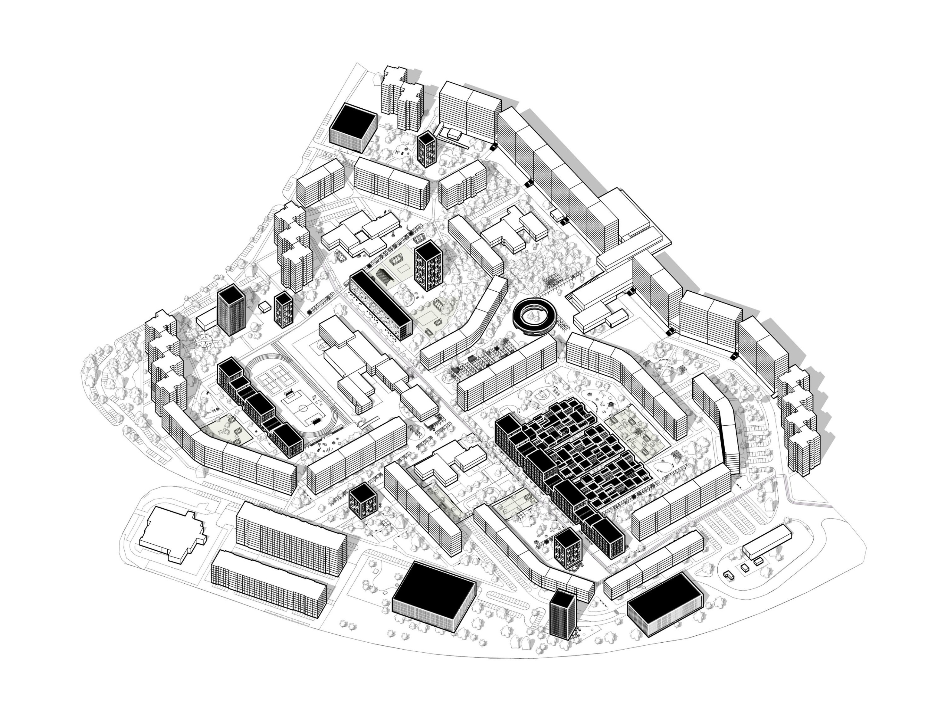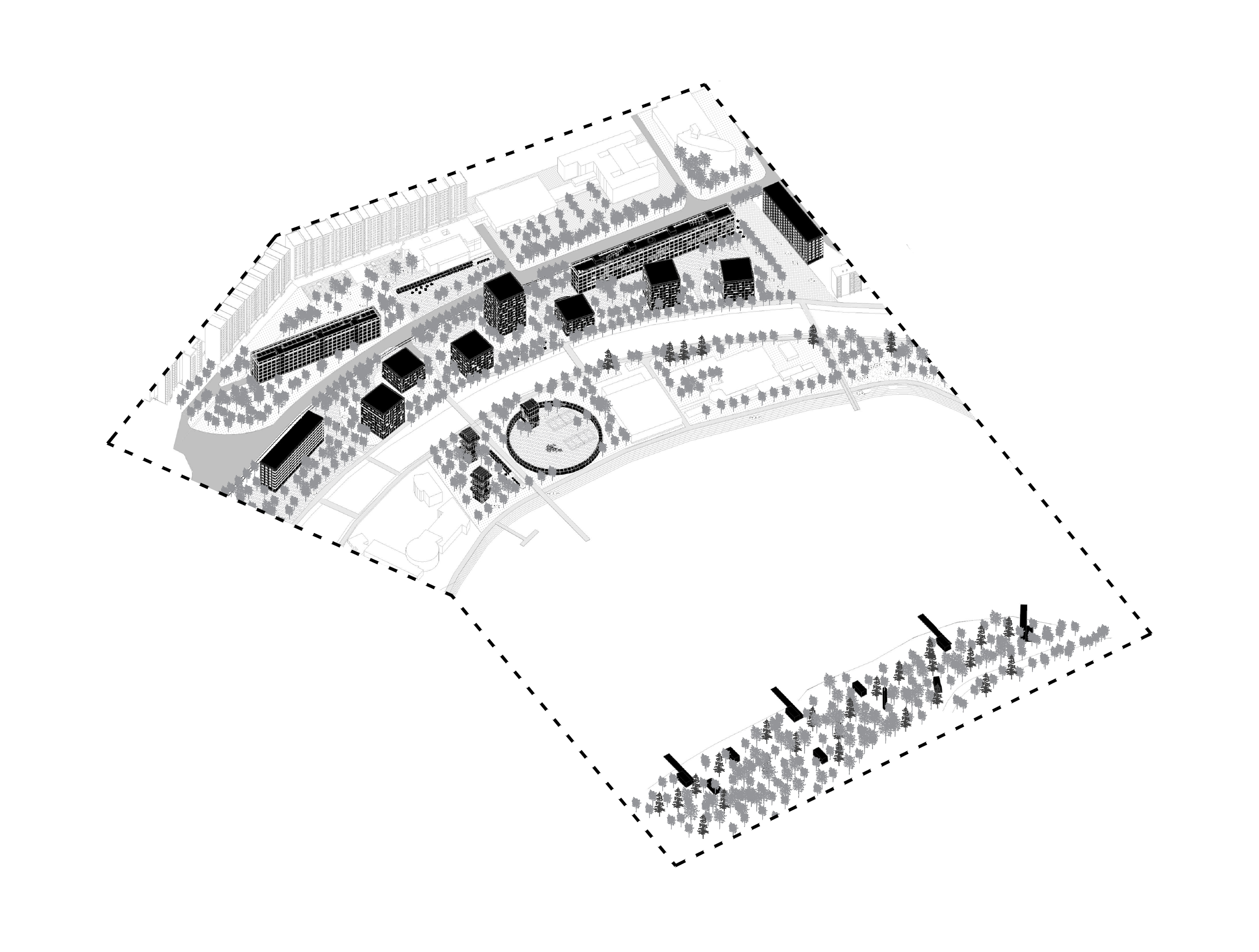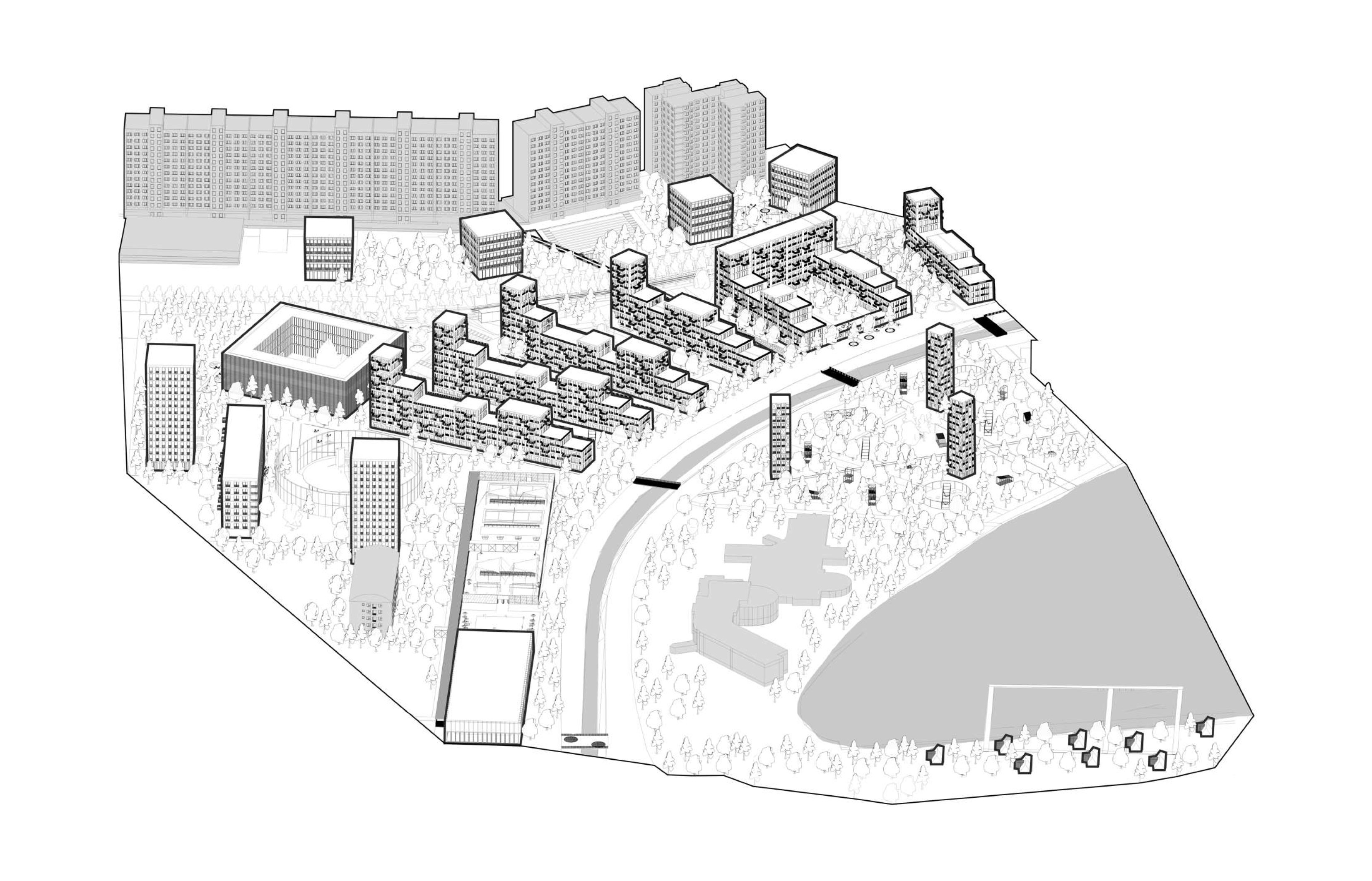 Pôvodná zástavba primárne obytnej štruktúry svojou priestorovou veľkorysosťou dovoľuje vytvárať a vkladať nové hmoty a prostredia - rešpektujúce svoje okolie, ale zároveň tvarovo unikátne, ktoré svojou prítomnosťou a funkciami prinášajú nové možnosti a kvality a zároveň oživujú duch pôvodnej koncepcie mestskej časti.