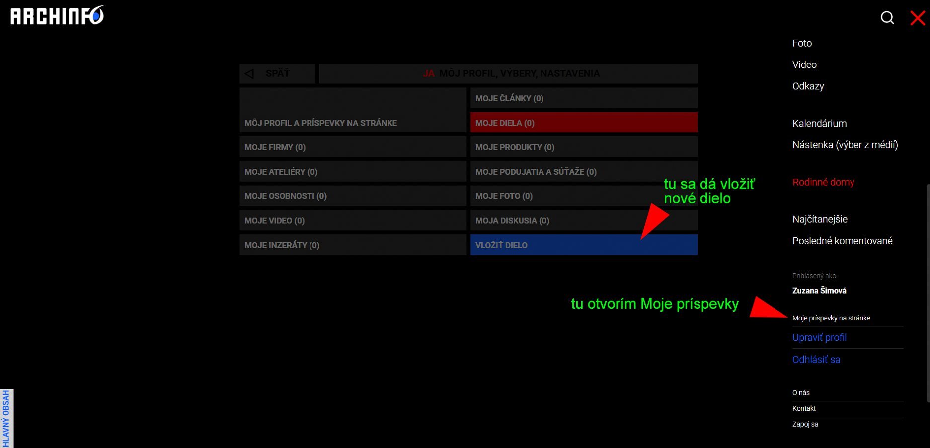 Po zaregistrovaní (prihlásení sa na stránku) môžete pridávať do portfólia aj svoje diela. Všetky vložené práce sa objavia pod profesionálnym profilom osobnosti v rubrike ĽUDIA. V rubrike DIELA budú zobrazené vybrané práce, podľa doporučenia redakčného kruhu. Svoje práce môžete vkladať cez rubriku "Moje príspevky na stránke" v pravom rozbaľovacom menu dole.