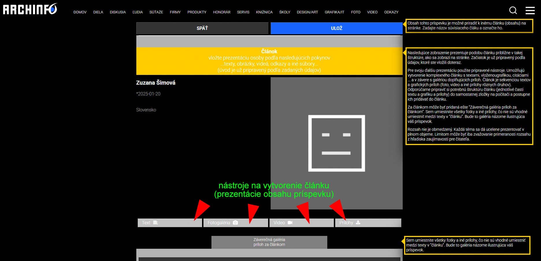 V závere sa zobrazí predbežná podoba "článku", s už zadanými údajmi z predcházajúceho formulára. Tento nástroj môžete použiť na plnohodnotnú prezentáciu diela. (V takejto podobe je k dispozícii aj v ostatných rubrikách a budete sa s ním stále stretávať). Formulár "článok" umožňuje vytváranie obsahu bez obmedzenia rozsahu. Je to vlastne ľubovoľná sekvencia textov a iných (najmä grafických) príloh vložených medzi jednotlivé časti textu. Môžete pridávať fotky (viacero fotiek – fotogalérie), videá, prípadne iné prílohy (.PDF, .HTML,... prípadne iné súbory na stiahnutie).
