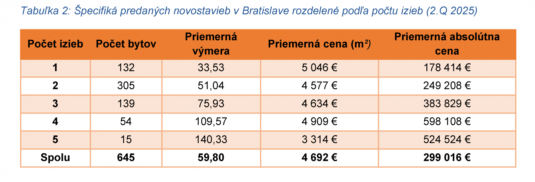 Dvojizbové byty si aj po raste celkového predaja udržali status najžiadanejšej dispozície s podielom 47 %. Na druhom a treťom mieste bol záujem o trojizbové (21,55 %) a jednoizbové (20,47 %) byty. Kupujúci zaplatili za kúpu nového bytu v druhom štvrťroku v priemere 299-tisíc eur. Tento priemer je v porovnaní s prvým štvrťrokom vyšší až o 9,6 %, a to najmä v dôsledku už spomínaného nárastu podlahovej plochy dopytovaných bytov, ako aj priebežného úbytku lacnejších jednotiek.
