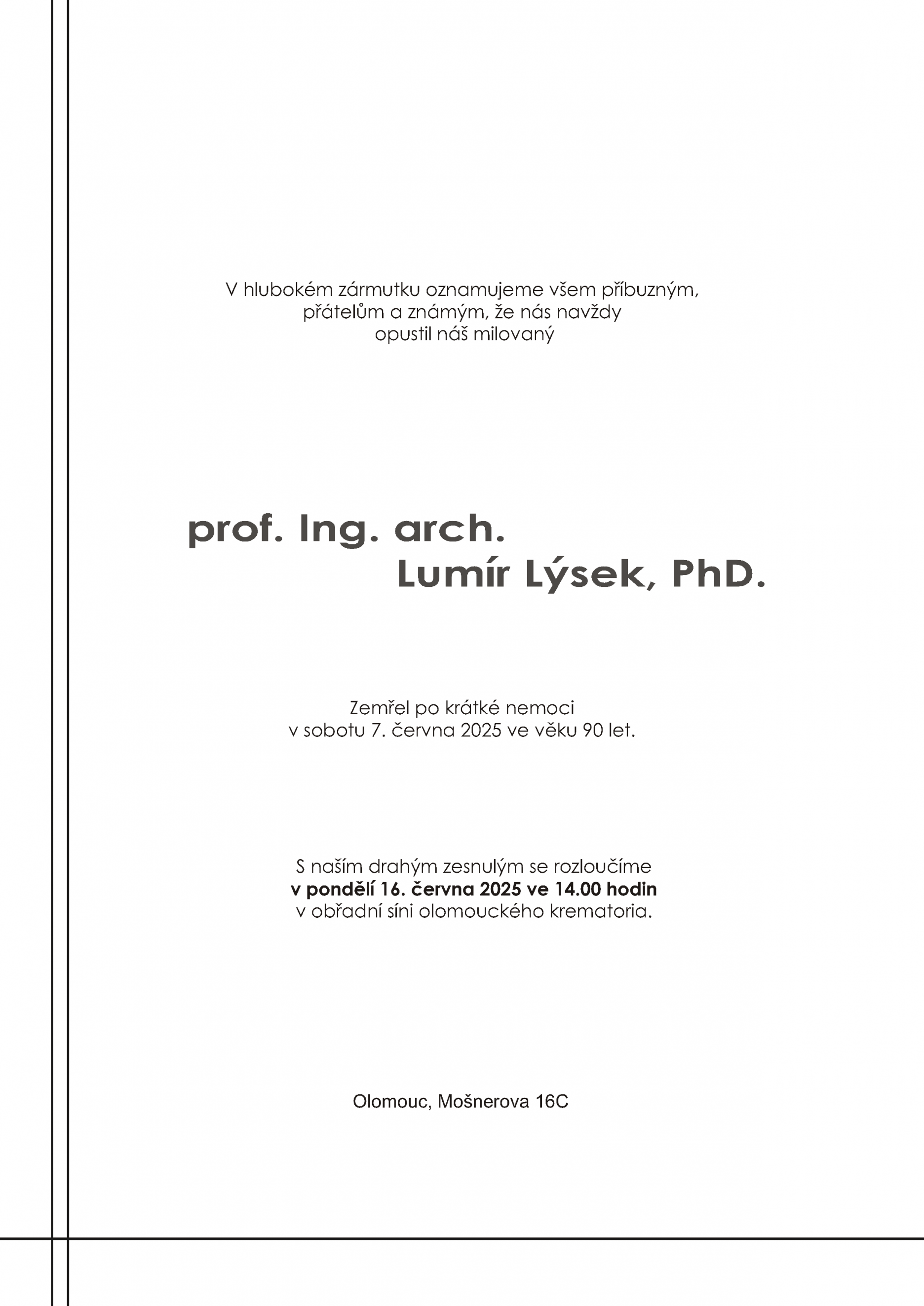 Práce archiktekta spočívá především v systematizaci poznatků a v jejich přetavení do nového řešení. Když ale začnu přemýšlat nad prázdným archem papíru s roztřepaným okrajem, nikdy se mi nepodaří dobrat do kýženého cíle. I takto si pamatuji na pana profesora, který mě v 5.ročníku přivedl ke státnicím.