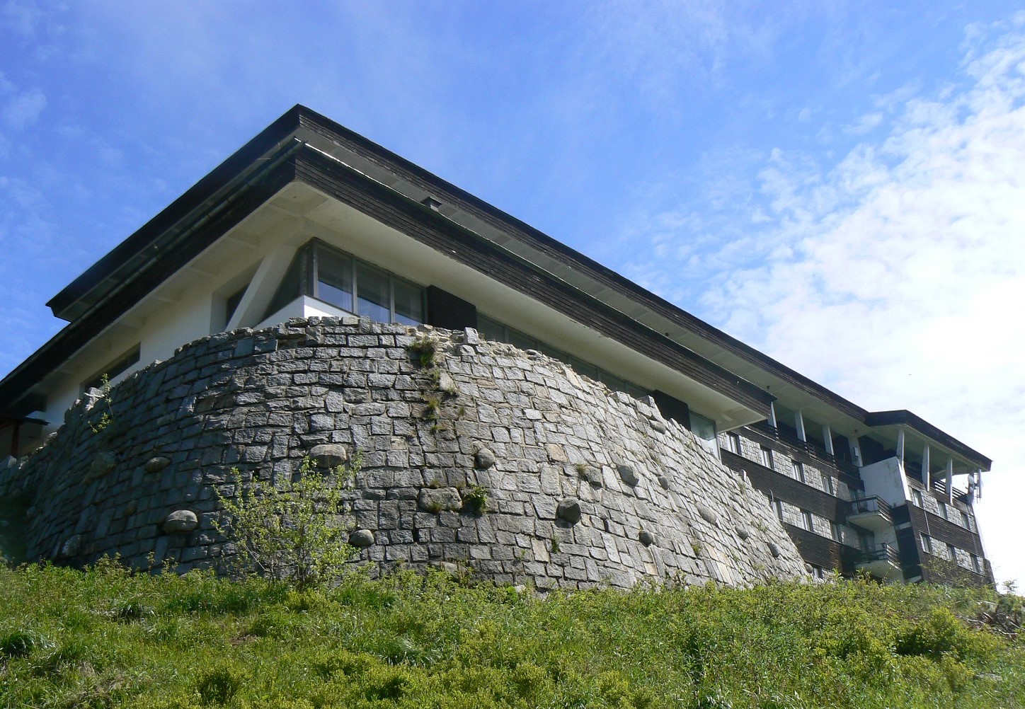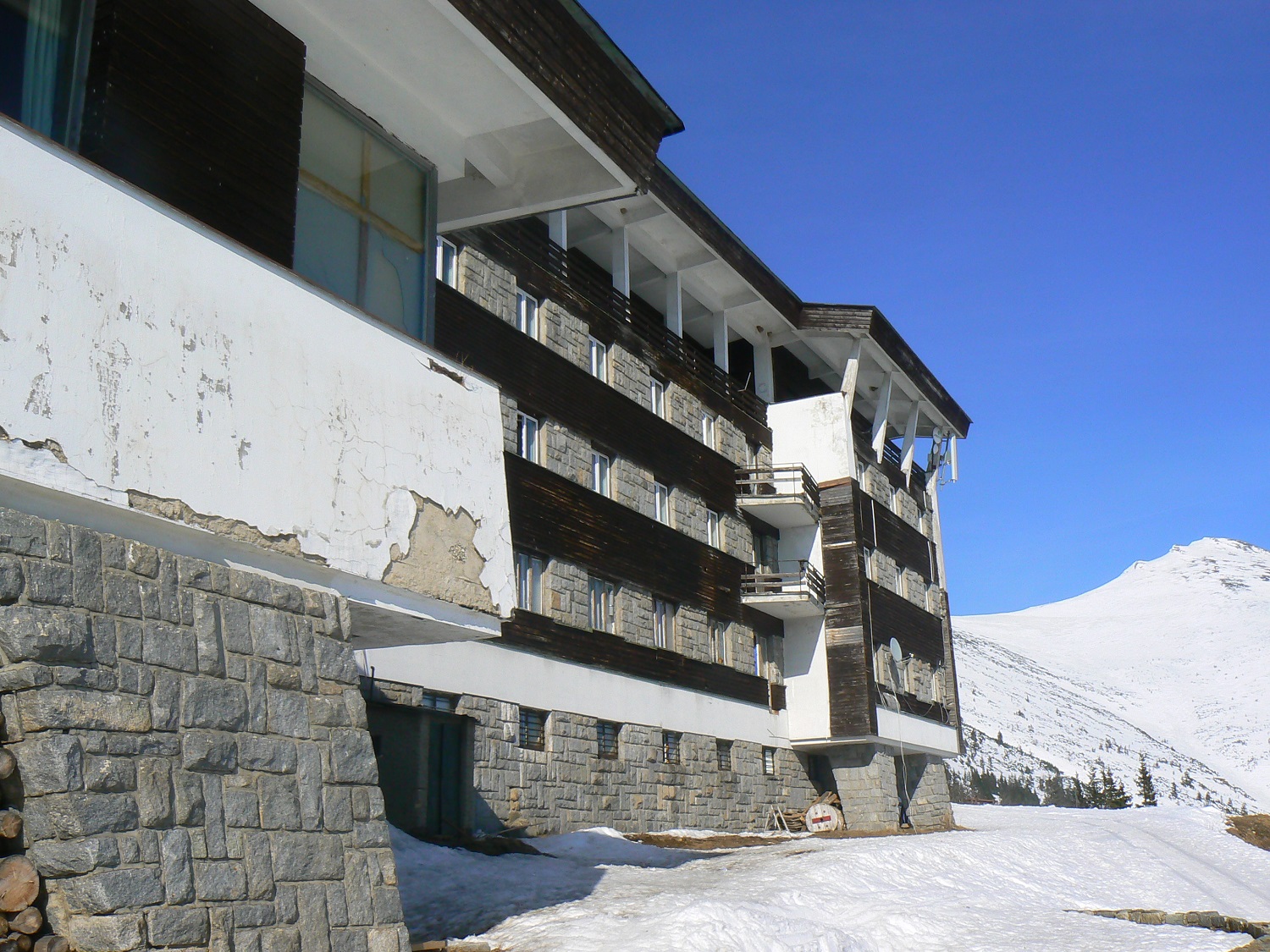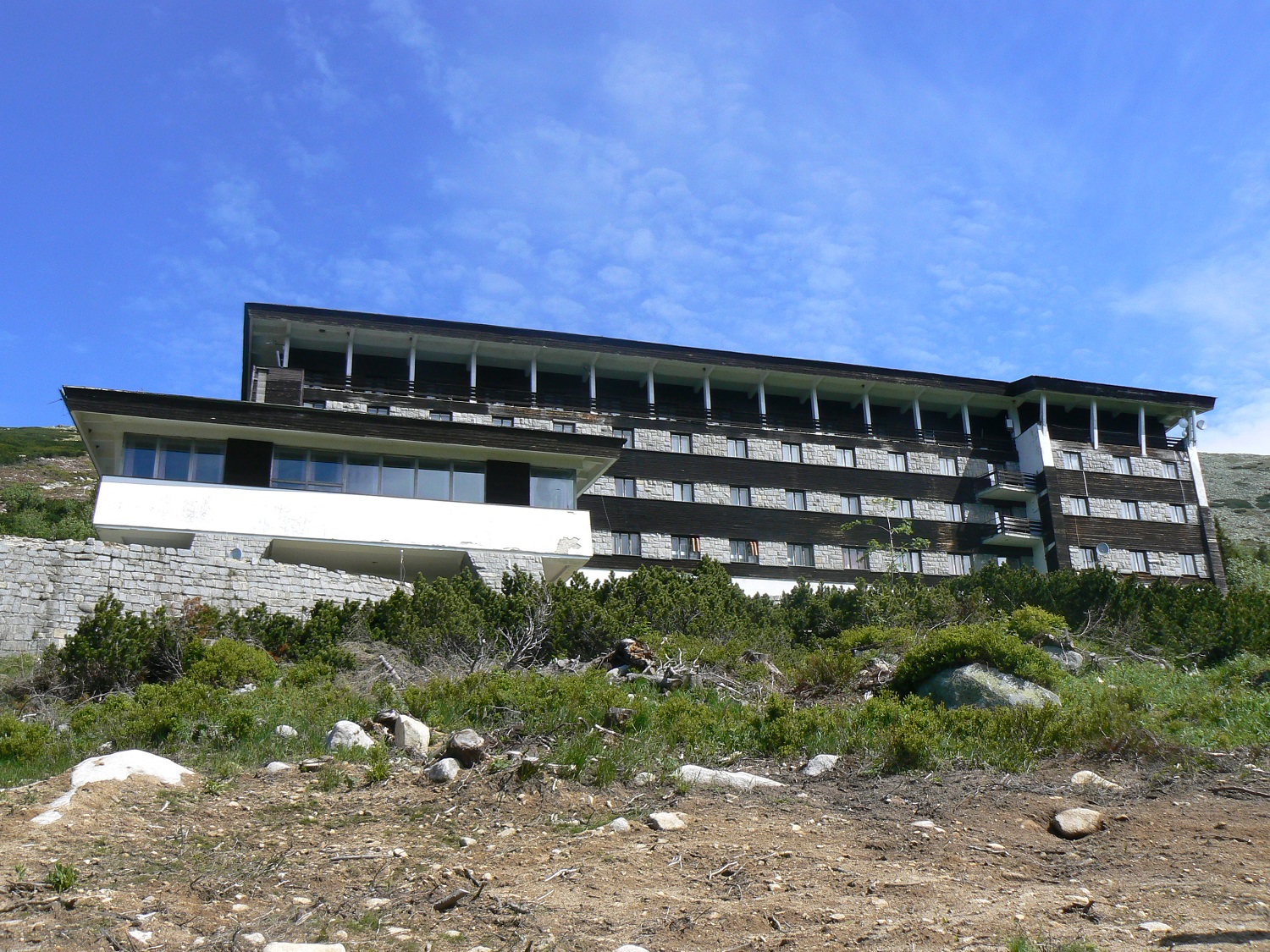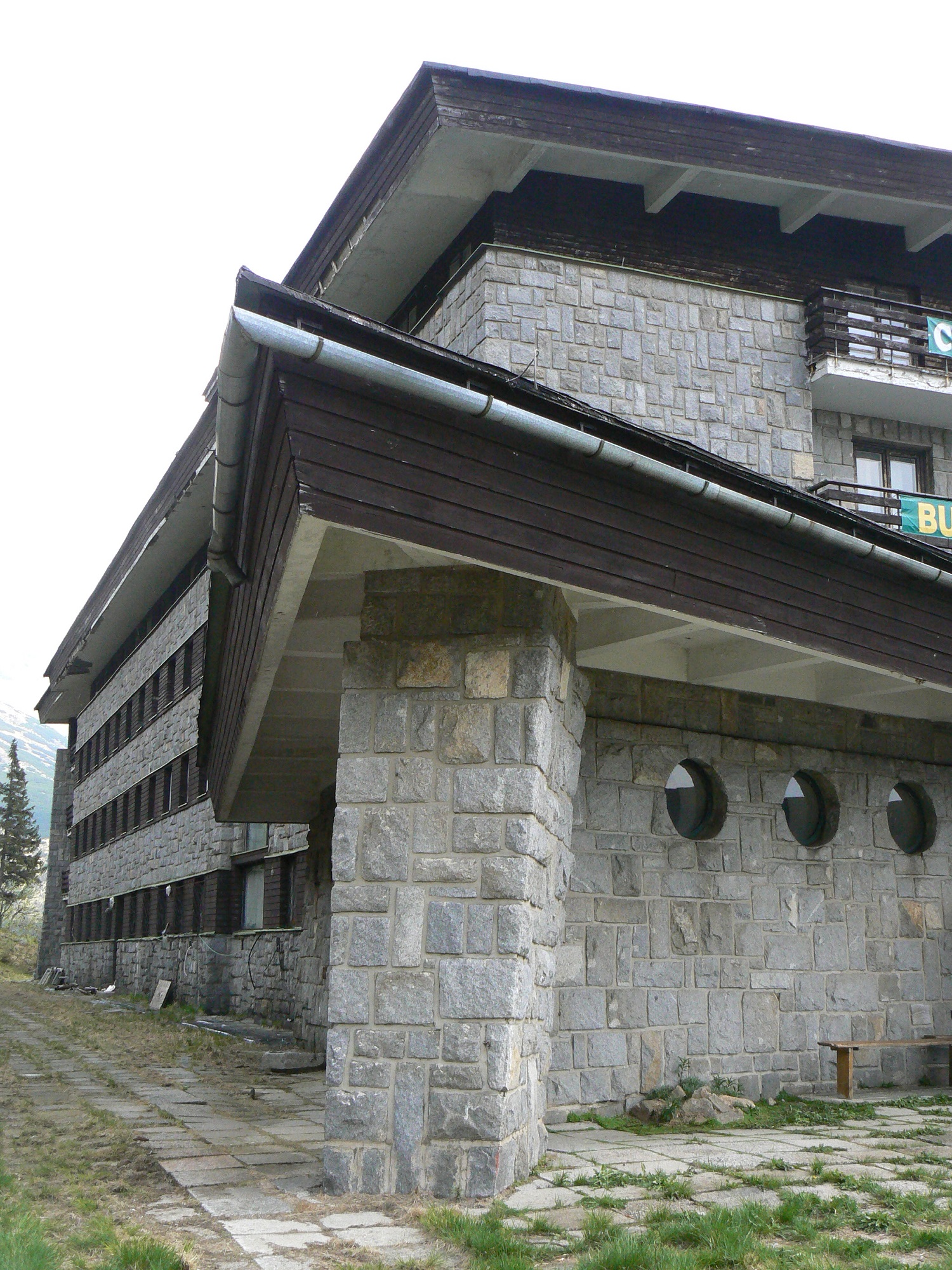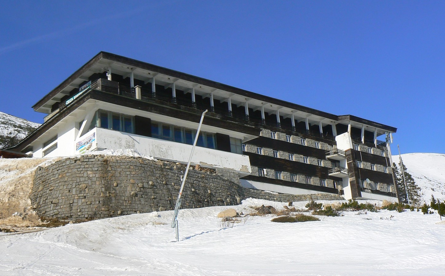 Stavbu dotvárajú dômyselne vystavané zakrivené kamenné oporné múry. Zaujímavé je osadenie časti stavby na pilieroch so šikmým prierezom, ktoré prebiehajú ďalej do sokla. Spolu s ním tvoria elegantnú podnož stavby. Šikmé piliere sú dotvorené kamennou bosážou a harmonizujú s okolím kamenných morén a spomenutej kosodreviny. Bosáž sa objavuje aj v nárožiach stavby, alebo medzi okennými pásmi, ktoré sú tvorené dreveným obkladom. Farebne je objekt rozihraný v odtieňoch bielej, tmavohnedej a sivej, čo spôsobuje pri niektorých pohľadoch nenápadné splynutie stavby s prostredím. Najviac je to citeľné v zimnom období. Zaujme aj riešenie strechy. Strešná konštrukcia je podchytávaná šikmými železobetónovými piliermi, čo podporuje výraznú dynamiku stavby. Ďaľším podobným detailom je nadčasovo riešené pásové okno na západnej stene reštaurácie, takisto so šikmým železobetónovým prekladom.