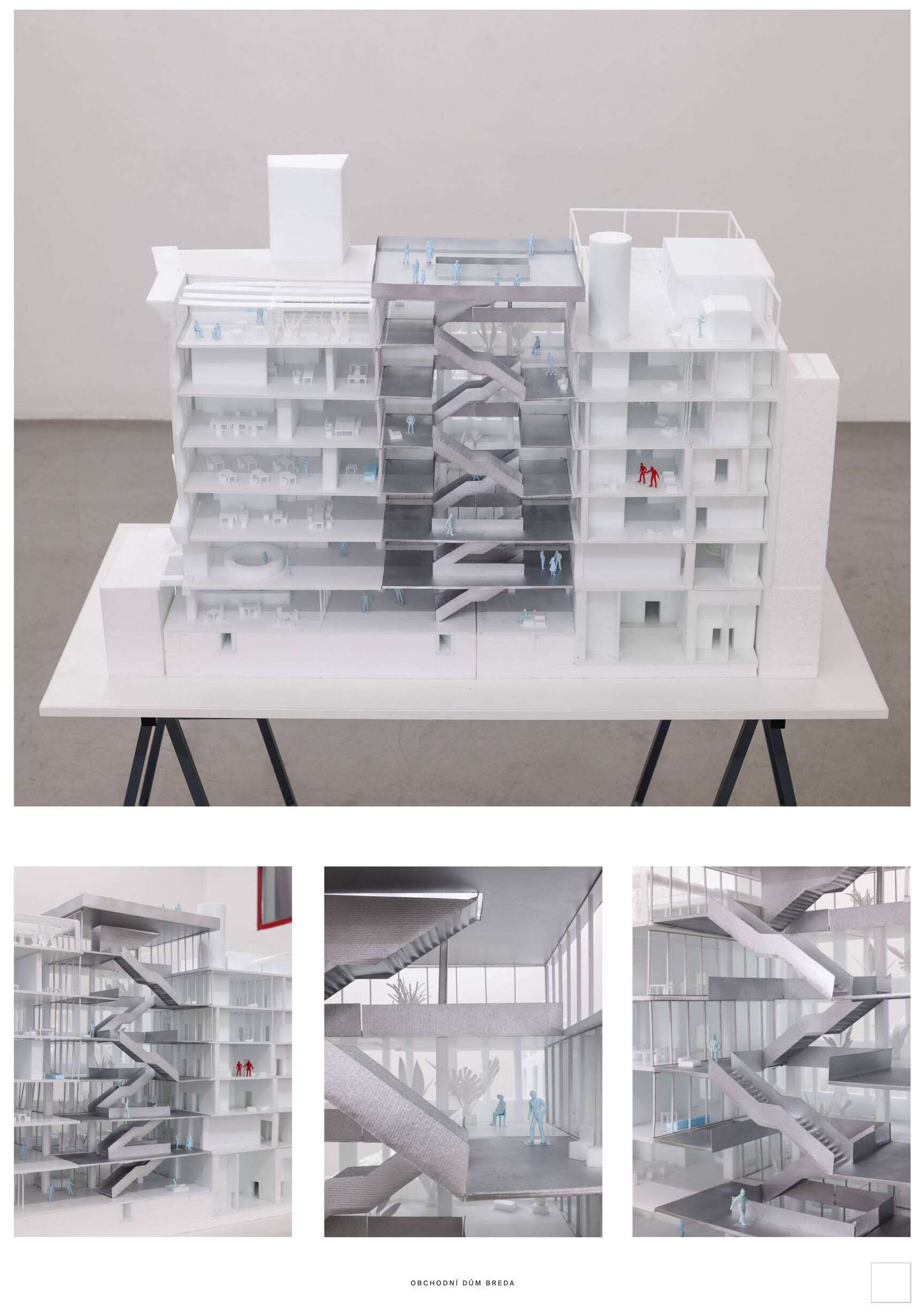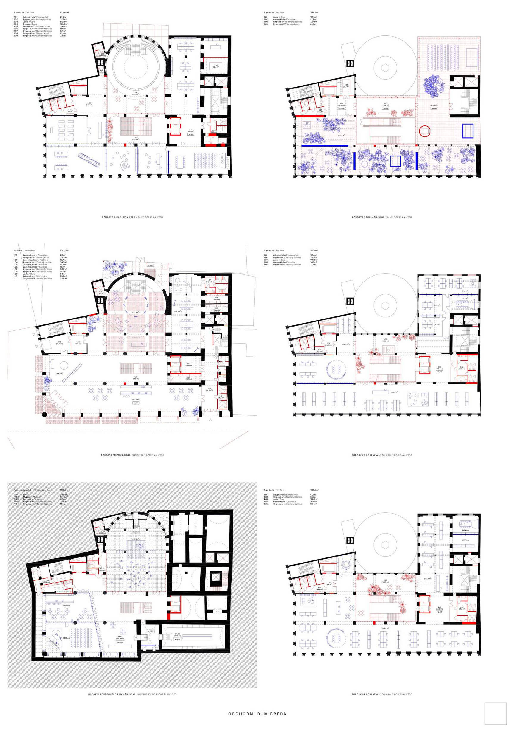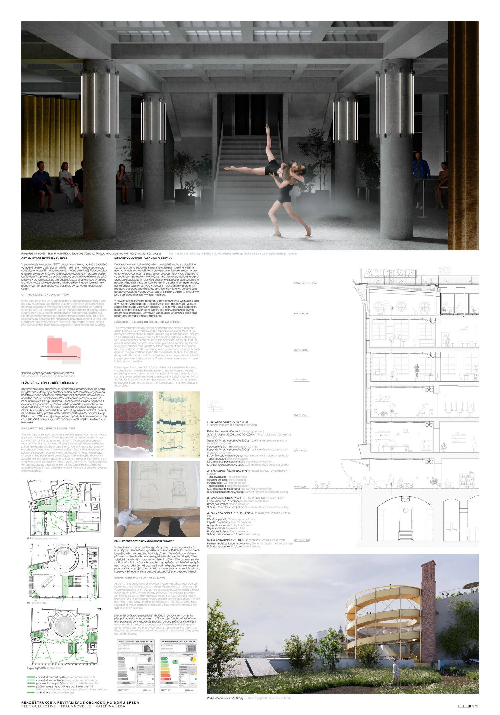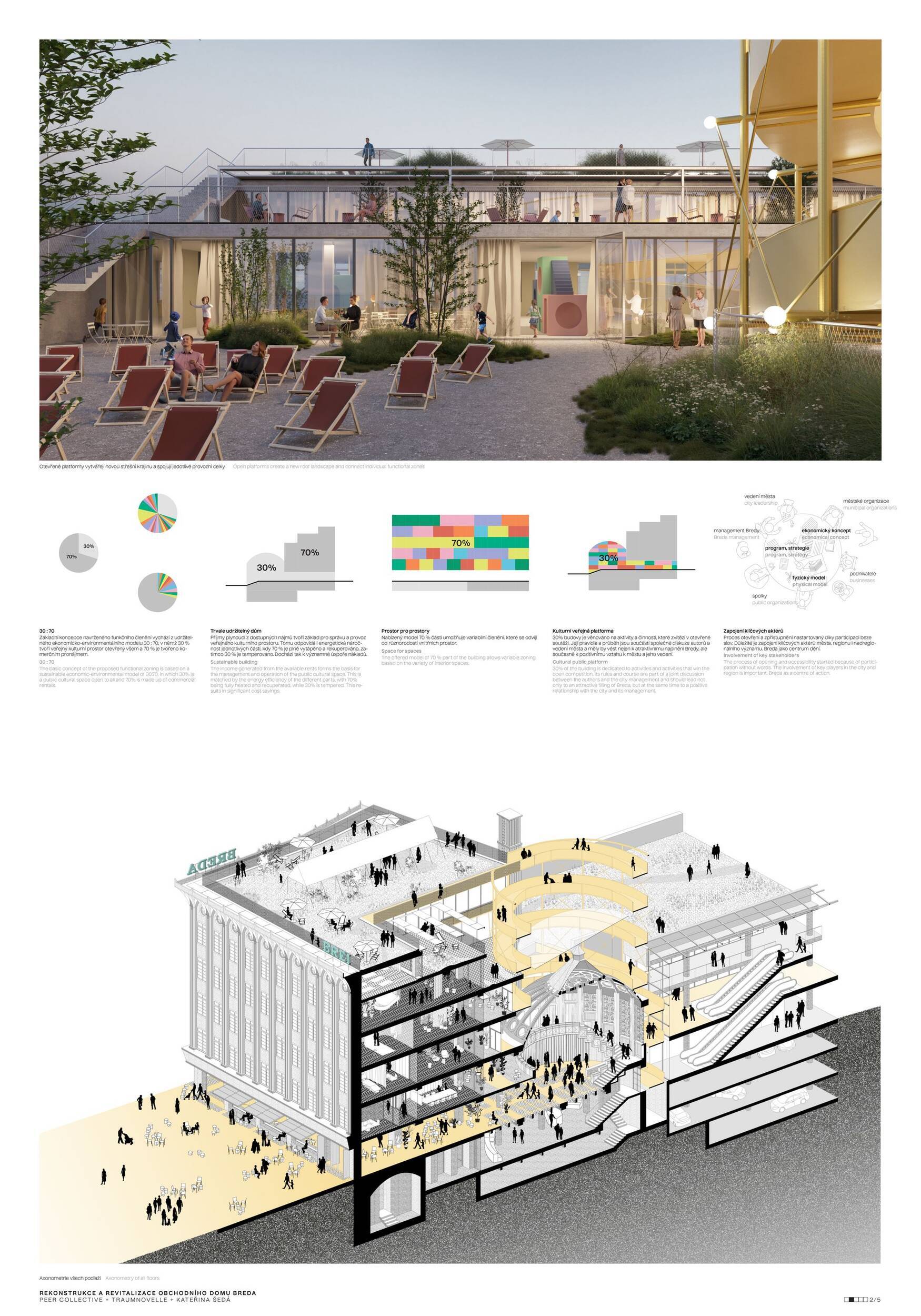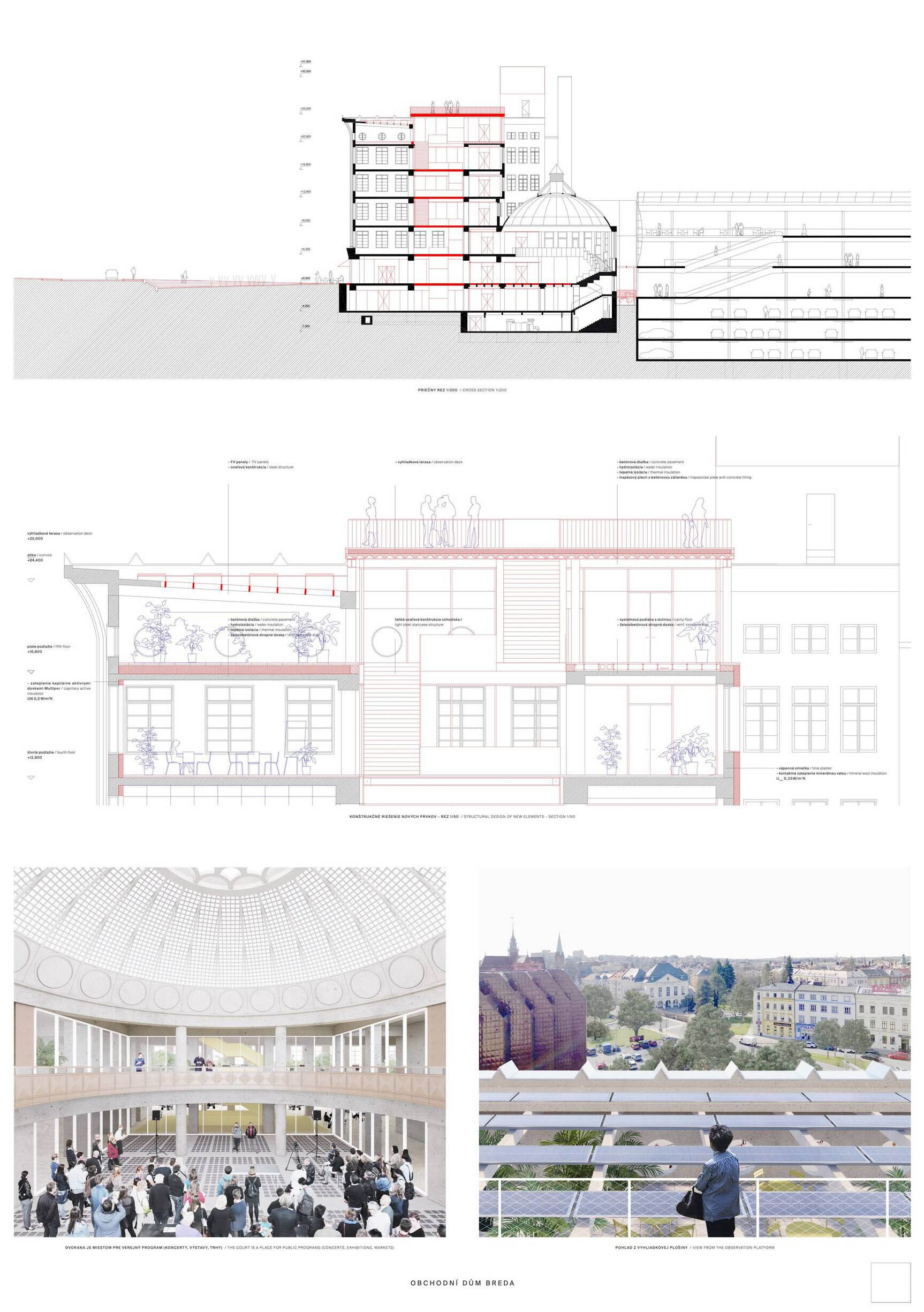 Emblematický charakter obchodního domu Breda je zdůrazněn aktivací soklu a římsy. Inspirováni historickými obrazy bývalého obchodního centra navrženými Leopoldem Bauerem navrhujeme současnou reinterpretaci dnes chybějících markýz. Vitrína z lehké kovové konstrukce, která se otevírá do nového náměstí a stíní tak posedavý parapet. Pro střechu navrhujeme jednoduchou lehkou konstrukci – pergolu, která by dala signál městu a lákala lidi, aby vystoupali budovou a objevili nový pohled na Opavu. V dalším měřítku je místo také křižovatkou mezi bývalým obchodním domem a novým nákupním centrem, které bylo postaveno za ním. V současné době je spojení mezi těmito dvěma subjekty velmi slabé nebo dokonce nulové. Domníváme se, že nová točitá rampa napříč Starou a Novou Bredou je klíčovým bodem projektu a obě budovy budou těžit z nové synergie, která vznikne díky silnějšímu propojení. Kupole navržená Bauerem v roce 1930 pro nás představuje jasnou příležitost k vytvoření cirkulace veřejnosti kolem její specifické geometrie. Veřejná promenáda je tak obohacena o částečně exteriérovou rampu, která provází návštěvníky ve všech patrech obou budov až k novým střechám. Tím, že prostor kupole získal tuto novou funkci, stává se srdcem projektu, jako tomu bylo v době, kdy budova byla nákupním domem (vánoční strom pod kupolí). “Jde o to nikdy věci nebourat, neubírat z nich ani je nenahrazovat, ale vždy jim přidávat, přetvářet a používat“ (Lacaton Vassal). Náš projekt sleduje tento přístup založený na co nejpřesnější diagnostice po analýze stavebně historického průzkumu a naši návštěvě na místě s cílem odhalit kvality a využití toho, co už tam je, namísto nahrazování nebo předělávání. Obchodní dům Breda chápeme archeologickým způsobem, tedy kumulací struktur, které se mohou stát živým svědectvím vývoje budovy. Náš návrh je další přidanou vrstvou, která koexistuje se všemi ostatními. Prohloubením výzkumu Bauerova archivu ve vídeňském muzeu Albertina a v opavském archivu jsme objevili velmi inspirativní dokumenty původních kreseb Leopolda Bauera s několika nerealizovanými architektonickými záměry. Projekt organicky přetváří některé části stávající budovy podle těchto předchozích představ jejich reinterpretací. Například realizace skleněného stropu v prvním suterénu, půlkruhová zadní fasáda kolem kupole, diagonální osa přes přízemí, vitríny jako příčky a výlohy současně. Vymezenými a přesnými zásahy projekt využívá stávajících kvalit a celkové organizace místa jako výchozího bodu pro naše programové úvahy. Na základě těchto kvalit se snaží reagovat na následující úkoly: převést program do mnohonásobného a zároveň praktického uspořádání, zajistit jasnou orientaci pro všechny uživatele, vytvořit příjemné a udržitelné prostředí a posílit možnosti pro výměny a setkávání.
