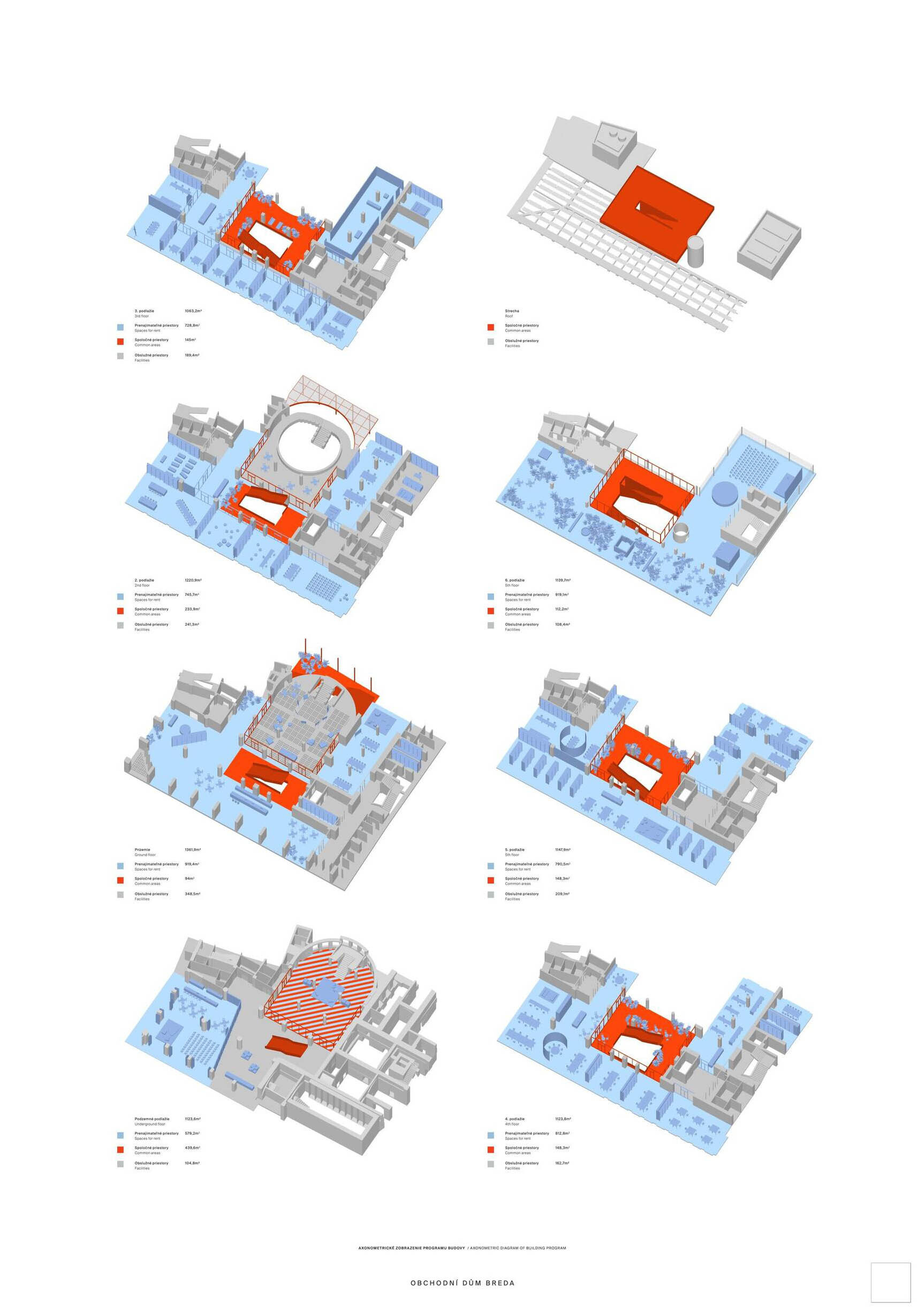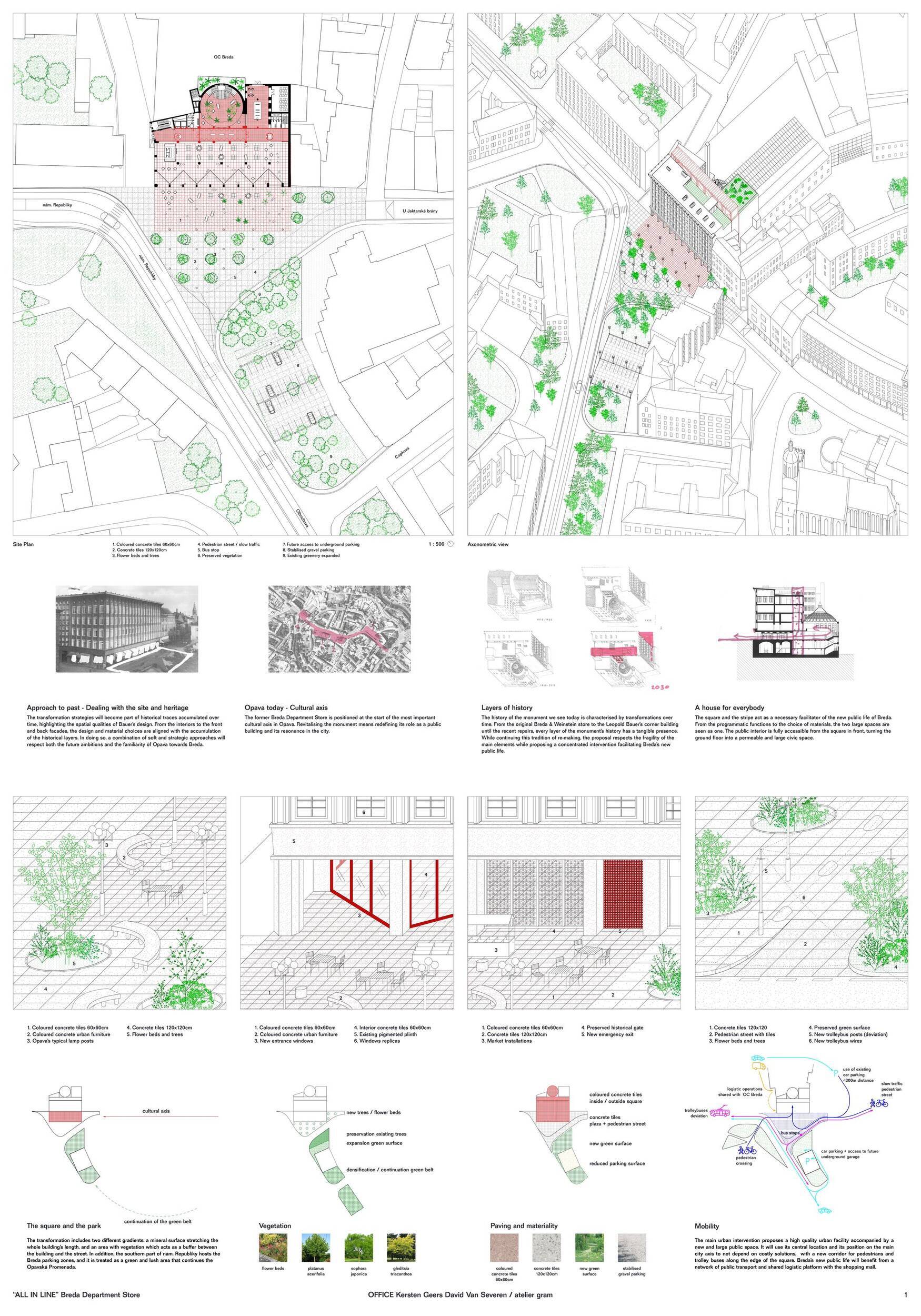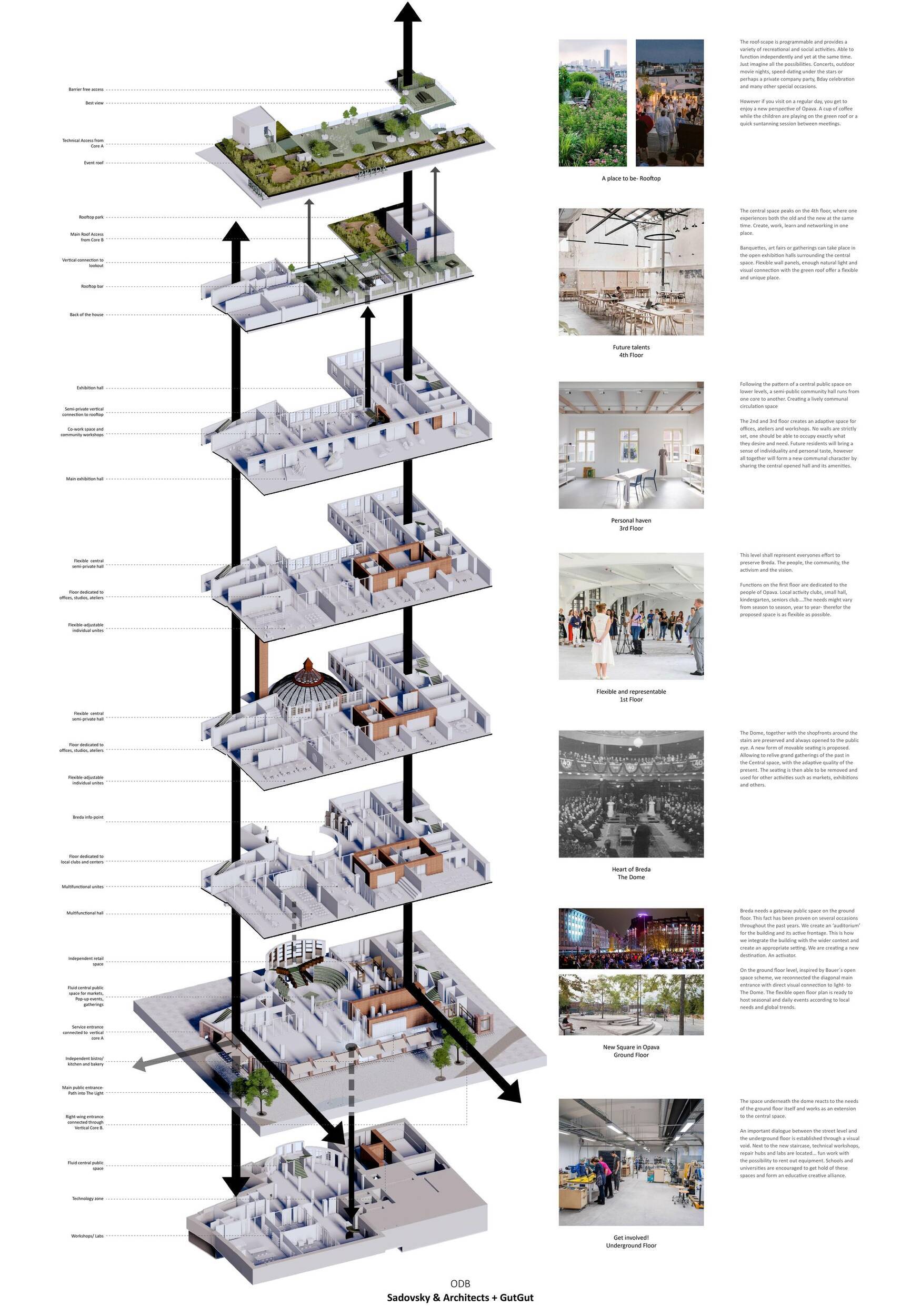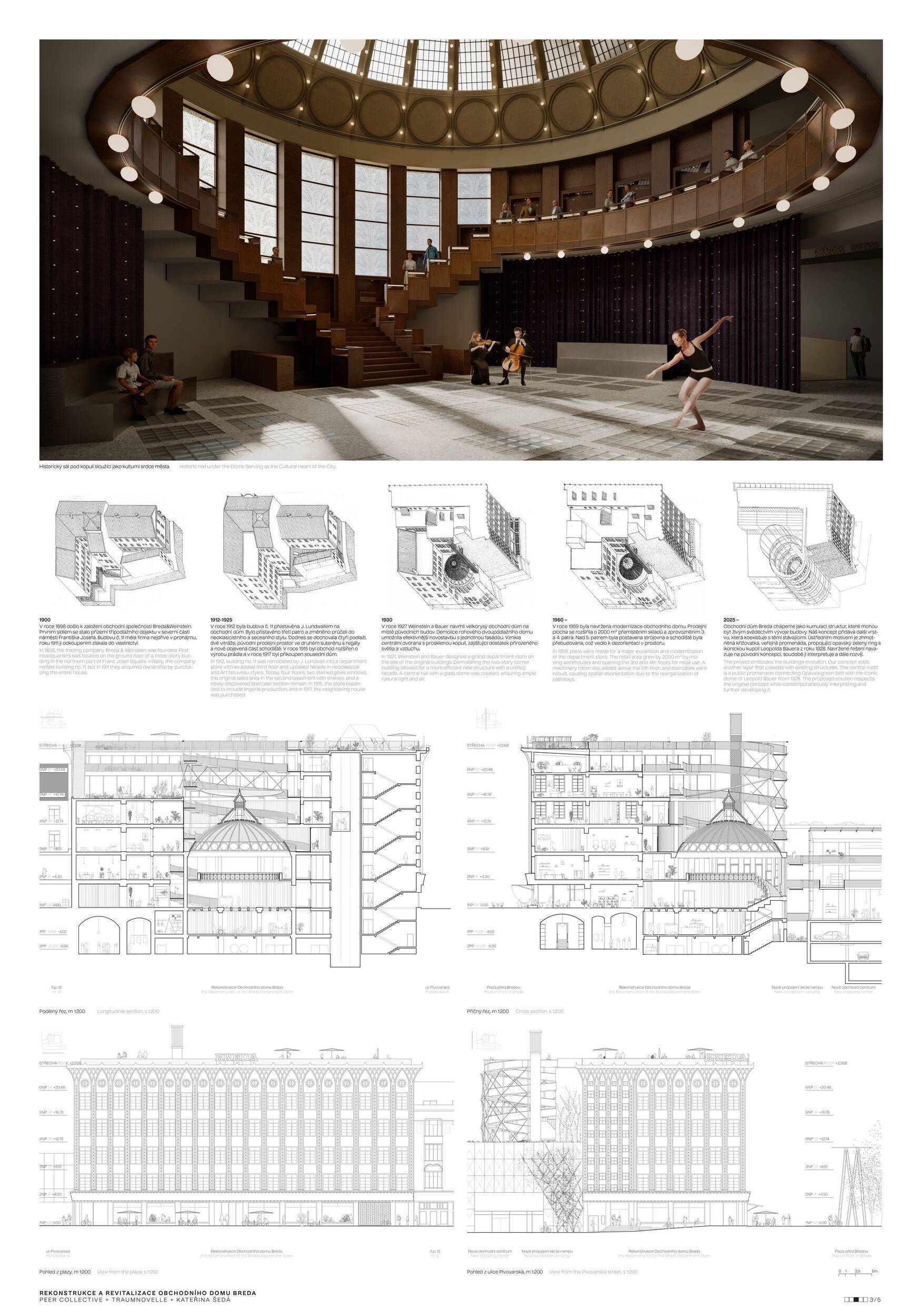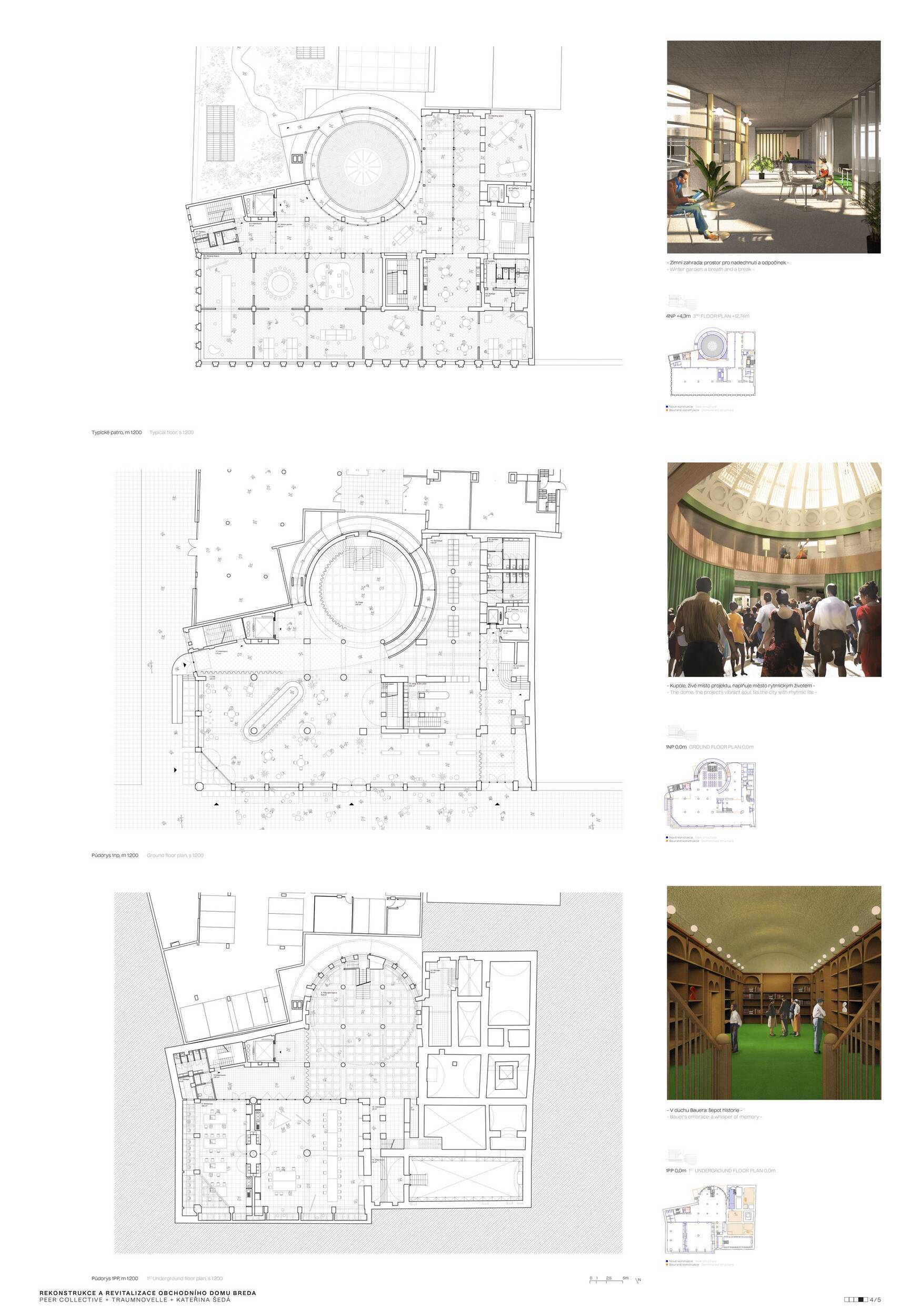 Emblematický charakter obchodního domu Breda je zdůrazněn aktivací soklu a římsy. Inspirováni historickými obrazy bývalého obchodního centra navrženými Leopoldem Bauerem navrhujeme současnou reinterpretaci dnes chybějících markýz. Vitrína z lehké kovové konstrukce, která se otevírá do nového náměstí a stíní tak posedavý parapet. Pro střechu navrhujeme jednoduchou lehkou konstrukci – pergolu, která by dala signál městu a lákala lidi, aby vystoupali budovou a objevili nový pohled na Opavu. V dalším měřítku je místo také křižovatkou mezi bývalým obchodním domem a novým nákupním centrem, které bylo postaveno za ním. V současné době je spojení mezi těmito dvěma subjekty velmi slabé nebo dokonce nulové. Domníváme se, že nová točitá rampa napříč Starou a Novou Bredou je klíčovým bodem projektu a obě budovy budou těžit z nové synergie, která vznikne díky silnějšímu propojení. Kupole navržená Bauerem v roce 1930 pro nás představuje jasnou příležitost k vytvoření cirkulace veřejnosti kolem její specifické geometrie. Veřejná promenáda je tak obohacena o částečně exteriérovou rampu, která provází návštěvníky ve všech patrech obou budov až k novým střechám. Tím, že prostor kupole získal tuto novou funkci, stává se srdcem projektu, jako tomu bylo v době, kdy budova byla nákupním domem (vánoční strom pod kupolí). “Jde o to nikdy věci nebourat, neubírat z nich ani je nenahrazovat, ale vždy jim přidávat, přetvářet a používat“ (Lacaton Vassal). Náš projekt sleduje tento přístup založený na co nejpřesnější diagnostice po analýze stavebně historického průzkumu a naši návštěvě na místě s cílem odhalit kvality a využití toho, co už tam je, namísto nahrazování nebo předělávání. Obchodní dům Breda chápeme archeologickým způsobem, tedy kumulací struktur, které se mohou stát živým svědectvím vývoje budovy. Náš návrh je další přidanou vrstvou, která koexistuje se všemi ostatními. Prohloubením výzkumu Bauerova archivu ve vídeňském muzeu Albertina a v opavském archivu jsme objevili velmi inspirativní dokumenty původních kreseb Leopolda Bauera s několika nerealizovanými architektonickými záměry. Projekt organicky přetváří některé části stávající budovy podle těchto předchozích představ jejich reinterpretací. Například realizace skleněného stropu v prvním suterénu, půlkruhová zadní fasáda kolem kupole, diagonální osa přes přízemí, vitríny jako příčky a výlohy současně. Vymezenými a přesnými zásahy projekt využívá stávajících kvalit a celkové organizace místa jako výchozího bodu pro naše programové úvahy. Na základě těchto kvalit se snaží reagovat na následující úkoly: převést program do mnohonásobného a zároveň praktického uspořádání, zajistit jasnou orientaci pro všechny uživatele, vytvořit příjemné a udržitelné prostředí a posílit možnosti pro výměny a setkávání.