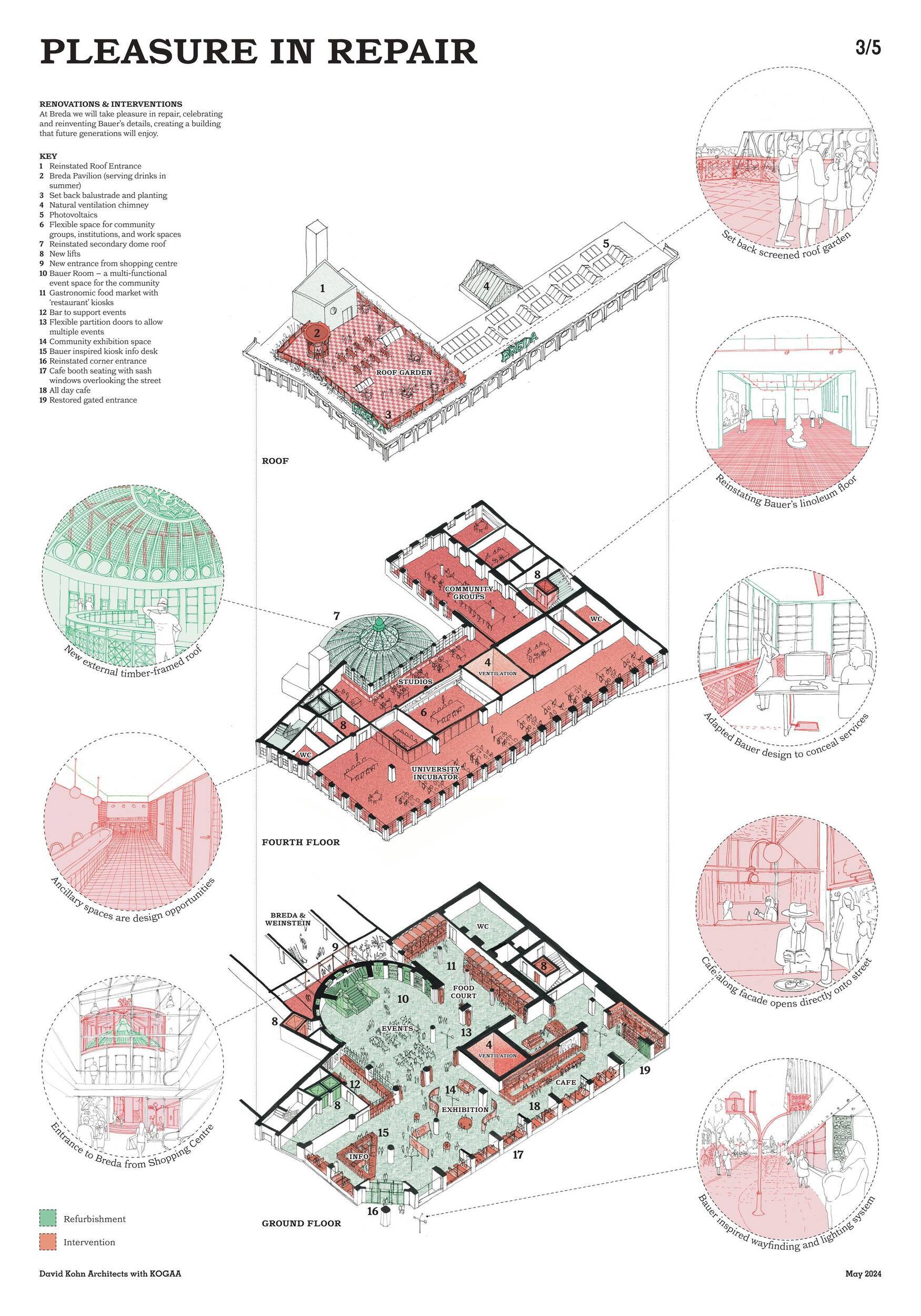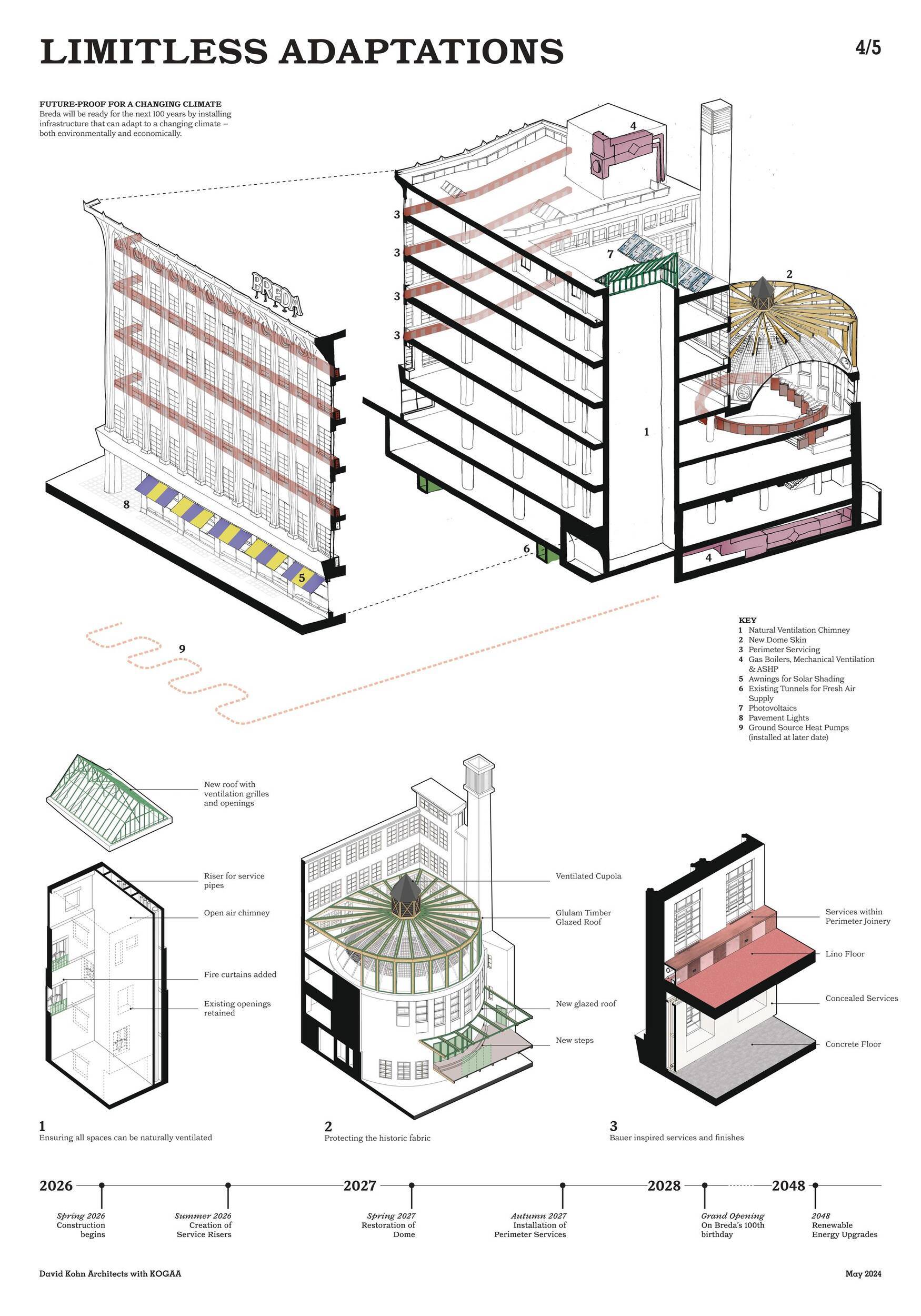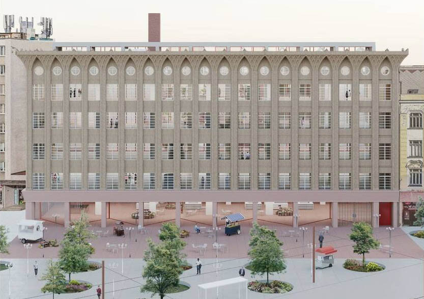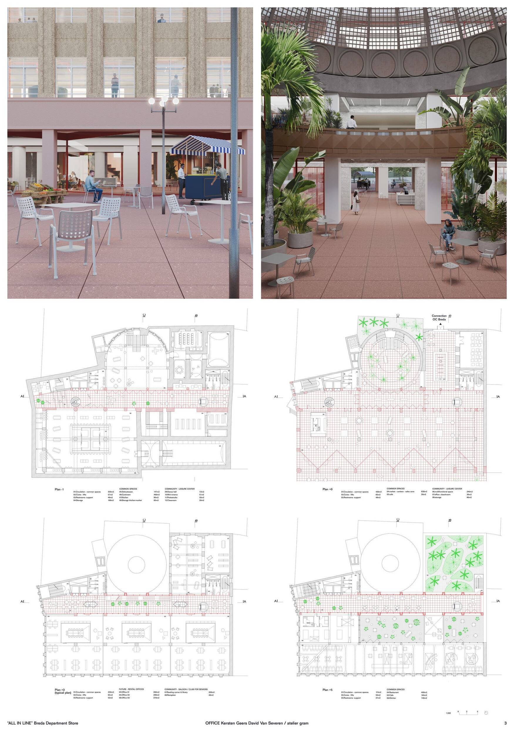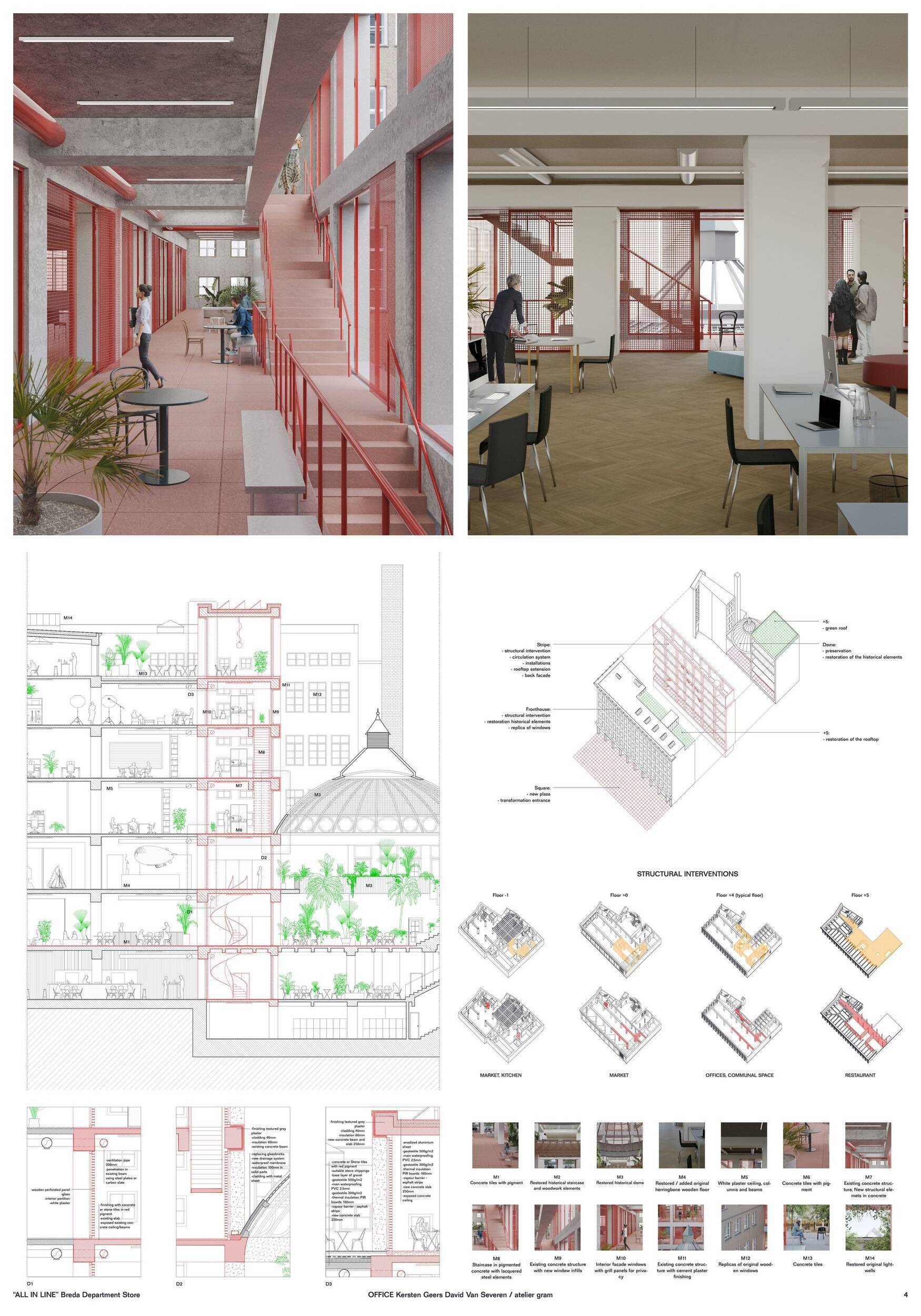 Emblematický charakter obchodního domu Breda je zdůrazněn aktivací soklu a římsy. Inspirováni historickými obrazy bývalého obchodního centra navrženými Leopoldem Bauerem navrhujeme současnou reinterpretaci dnes chybějících markýz. Vitrína z lehké kovové konstrukce, která se otevírá do nového náměstí a stíní tak posedavý parapet. Pro střechu navrhujeme jednoduchou lehkou konstrukci – pergolu, která by dala signál městu a lákala lidi, aby vystoupali budovou a objevili nový pohled na Opavu. V dalším měřítku je místo také křižovatkou mezi bývalým obchodním domem a novým nákupním centrem, které bylo postaveno za ním. V současné době je spojení mezi těmito dvěma subjekty velmi slabé nebo dokonce nulové. Domníváme se, že nová točitá rampa napříč Starou a Novou Bredou je klíčovým bodem projektu a obě budovy budou těžit z nové synergie, která vznikne díky silnějšímu propojení. Kupole navržená Bauerem v roce 1930 pro nás představuje jasnou příležitost k vytvoření cirkulace veřejnosti kolem její specifické geometrie. Veřejná promenáda je tak obohacena o částečně exteriérovou rampu, která provází návštěvníky ve všech patrech obou budov až k novým střechám. Tím, že prostor kupole získal tuto novou funkci, stává se srdcem projektu, jako tomu bylo v době, kdy budova byla nákupním domem (vánoční strom pod kupolí). “Jde o to nikdy věci nebourat, neubírat z nich ani je nenahrazovat, ale vždy jim přidávat, přetvářet a používat“ (Lacaton Vassal). Náš projekt sleduje tento přístup založený na co nejpřesnější diagnostice po analýze stavebně historického průzkumu a naši návštěvě na místě s cílem odhalit kvality a využití toho, co už tam je, namísto nahrazování nebo předělávání. Obchodní dům Breda chápeme archeologickým způsobem, tedy kumulací struktur, které se mohou stát živým svědectvím vývoje budovy. Náš návrh je další přidanou vrstvou, která koexistuje se všemi ostatními. Prohloubením výzkumu Bauerova archivu ve vídeňském muzeu Albertina a v opavském archivu jsme objevili velmi inspirativní dokumenty původních kreseb Leopolda Bauera s několika nerealizovanými architektonickými záměry. Projekt organicky přetváří některé části stávající budovy podle těchto předchozích představ jejich reinterpretací. Například realizace skleněného stropu v prvním suterénu, půlkruhová zadní fasáda kolem kupole, diagonální osa přes přízemí, vitríny jako příčky a výlohy současně. Vymezenými a přesnými zásahy projekt využívá stávajících kvalit a celkové organizace místa jako výchozího bodu pro naše programové úvahy. Na základě těchto kvalit se snaží reagovat na následující úkoly: převést program do mnohonásobného a zároveň praktického uspořádání, zajistit jasnou orientaci pro všechny uživatele, vytvořit příjemné a udržitelné prostředí a posílit možnosti pro výměny a setkávání.