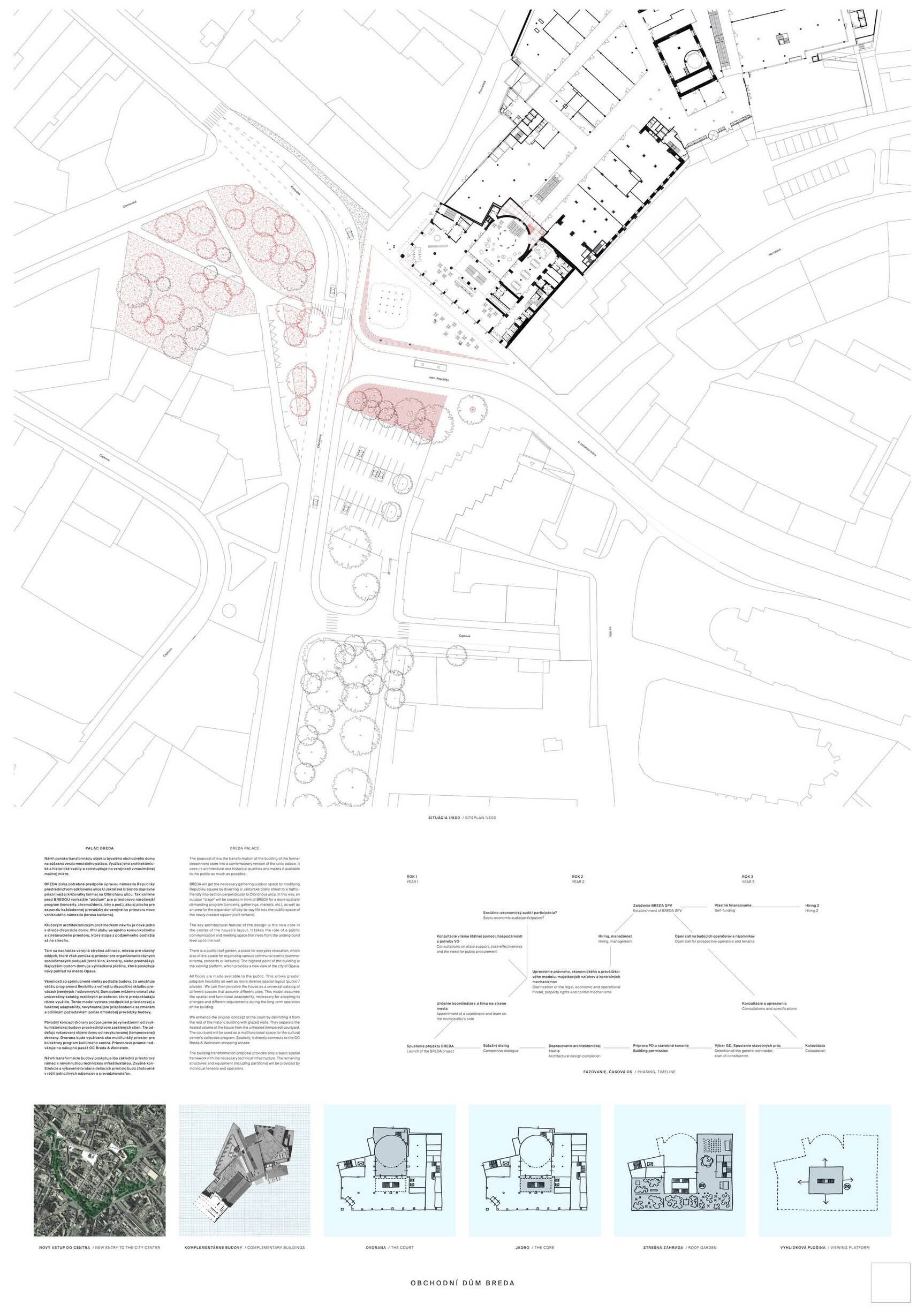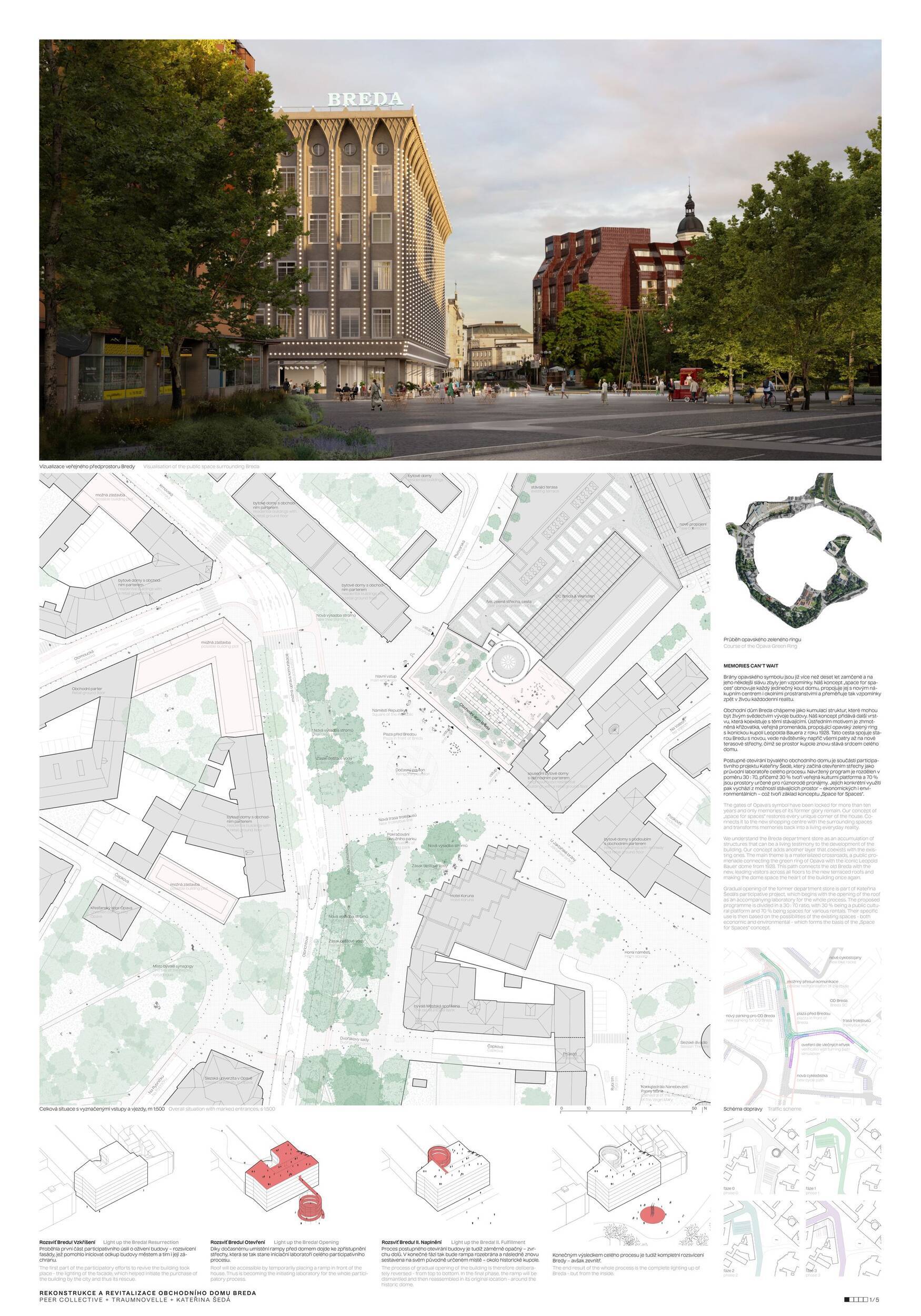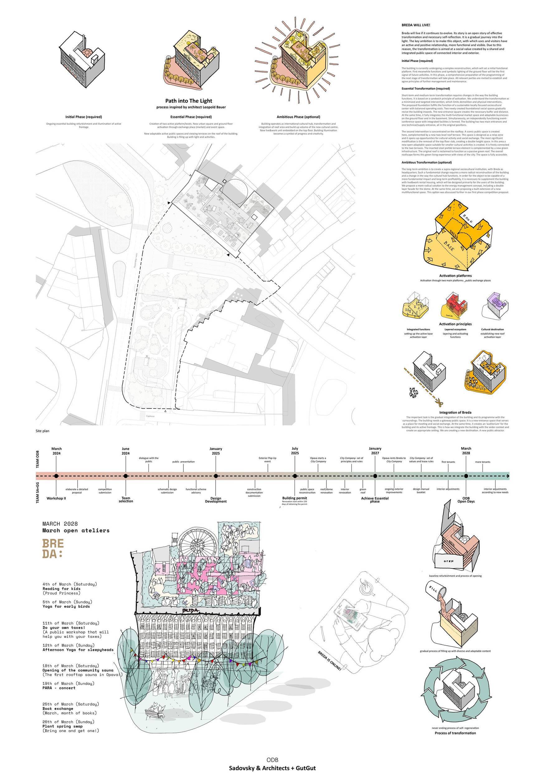 Breda bude žít, pokud se bude dále rozvíjet. Její příběh je otevřeným příběhem účinné transformace a nezbytné sebereflexe. Je to postupná cesta ke světlu. Klíčovou ambicí je učinit tento objekt, k němuž mají uživatelé a návštěvníci aktivní a pozitivní vztah, funkčnějším a viditelnějším. Z tohoto důvodu je transformace zaměřena na společenskou hodnotu, kterou vytváří sdílený a integrovaný veřejný prostor propojeného interiéru a exteriéru. Proces transformace Bredy je podmíněn nejen fyzickou, ale i psychologickou změnou. Proměna opuštěné budovy ve funkční organismus vyžaduje několik fází zásahu a specifikaci dlouhodobých a krátkodobých ambicí. Tento proces chápeme jako samoregenerační proces aktivace, programování rekonstrukce budovy a jejího "naplnění" obsahem. Hierarchie velikosti zásahů do stávající budovy v čase bude vycházet z konkrétních požadavků dalšího rozvoje. Neméně důležitý je proces řízení, správy a technického provozu budovy. Tento proces by měla zastřešit nově založená městská společnost. Ve druhém kole soutěže se náš návrh zaměřuje na počáteční fázi tzv. zásadní transformace. Zásadním motivem je vytvoření dvou aktivačních platforem: v přízemí- na úrovni náměstí, prostřednictvím kterých integrujeme město, a za druhé na aktivní střeše, ze které pozorujeme město. Vnitřek budovy je otevřený a flexibilní, připravený k pronájmu pro aktivity, které mohou fungovat v komunitním propojeném ekosystému. Sociokulturní funkce je přidanou hodnotou.