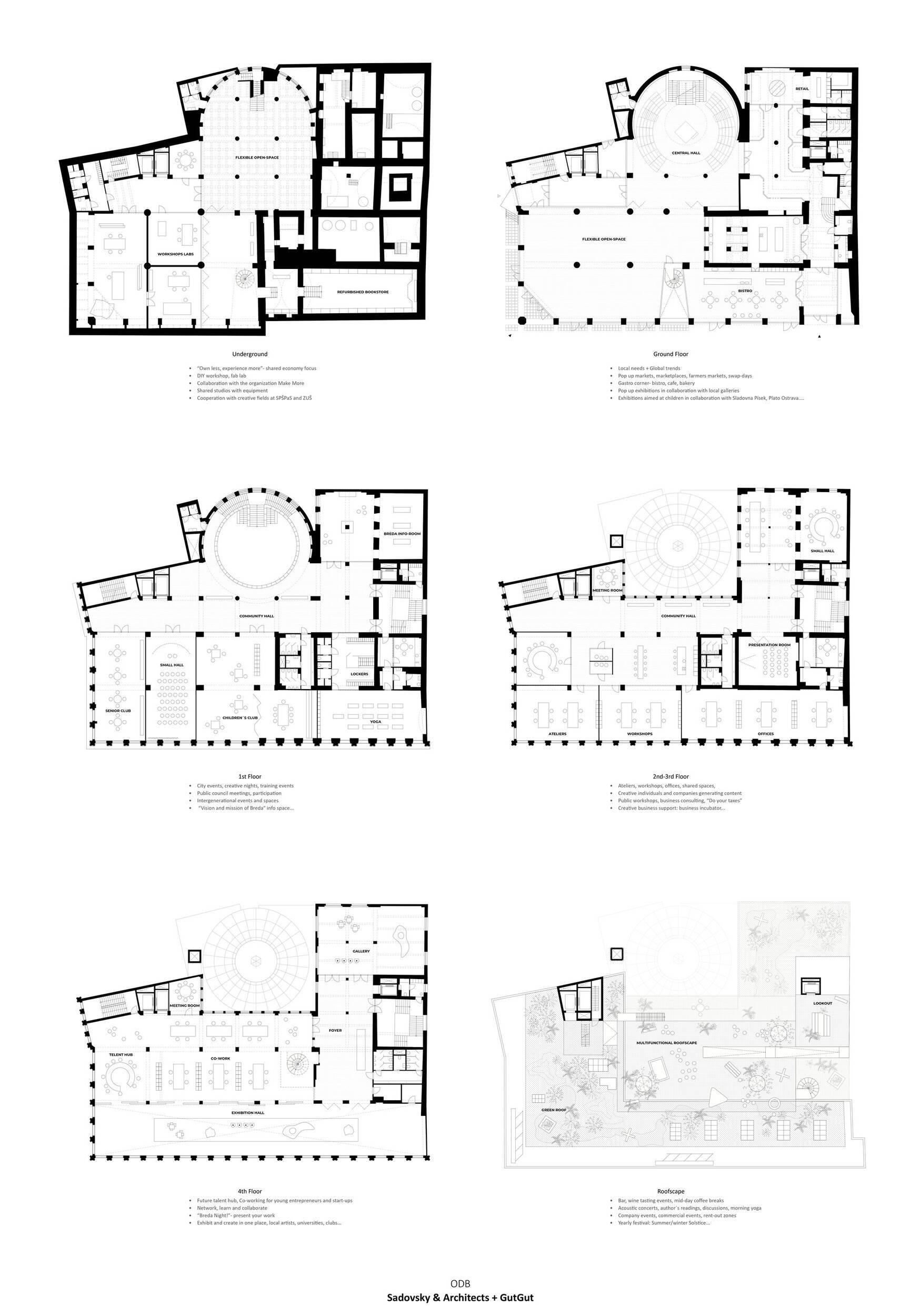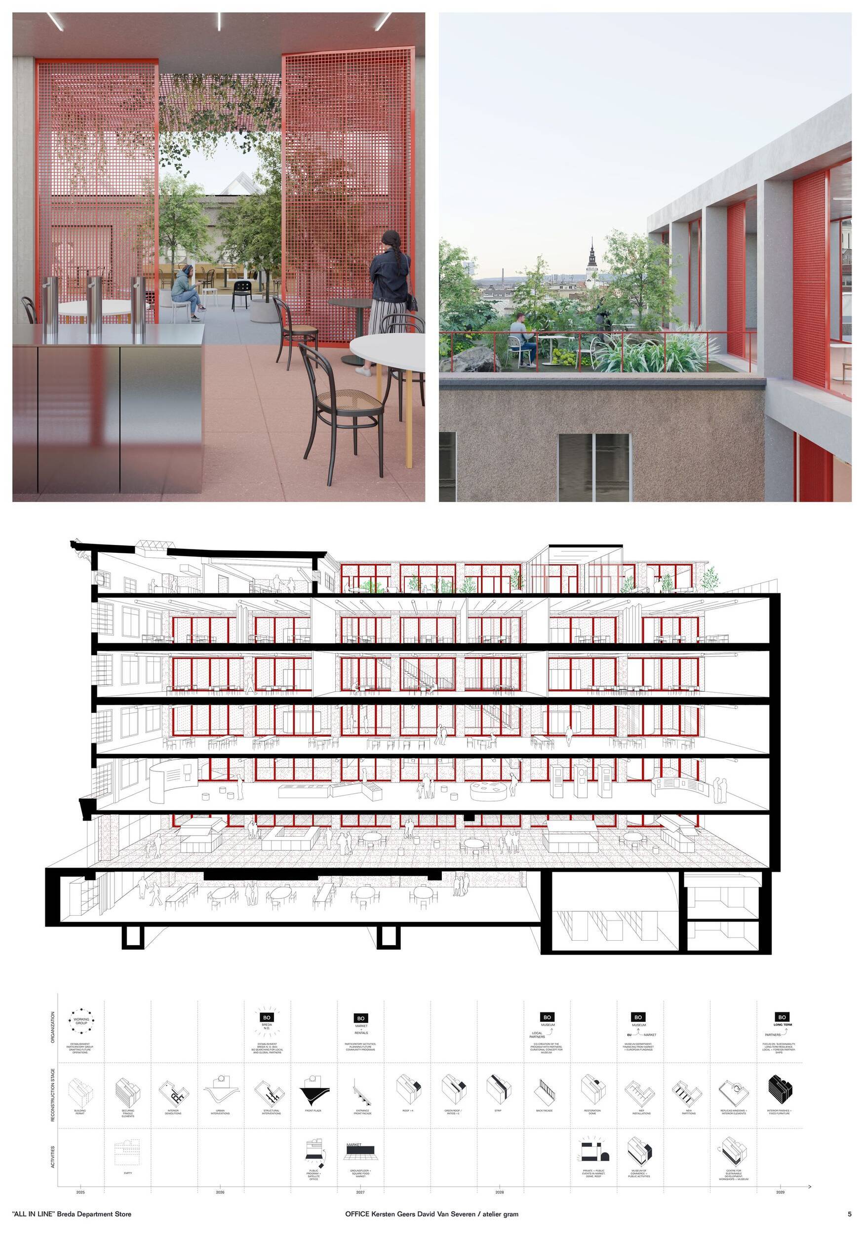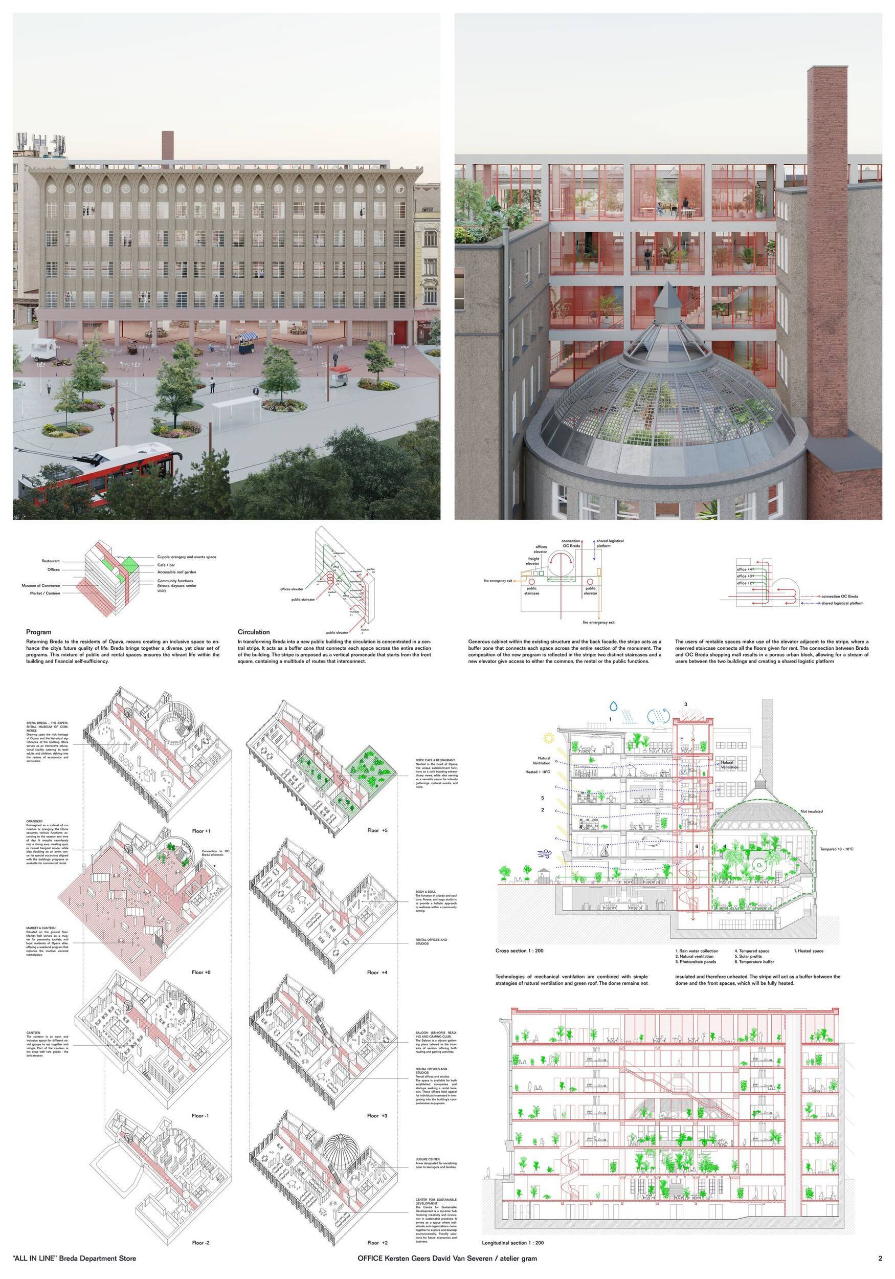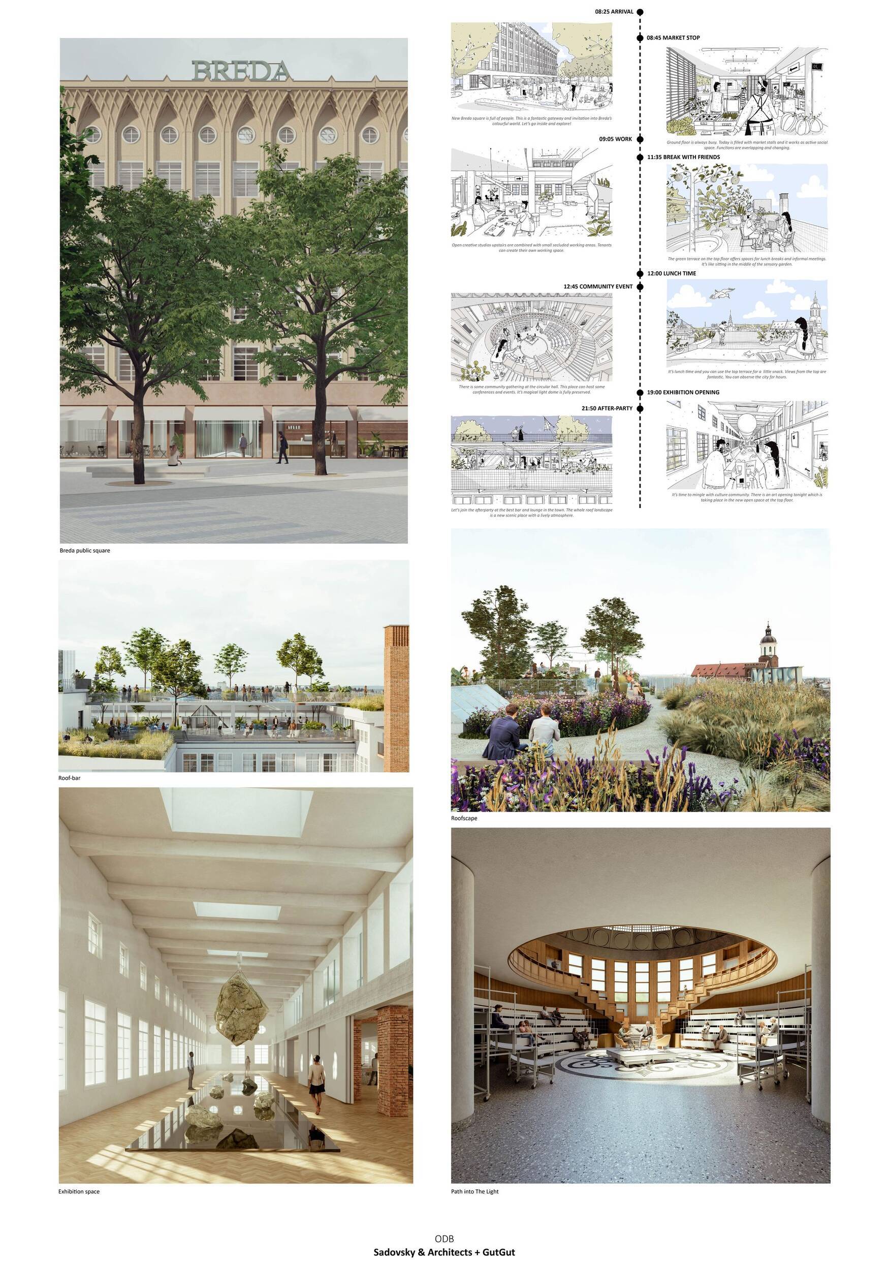 Breda bude žít, pokud se bude dále rozvíjet. Její příběh je otevřeným příběhem účinné transformace a nezbytné sebereflexe. Je to postupná cesta ke světlu. Klíčovou ambicí je učinit tento objekt, k němuž mají uživatelé a návštěvníci aktivní a pozitivní vztah, funkčnějším a viditelnějším. Z tohoto důvodu je transformace zaměřena na společenskou hodnotu, kterou vytváří sdílený a integrovaný veřejný prostor propojeného interiéru a exteriéru. Proces transformace Bredy je podmíněn nejen fyzickou, ale i psychologickou změnou. Proměna opuštěné budovy ve funkční organismus vyžaduje několik fází zásahu a specifikaci dlouhodobých a krátkodobých ambicí. Tento proces chápeme jako samoregenerační proces aktivace, programování rekonstrukce budovy a jejího "naplnění" obsahem. Hierarchie velikosti zásahů do stávající budovy v čase bude vycházet z konkrétních požadavků dalšího rozvoje. Neméně důležitý je proces řízení, správy a technického provozu budovy. Tento proces by měla zastřešit nově založená městská společnost. Ve druhém kole soutěže se náš návrh zaměřuje na počáteční fázi tzv. zásadní transformace. Zásadním motivem je vytvoření dvou aktivačních platforem: v přízemí- na úrovni náměstí, prostřednictvím kterých integrujeme město, a za druhé na aktivní střeše, ze které pozorujeme město. Vnitřek budovy je otevřený a flexibilní, připravený k pronájmu pro aktivity, které mohou fungovat v komunitním propojeném ekosystému. Sociokulturní funkce je přidanou hodnotou.