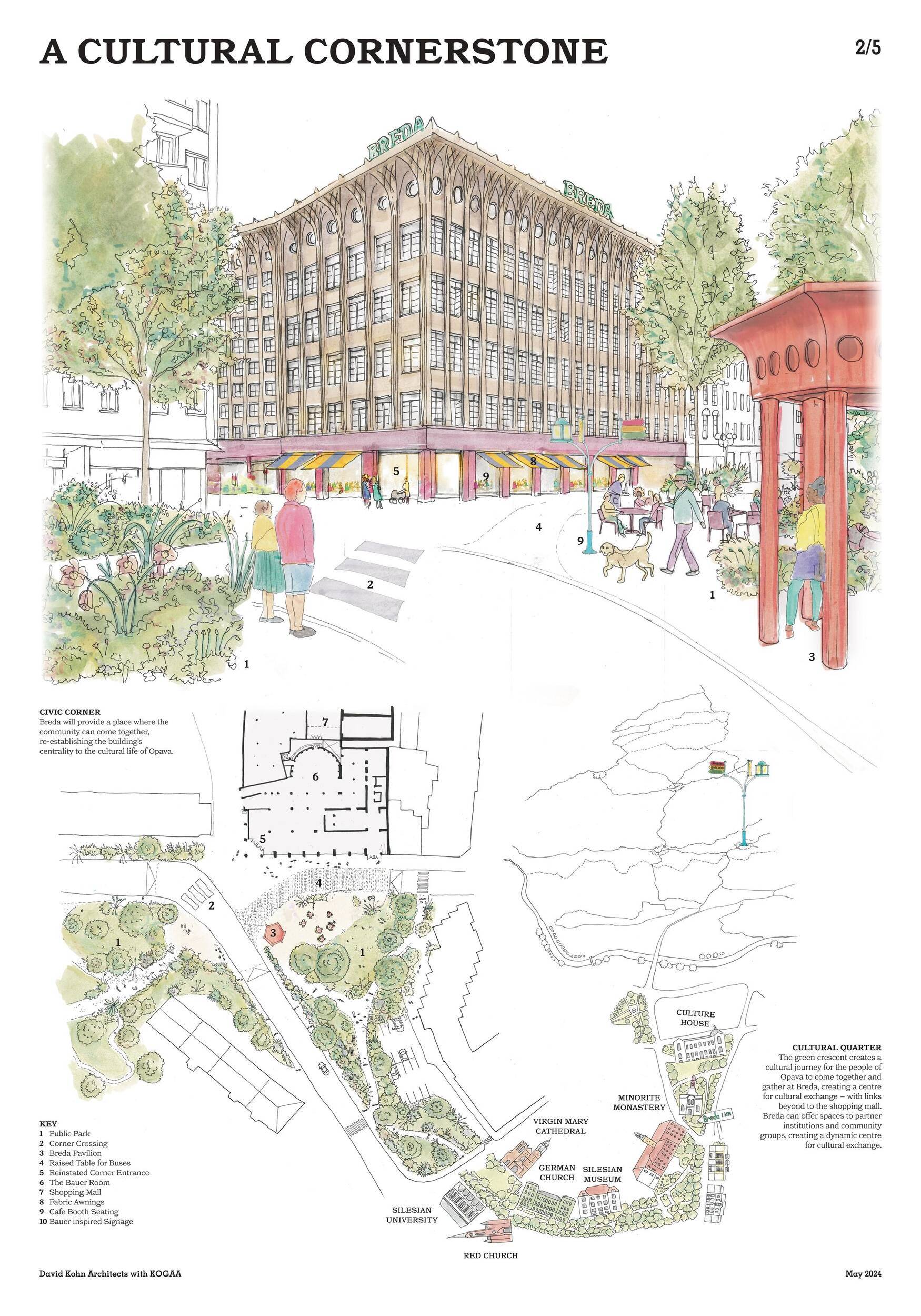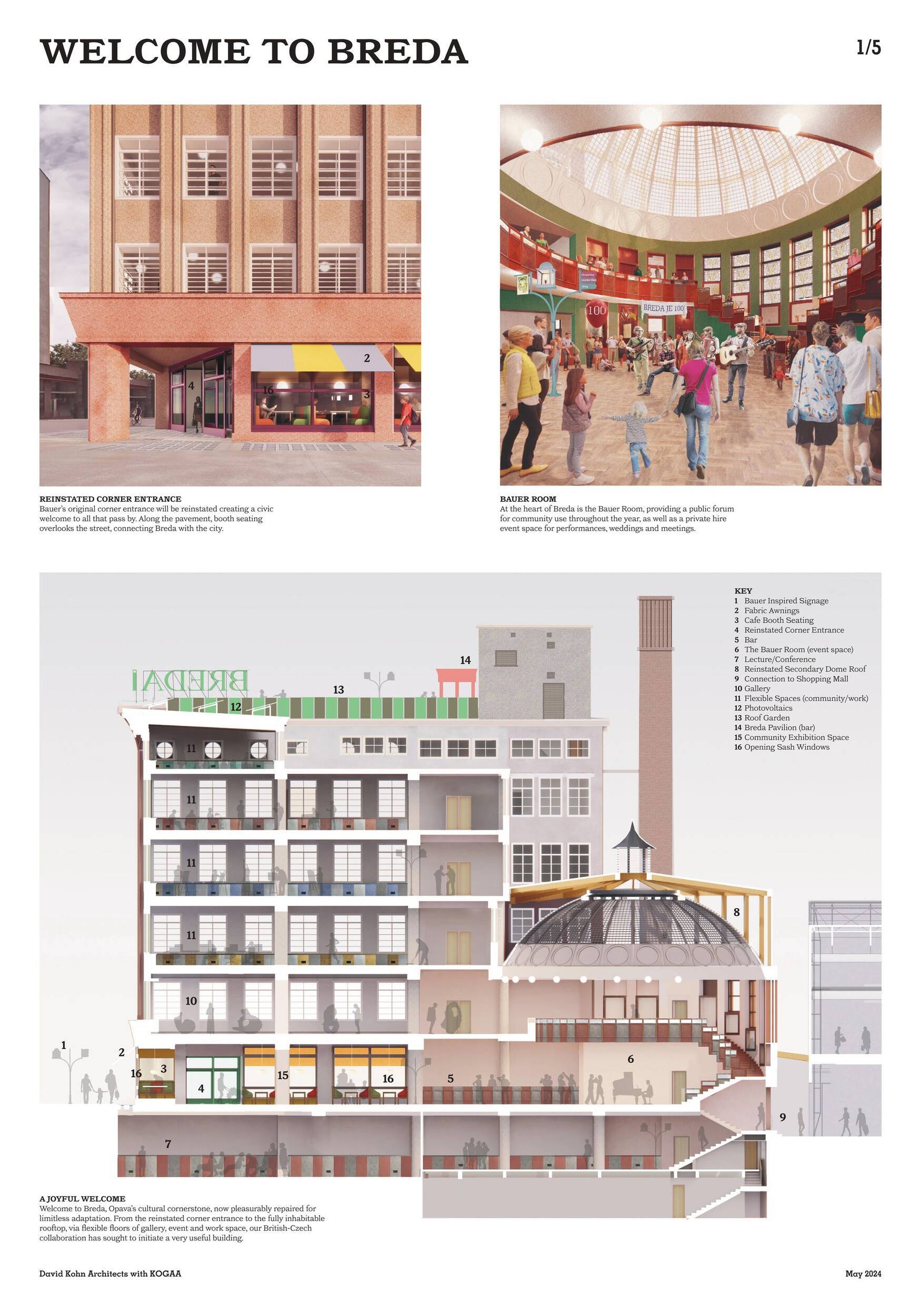 Přístup k minulosti - zacházení s místem a dědictvím. Strategie transformace se stanou součástí historických stop nashromážděných v průběhu času a zdůrazní prostorové kvality Bauerova návrhu. Od interiérů až po přední a zadní fasády jsou volby designu a materiálů v souladu s kumulací historických vrstev. Kombinace měkkých a strategických přístupů přitom bude respektovat jak budoucí ambice, tak důvěrnou znalost Opavy směrem k Bredě. Opava dnes – Kulturní osa. Bývalý obchodní dům Breda stojí na začátku nejvýznamnější opavské kulturní osy. Revitalizace památky znamená nově definovat její roli jako veřejné budovy a její vyznění ve městě. Vrstvy historie. Historie památky, kterou dnes vidíme, se vyznačuje proměnami v čase. Od původního obchodu Breda & Weinstein přes rohovou budovu Leopolda Bauera až po nedávné opravy je každá vrstva historie památky hmatatelně přítomná. Návrh pokračuje v této tradici přetváření, respektuje křehkost hlavních prvků a zároveň navrhuje soustředěný zásah usnadňující nový veřejný život Bredy. Dům pro všechny. Náměstí a pás působí jako nezbytný zprostředkovatel nového veřejného života Bredy. Od programových funkcí až po volbu materiálů jsou tyto dva velké prostory vnímány jako jeden celek. Veřejný interiér je plně přístupný z náměstí před ním, čímž se přízemí mění v prostupný a velký občanský prostor.