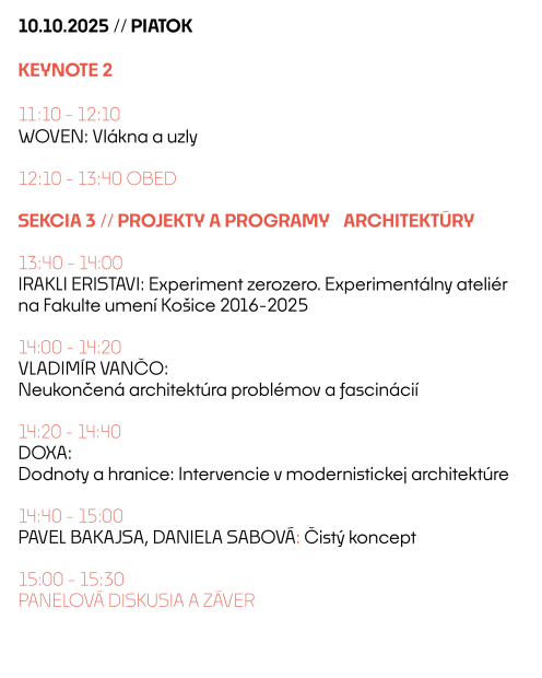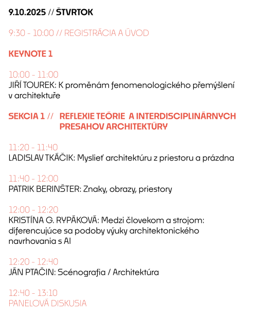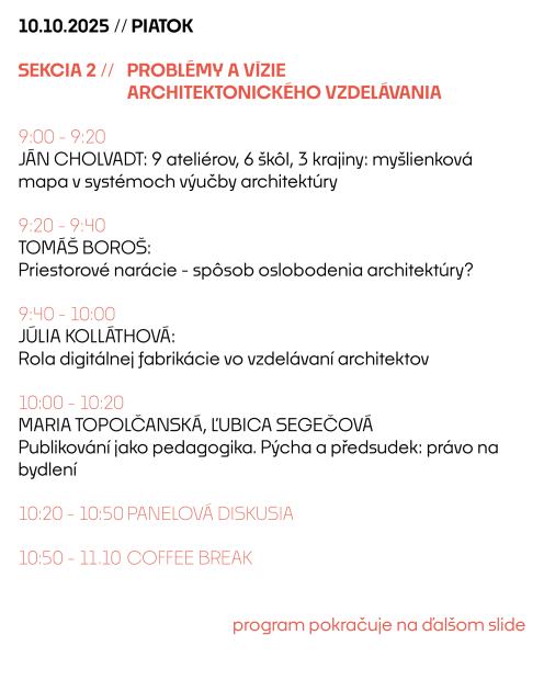 Srdečne pozývame všetkých záujemcov a všetky záujemkyne zúčastniť sa vyzvaných prednášok, jednotlivých príspevkov aj panelových diskusií. Príďte debatovať o teórií, tvrobe a vzdelávaní v arhchitektúre. Udalosť sa uskutoční v budove VŠVU na Hviezdoslavovom námestí 18, v miestnosti č. 135.