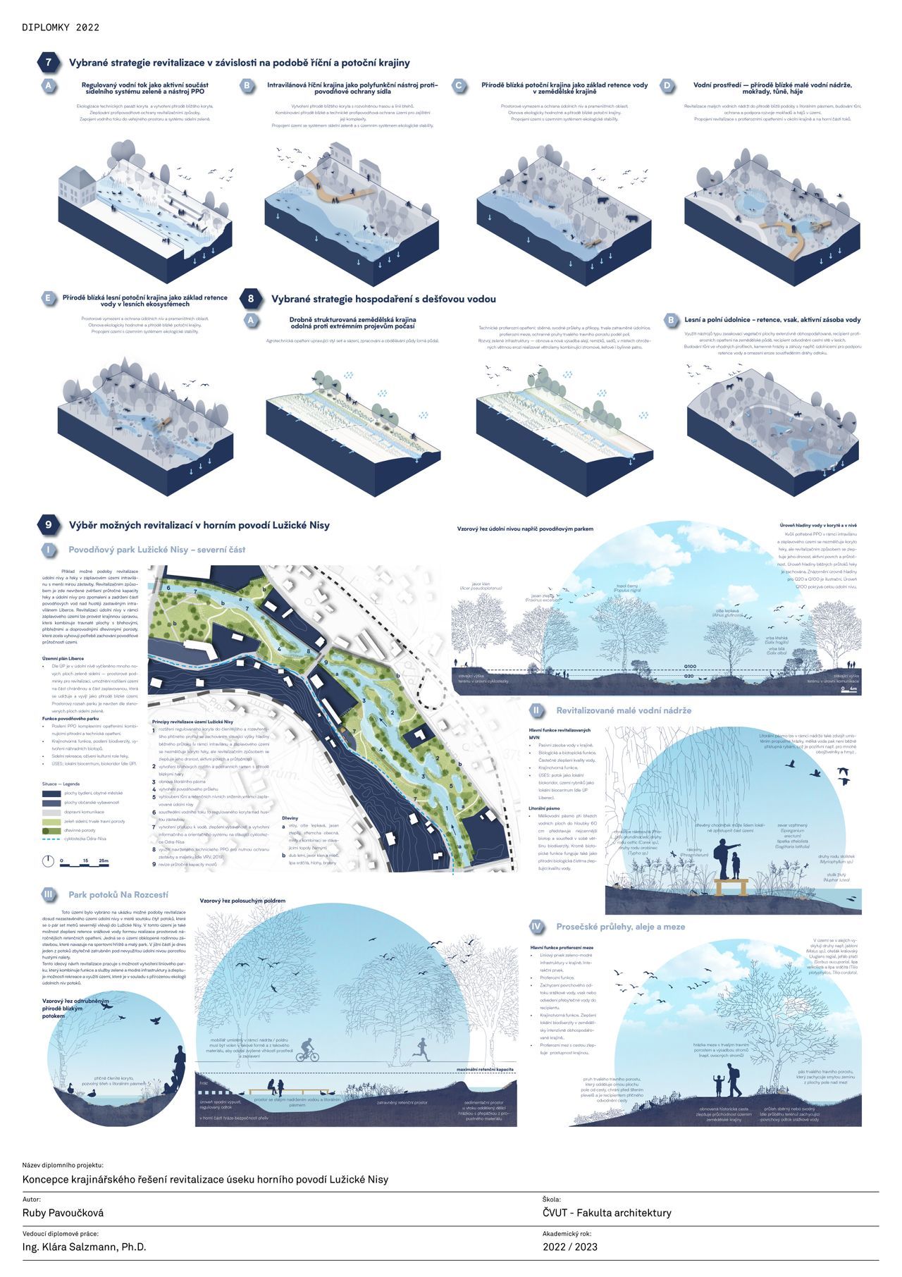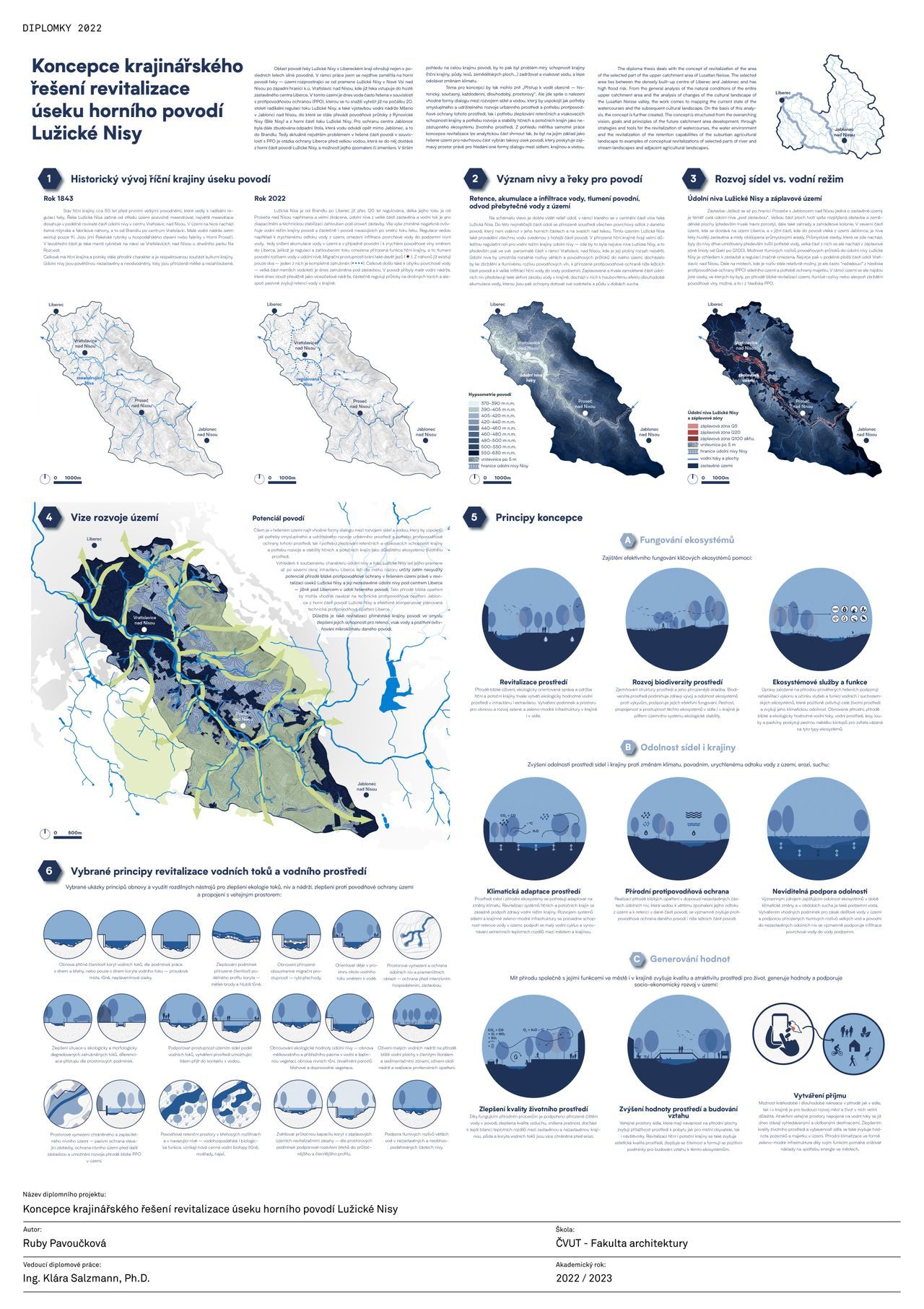 Porota byla fascinována rozsahem a hloubkou záběru této diplomové práce. Od velmi důkladných a náročných analýz celého prostředí horního povodí toku až po stanovení vize proměny této velmi urbanizované krajiny, kterou jako Popelka protéká mnohdy neviditelná řeka Nisa. Diplomová práce si nestanovuje jen vize rozvoje, posilování retenčních schopností příměstské zemědělské krajiny či strategii revitalizace vodního toku. Jde až do ideového detailu řešení vybraných částí říční a potoční krajiny a navazující zemědělské krajiny. Rozsah práce je fascinující, ale přesto velmi logicky členěný. Porota byla zatažena do příběhu utrápené řeky v analytické části až po její rozkvět v samotném návrhu. Práce je skvěle graficky zpracována a představuje další silnou složku tohoto diplomního příběhu. Děkujeme a doufáme, že se alespoň část této práce propíše do realizační podoby, nebo alespoň vyvolá tak potřebnou diskusi na Povodí Labe a na území Libereckého kraje, kterým tato řeka protéká.