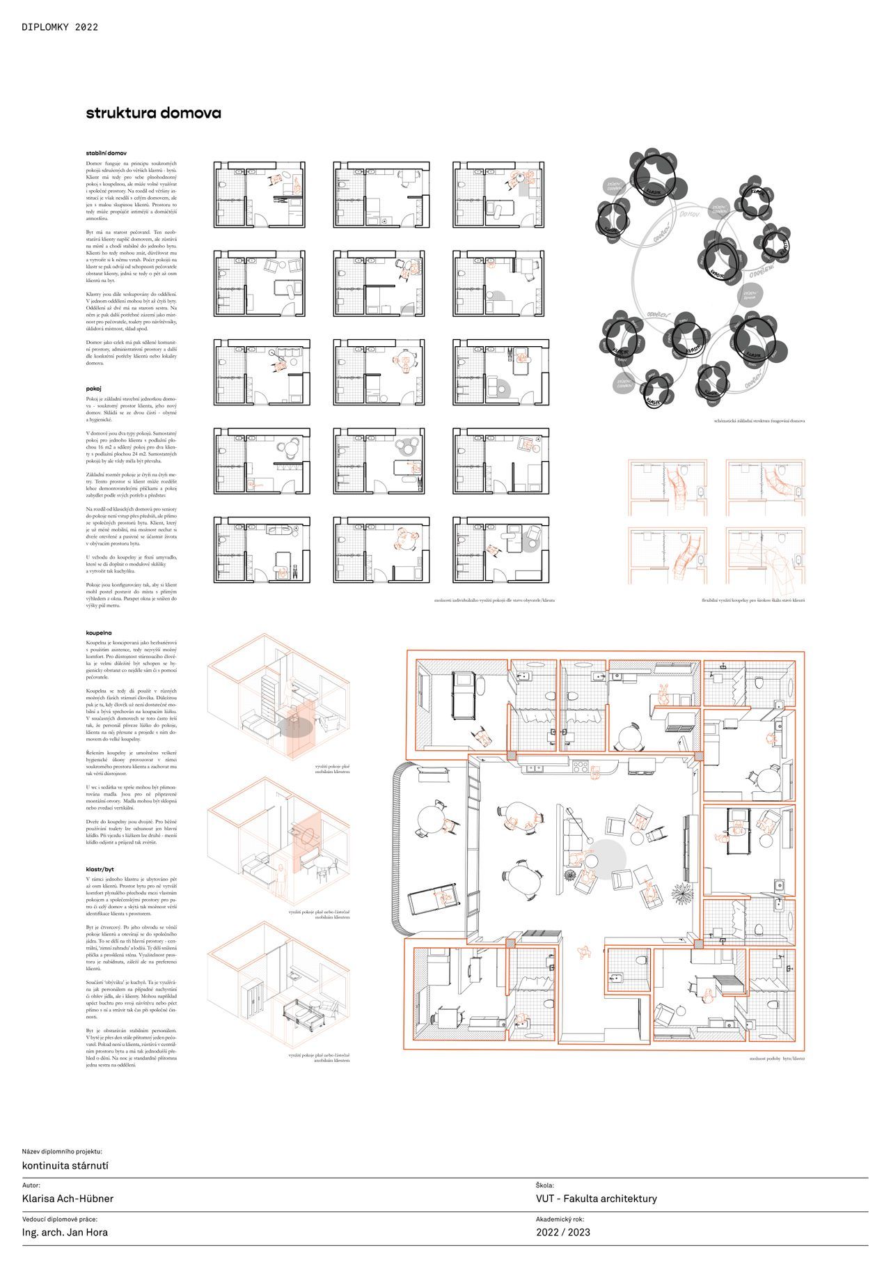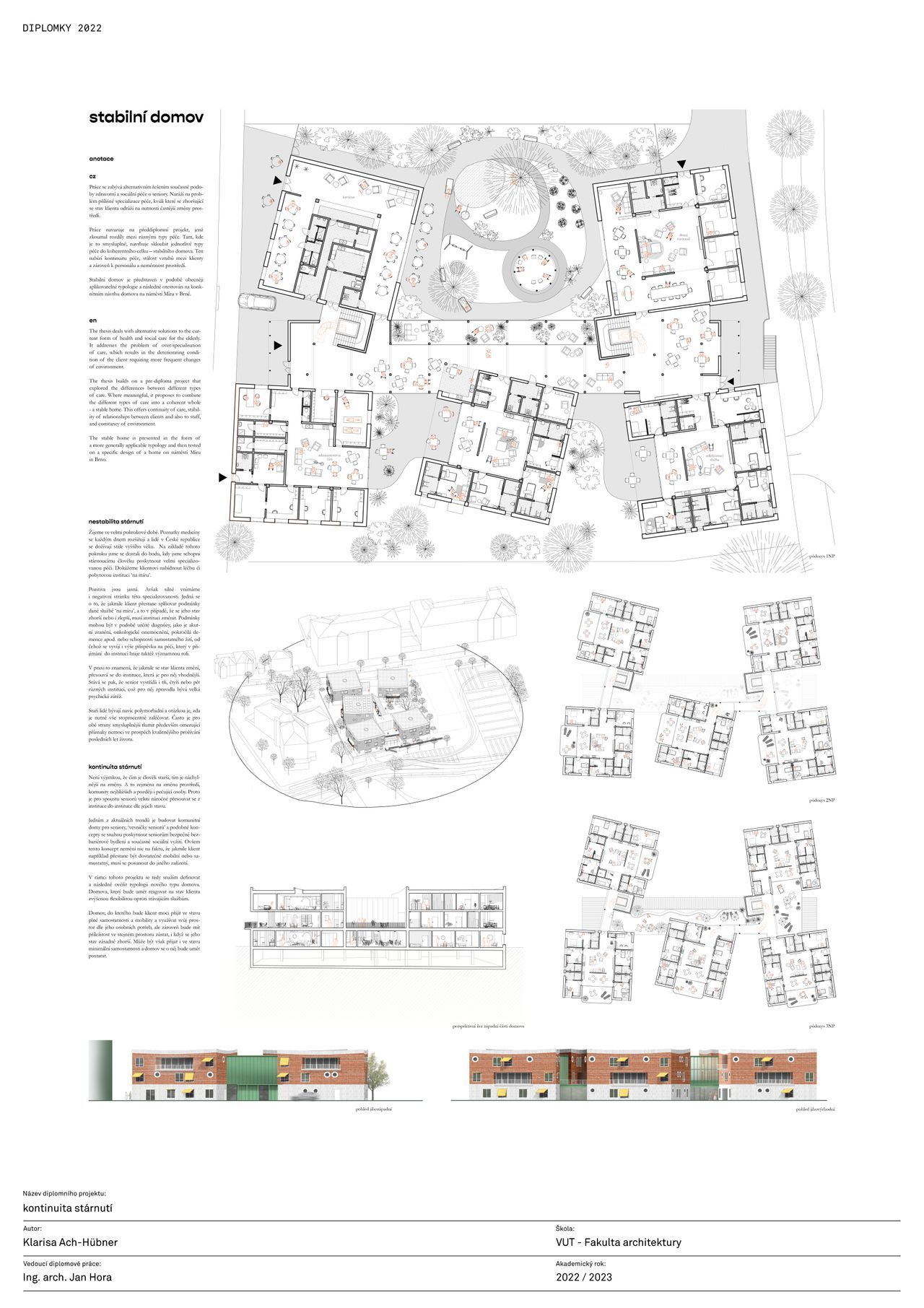 Kontinuita stárnutí je projektem, který prokázal autorčinu schopnost naplno se vcítit do tématu a prozkoumat ho do nejmenších detailů. Právě množství navržených situací, hledání scénářů a cest, jak stárnoucímu člověku přizpůsobit prostředí, dokazuje oddanost architektonické práci. Autorka pracuje s prostorem tak, aby v různorodých životních situacích nemusel obyvatel navrženého klastru zpřetrhávat vazby na prostředí i lidi kolem sebe, ale aby se naopak prostor uměl variovat a přizpůsobovat a člověku zůstala ponechána stabilita a klid. Projekt je pro porotu nejcennější právě ve svém soustředění na tak drobné a konkrétní měřítko - ne ve smyslu architektonického detailu, ale ve smyslu vztahu architektury ke stárnoucímu člověku.