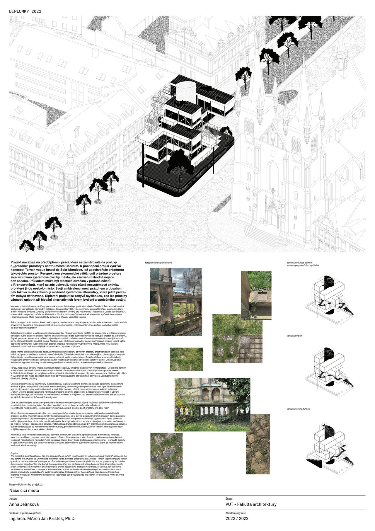 Projekt navazuje na předdiplomní práci,která se zaměřovala na proluky a „prázdné“ prostory v centru města Chrudim. K pochopení proluk využívá koncepci Terrain vague Ignasi de Solà-Moralese, jež zpochybňuje prázdnotu takovýchto prostor. Perspektivou ekonomické výtěžnosti prázdné prostory sice leží mimo systémové okruhy města,ale zároveň rozhodně nejsou bez obsahu. Příkladem může být městská divočina v podobě náletů a R-ekosystémů nebo různé nesystémové aktivity pro které jinde nezbylo místo. Svojí ambivalencí mezi prázdnem a obsahem pak taková místa ztělesňují možnost systémové alternativy,která ještě prozatím nebyla definována. Diplomní projekt se pak zabývá myšlenkou,zda lze principy vágnosti uplatnit při hledání alternativních forem bydlení a společného soužití.