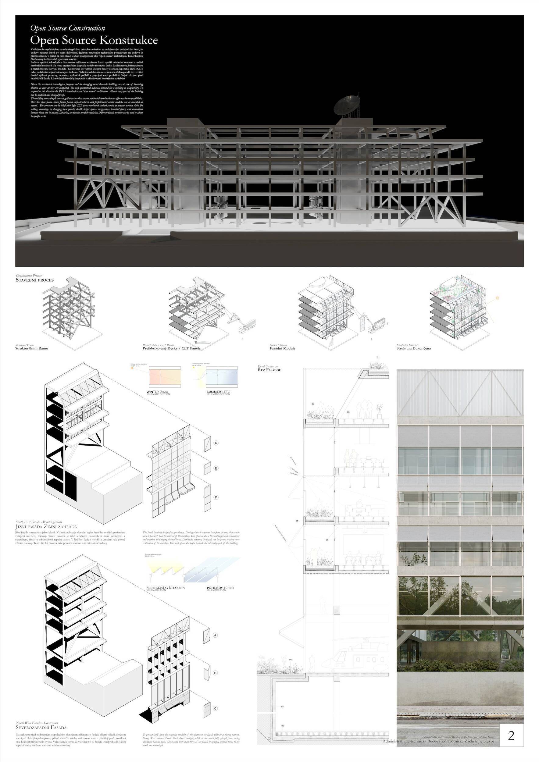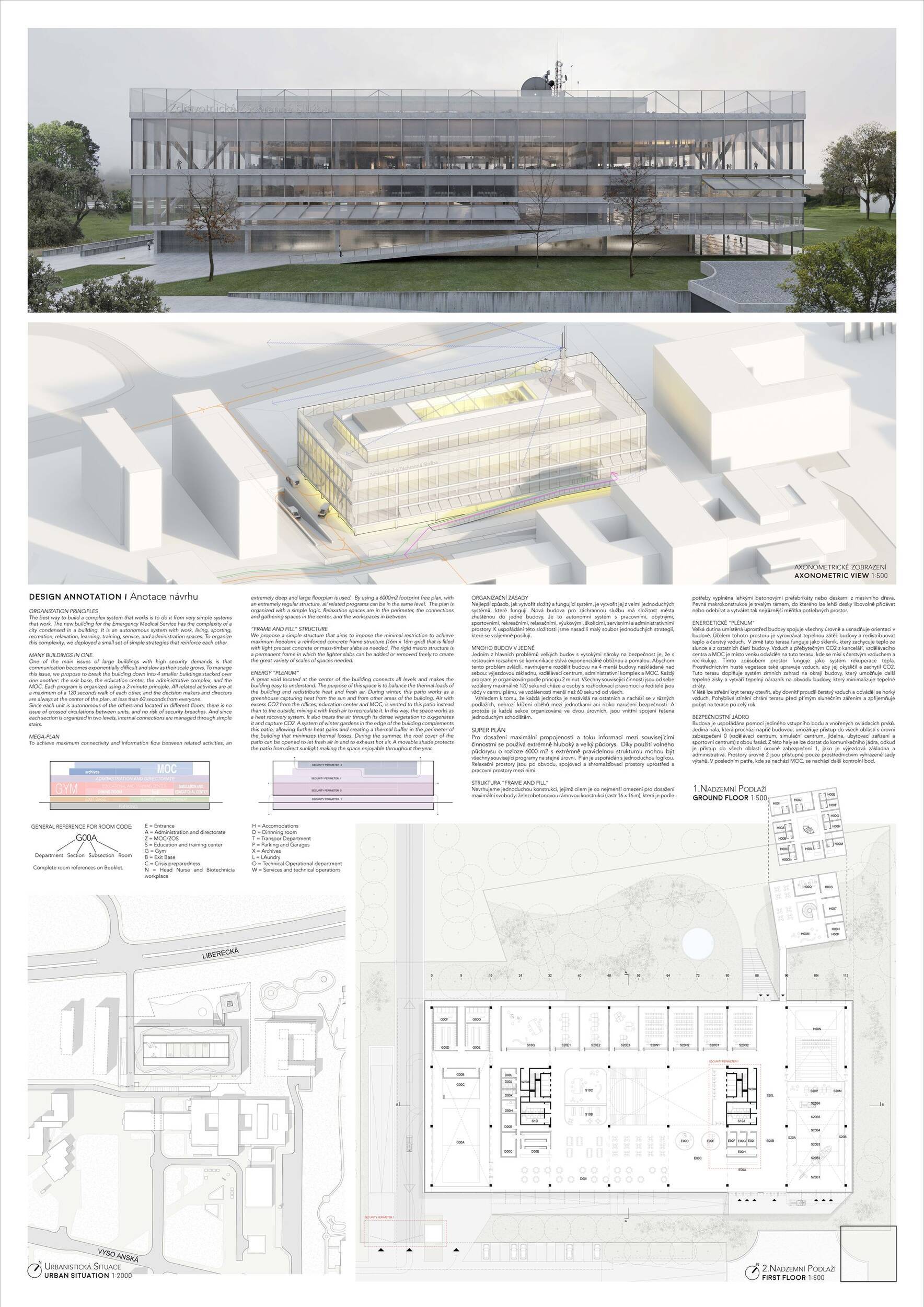 Porota oceňuje optimalizaci půdorysů a zpracování připomínek z prvního kola soutěže. Dále také velmi konstrukční pojetí s 9m rastrem, hybridní materialitu a zavedení dřeva jako stavební materiál v rámci českého stavebního zákona. V opačném případě, co se týká materiálu, polykarbonátová fasáda vyvolává obavy z údržby a její trvanlivosti. Klimatický koncept je inovativní a navrhuje pasivní řešení, tedy zmenšení klimatizovaného prostoru a využití atria jako přirozeného nárazníku a komína. Návrhy ještě neuvádí různé možné režimy provozu. Ačkoliv zní překysličování použitého vzduchu v atriu lákavě, porota ale není zcela o fungování přesvědčena. Umístění ZOS na konci budovy je zcela jasné, ale poloha jádra hned vedle něj poněkud omezuje možné rozšíření ZOS. Málo přesvědčivé je pro porotu otevření fasád kolem simulačních místností, které působí atraktivně, ale tyto prostory spadají do bezpečnostního perimetru, a proto musí mít řízený přístup. Dále bezpečnostní perimetr narušuje točité schodiště na nádvoří. Kontrola přístupu a oplocení areálu jsou řešeny přesvědčivě, subtilní gesto vstupního schodiště překračujícího oplocení. Napojení na městský okruh není možné, ale lze ho vynechat. Velmi přitažlivě působí čistá estetika budovy, ale je otázkou, zda je to vhodný jazyk pro daný kontext periferií a identitu klienta/uživatele.