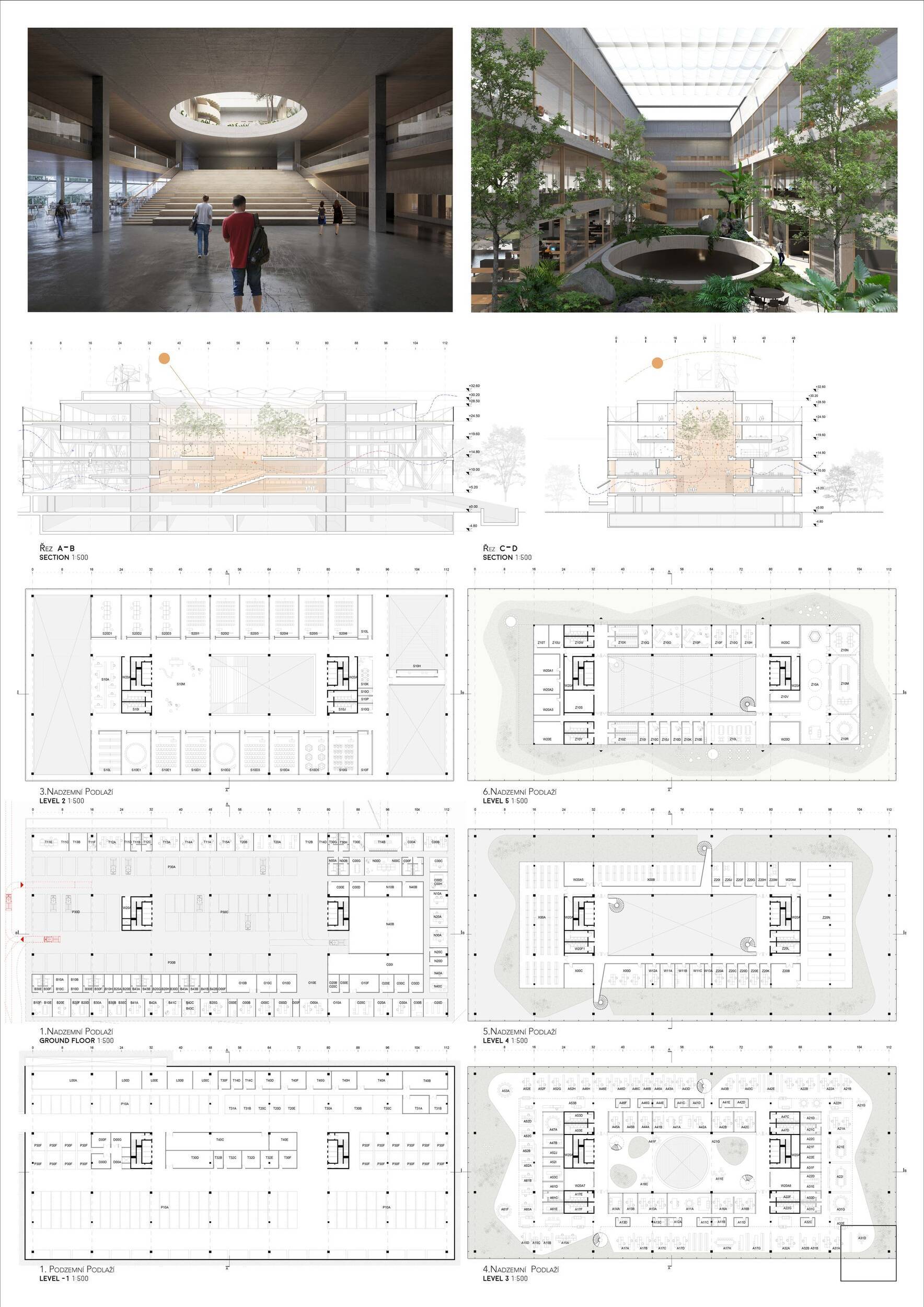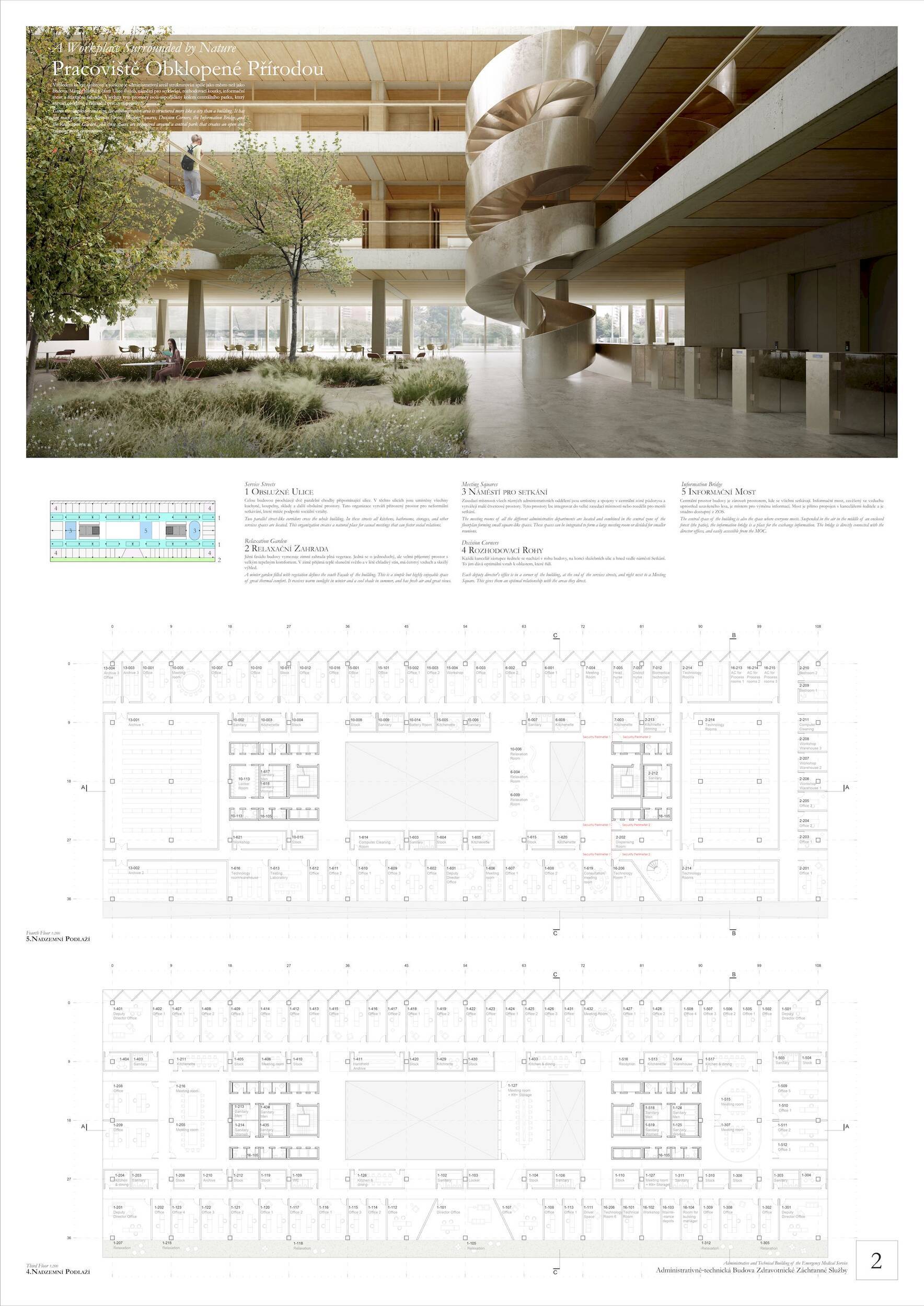 Porota shledává v návrhu výrazný posun v redukování příliš extenzivního zacházení s volumetrií tím, že hmoty jednotlivých bloků byly přisazeny k sobě. Pozitivně porota hodnotí i řešení hlavního vstupu z úrovně přízemí do prostorové zhuštěné haly s řadou úrovní a průhledů nebo vtipný koncept volumetrie „spirálovitého větrníku“, které navazuje na prostorovou a provozní hierarchii dopravní obsluhy a garáží. Dále také dodržení a propsání typologické čistoty a kázně do principu: druh funkce = samostatný objem. Zvolený prostorový koncept se však ukazuje zároveň jako limitující s řadou obtížně řešitelných dopadů. Problematické se zdá obsazení jednoho z objemů v nadzemní části parkingem. Byť je tento program míněn jako druh prostorové rezervy, působí spíše dojmem hledání náplně pro 4. objem. Obecně lze konstatovat, že dedikování hmot jednotlivým funkcím, včetně separátních komunikací limituje flexibilitu budovy pracující s přístupovými perimetry. Dále rozdělení do velikého počtu objemů vytváří vysoký poměr ploch pláště vůči užitné ploše a značně navyšuje množství HPP. Problematické se jeví též konstrukční výšky podlaží administrativní části, která činí 3,3 m, a jsou tedy výrazně poddimenzované.