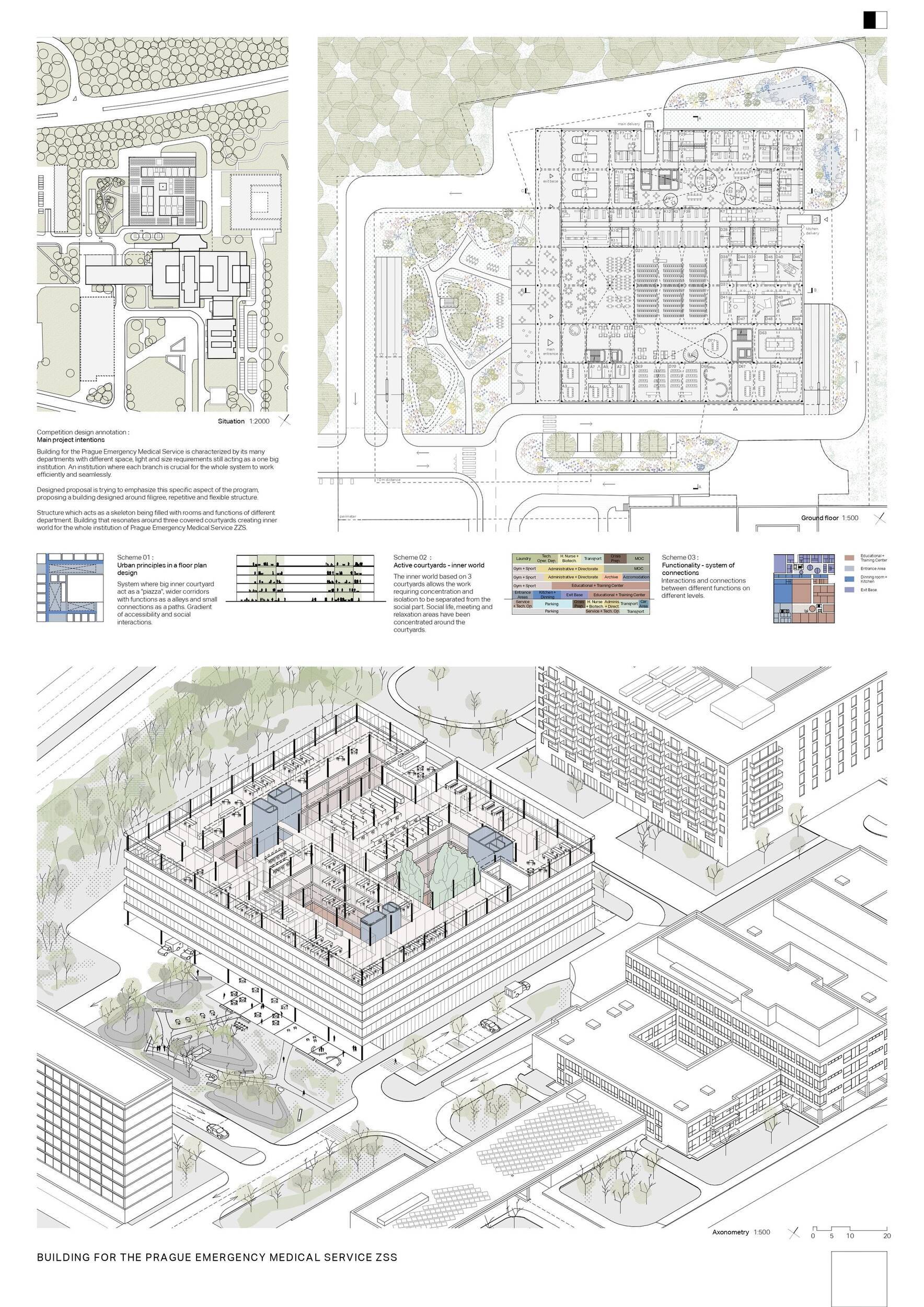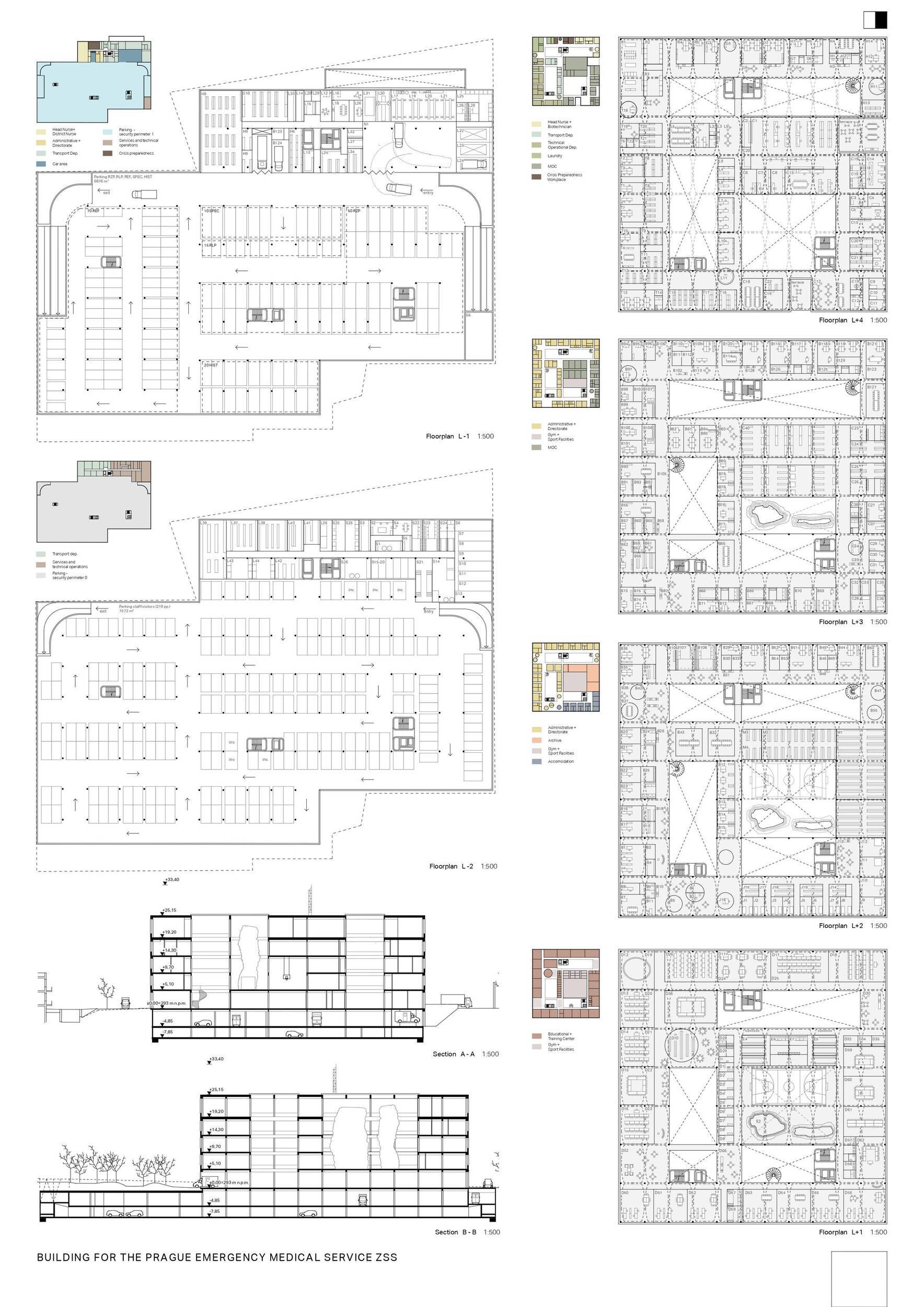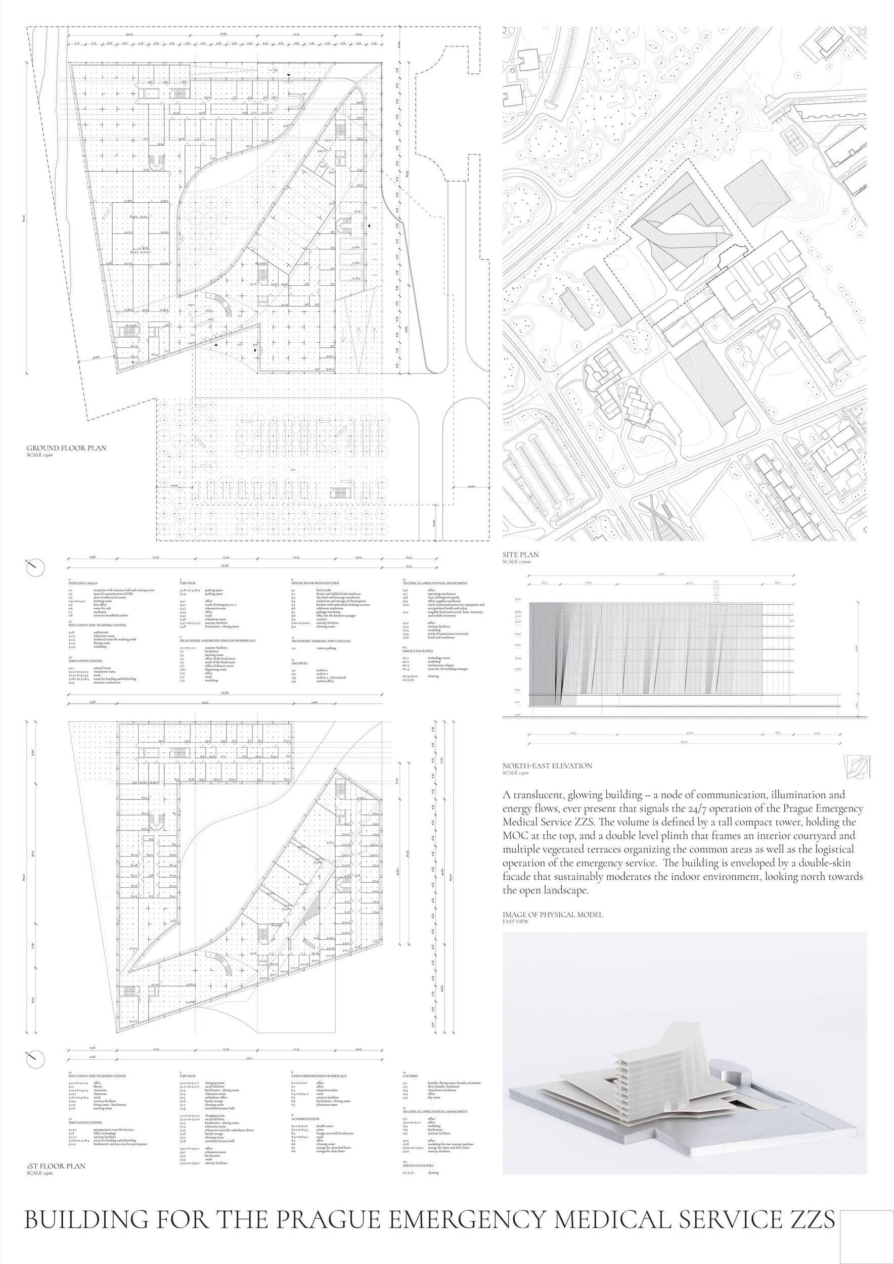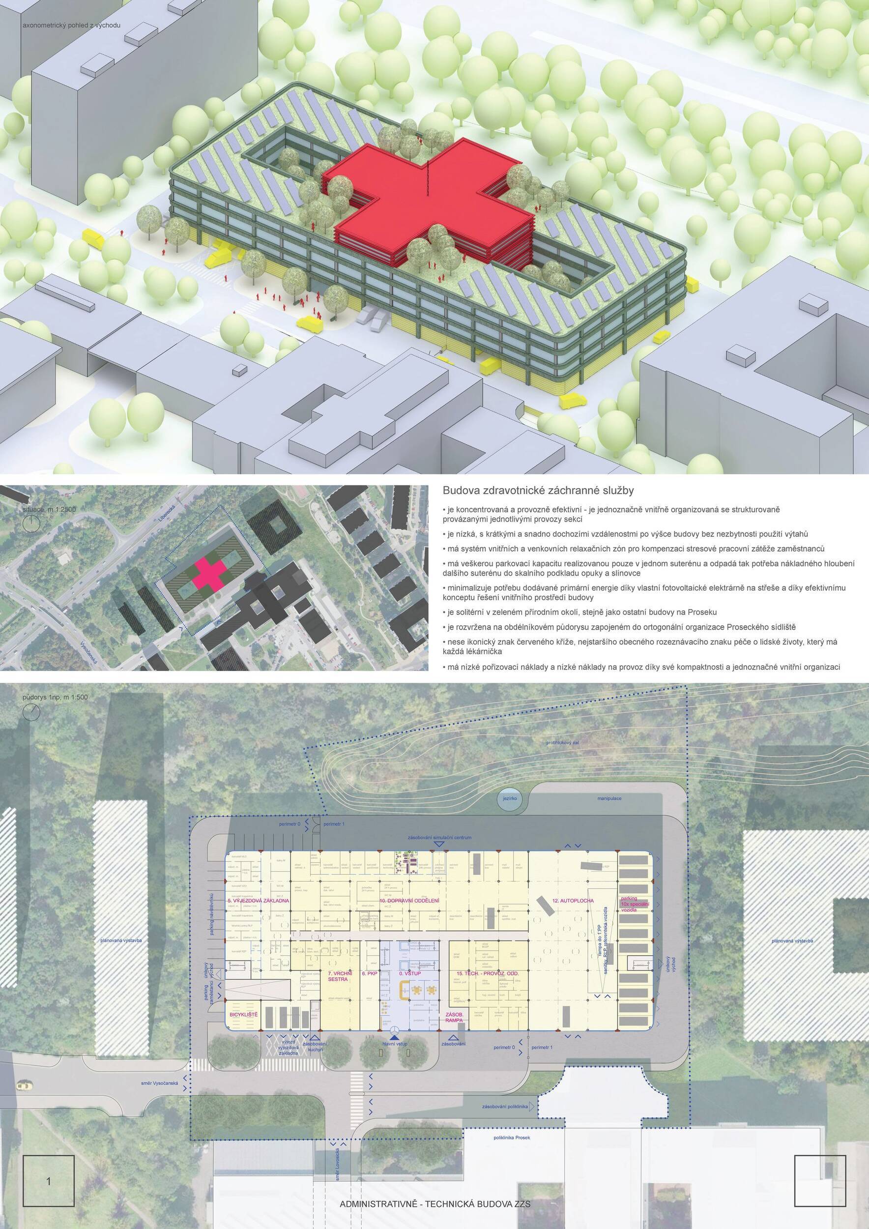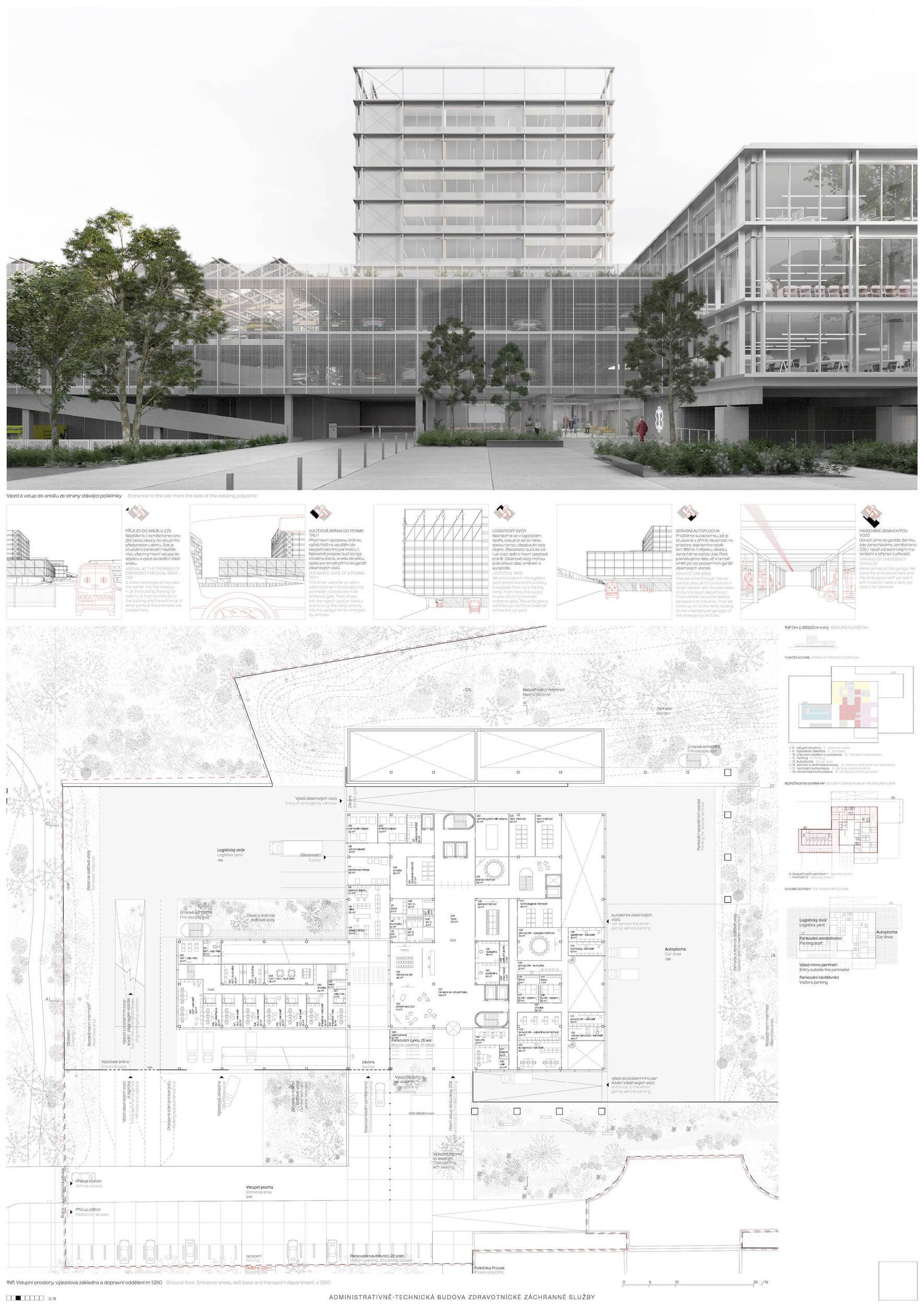 Budova pro Zdravotnickou záchrannou službu v Praze je charakterizována mnoha funkčními sekcemi s různými požadavky na prostor, světlo a velikost. Ty dohromady tvoří jednu instituci, ve které je každá její část klíčová pro efektivní a bezproblémové fungování celku. Návrh klade důraz na tuto specifickou stránku programu a navrhuje budovu fungující na základě opakující se subtilní a zároveň flexibilní struktury. Konstrukce budovy funguje jako kostra, do které jsou umístěny místnosti a funkce různých sekcí. Plné objemy propojují tři krytá atria, vytvářející vnitřní svět pro celou instituci Zdravotnické záchranné služby.