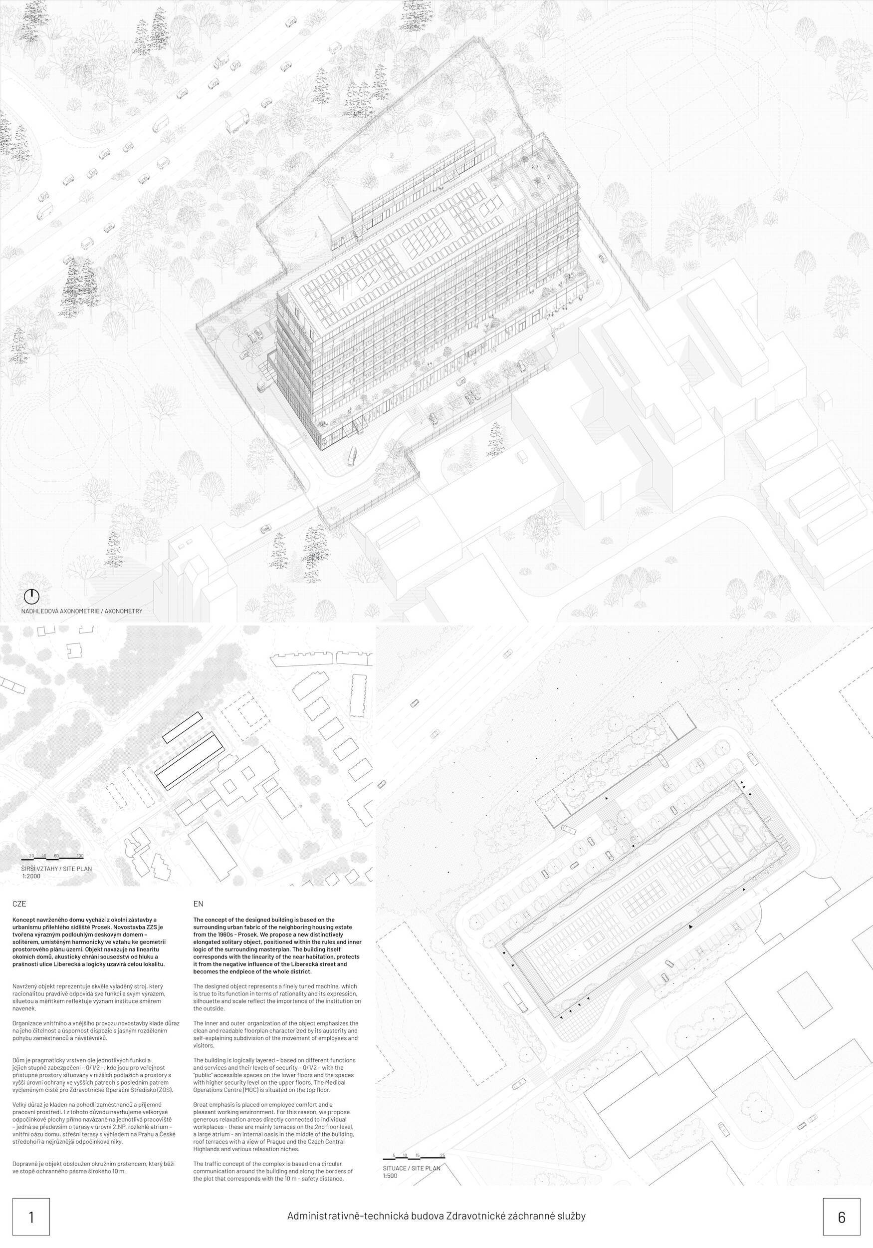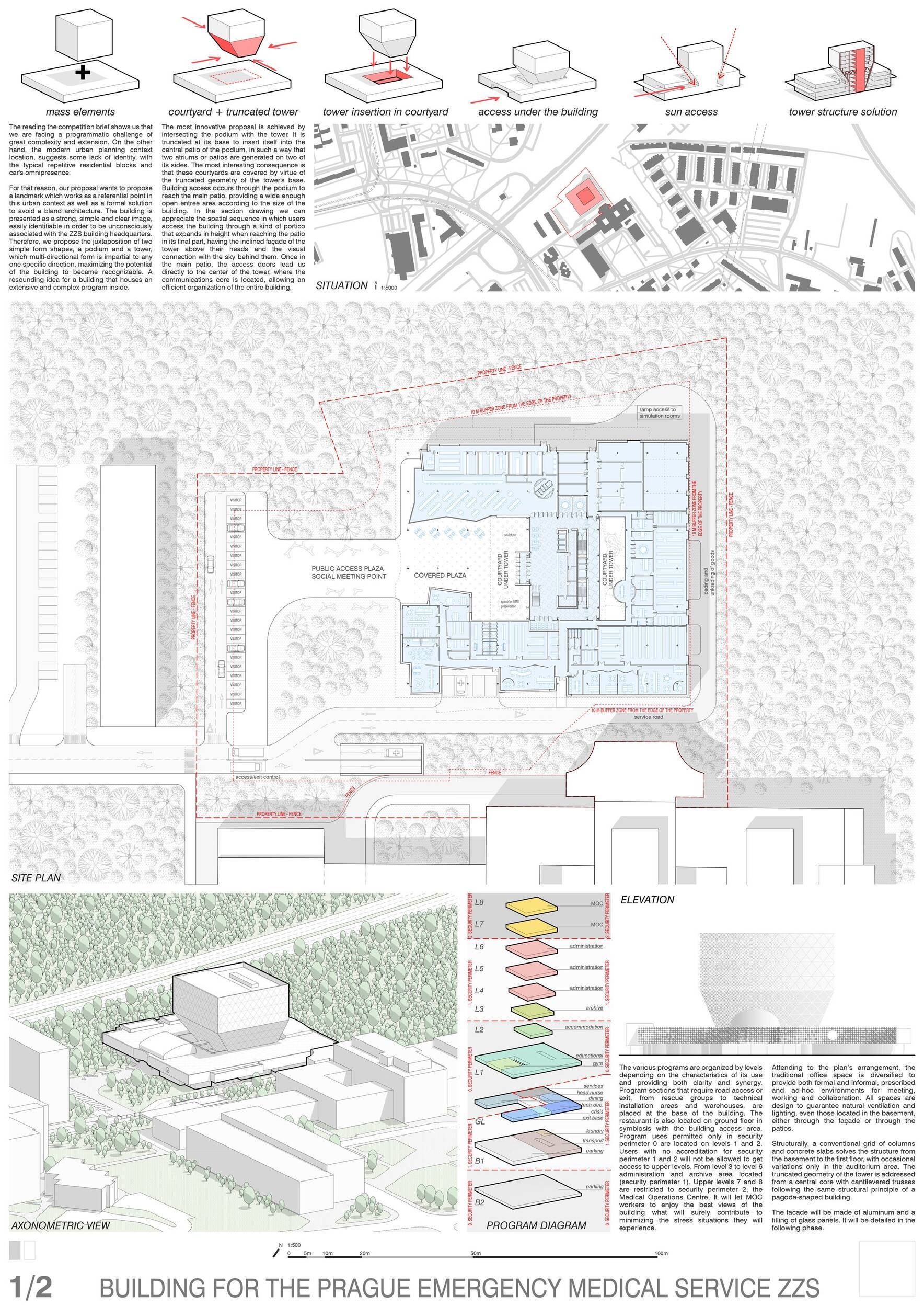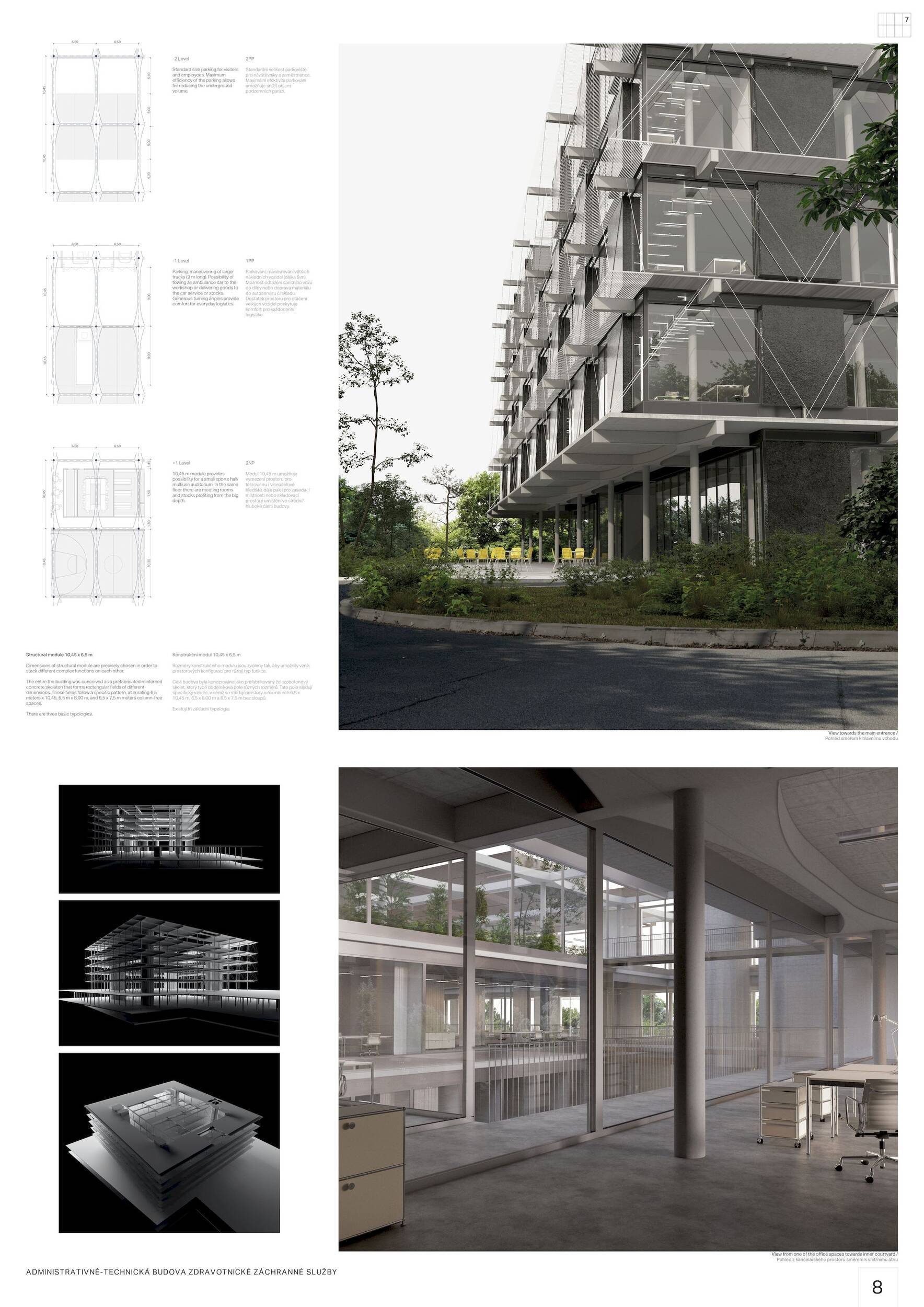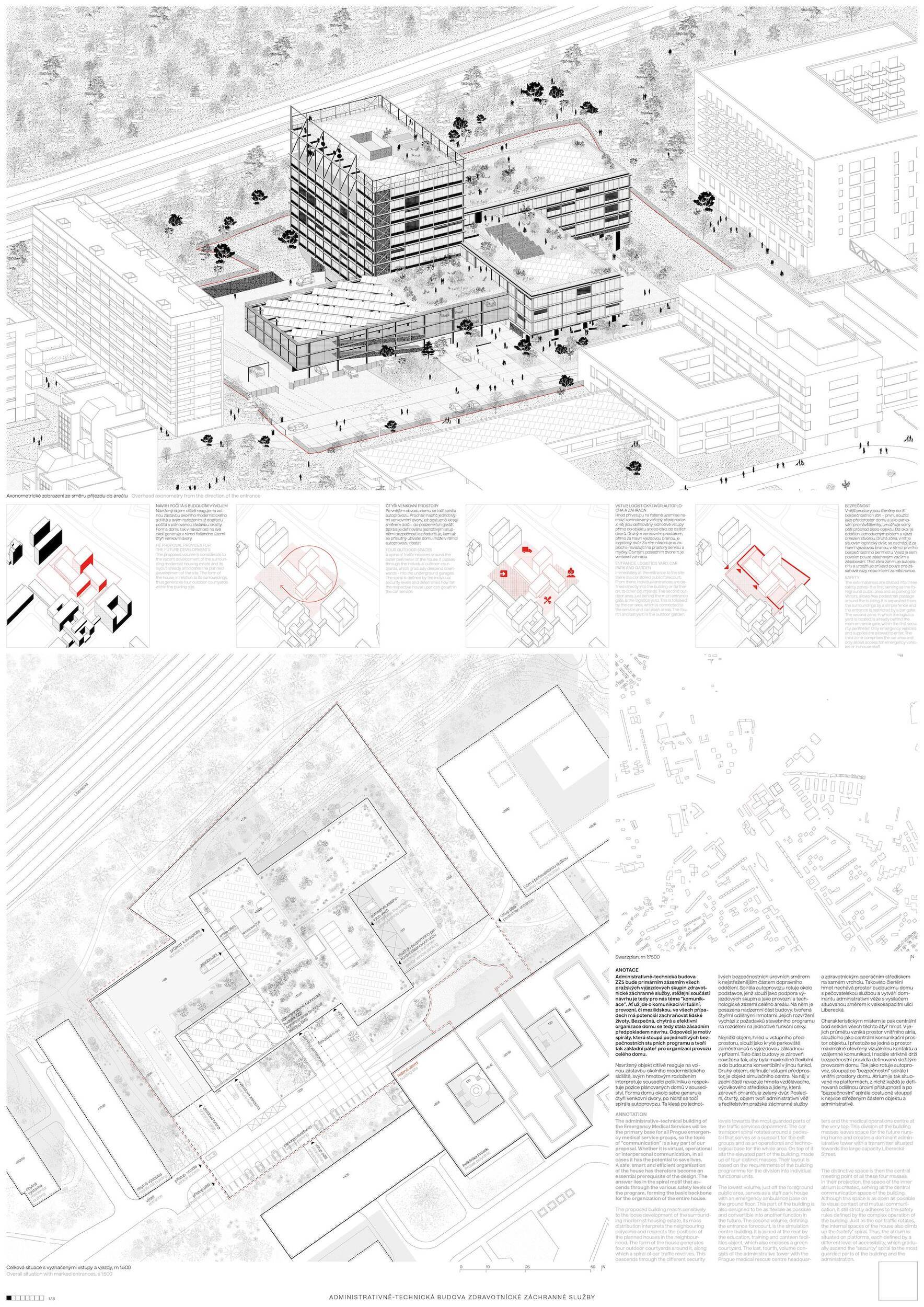 Budova pro Zdravotnickou záchrannou službu v Praze je charakterizována mnoha funkčními sekcemi s různými požadavky na prostor, světlo a velikost. Ty dohromady tvoří jednu instituci, ve které je každá její část klíčová pro efektivní a bezproblémové fungování celku. Návrh klade důraz na tuto specifickou stránku programu a navrhuje budovu fungující na základě opakující se subtilní a zároveň flexibilní struktury. Konstrukce budovy funguje jako kostra, do které jsou umístěny místnosti a funkce různých sekcí. Plné objemy propojují tři krytá atria, vytvářející vnitřní svět pro celou instituci Zdravotnické záchranné služby.