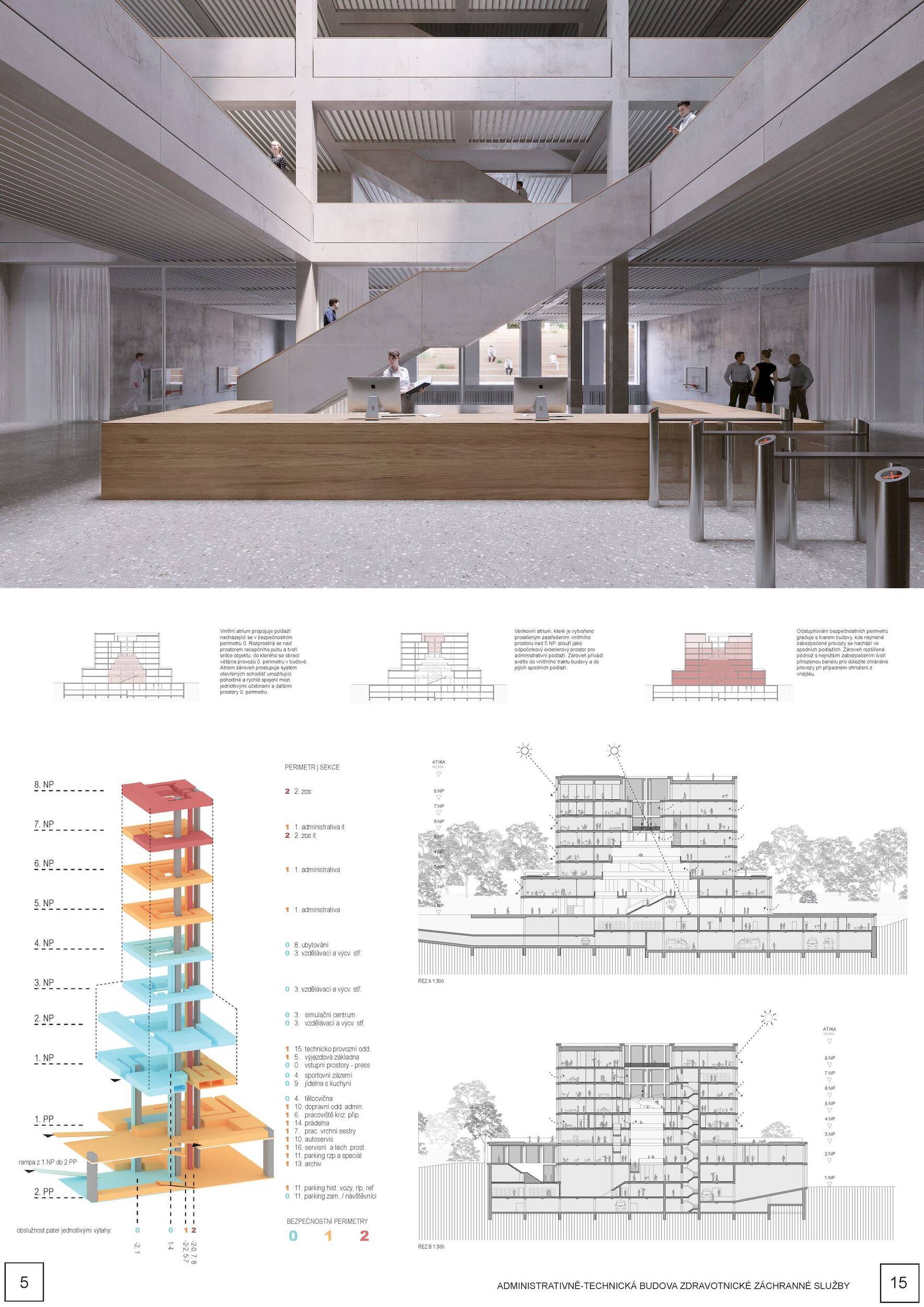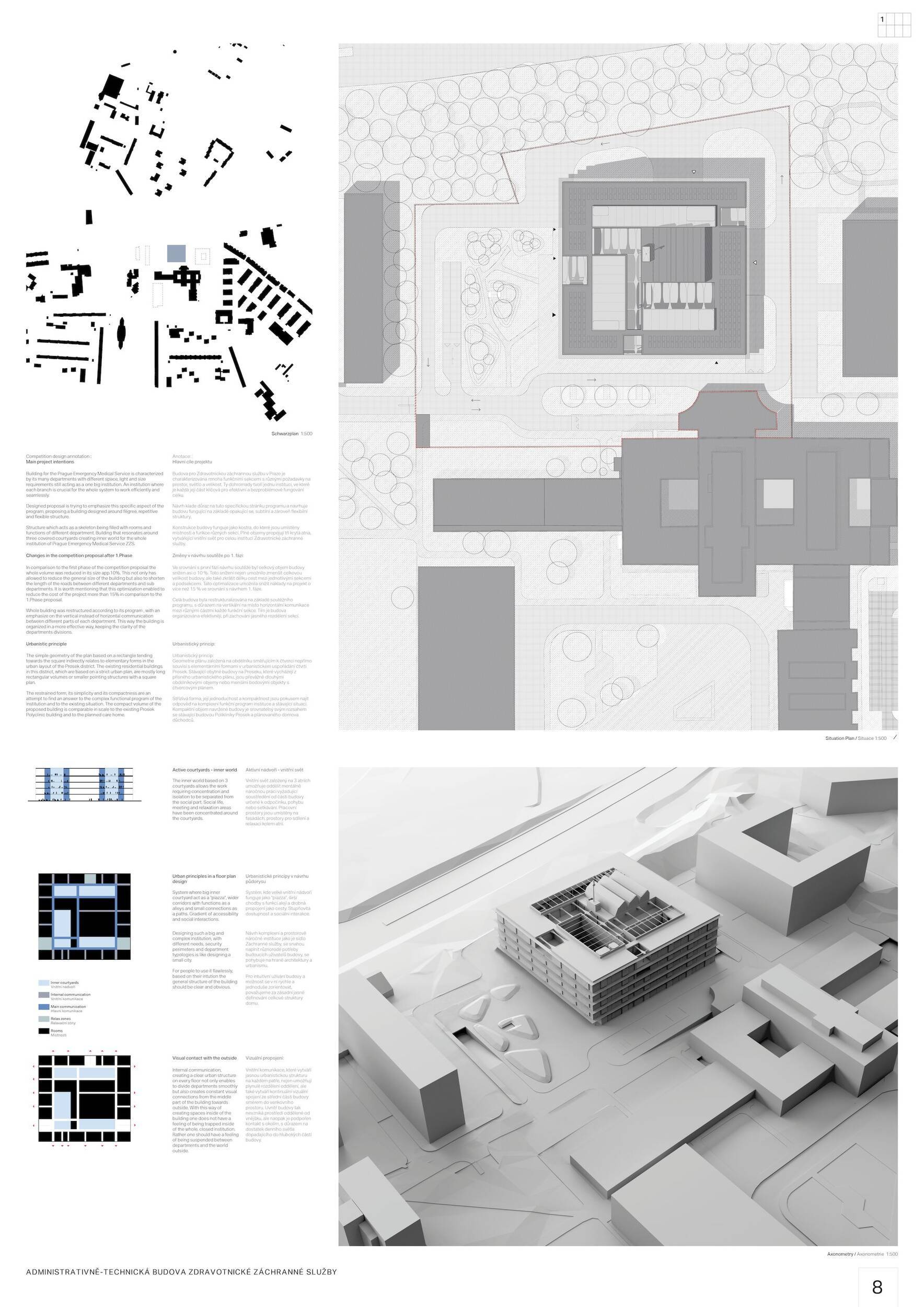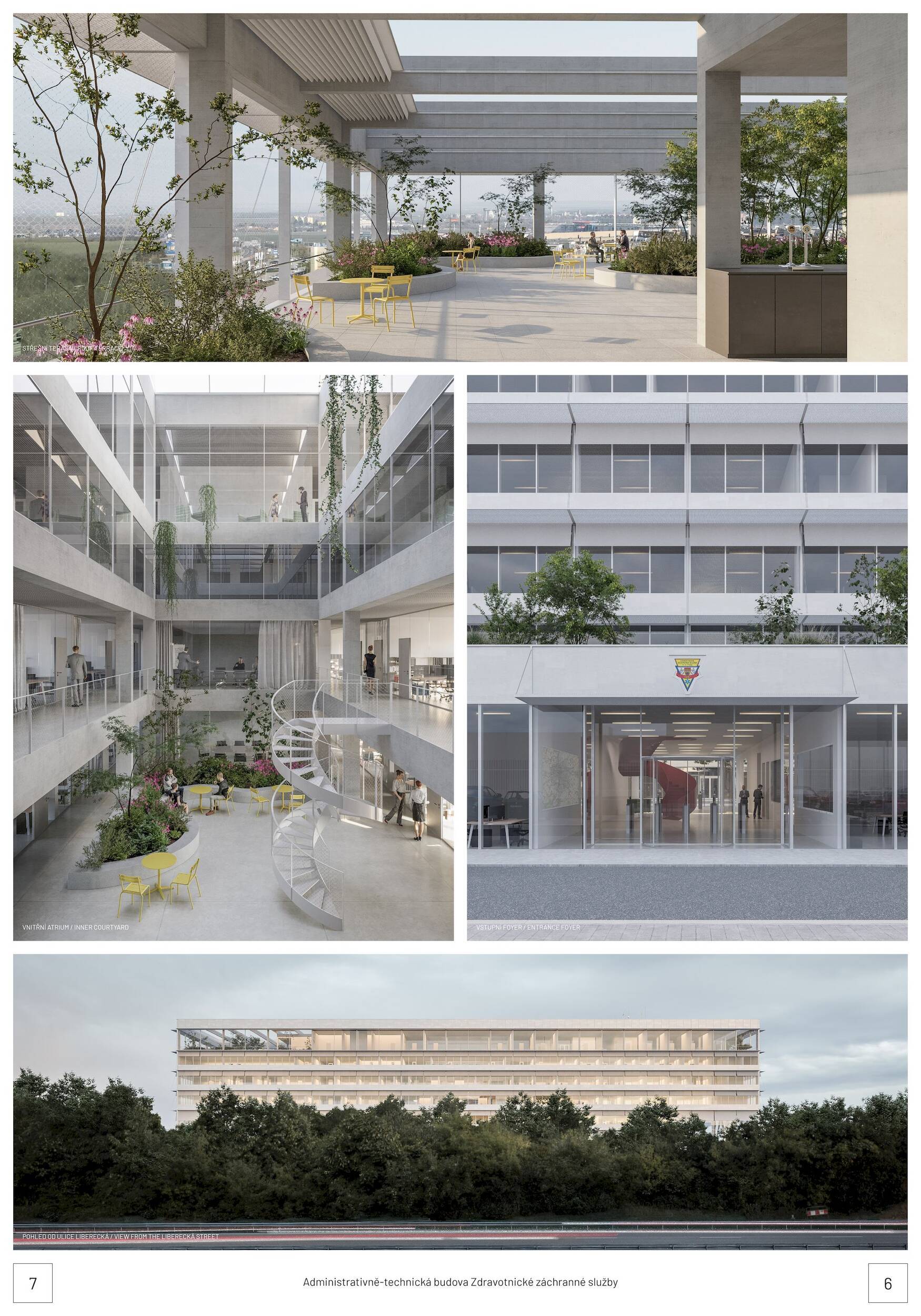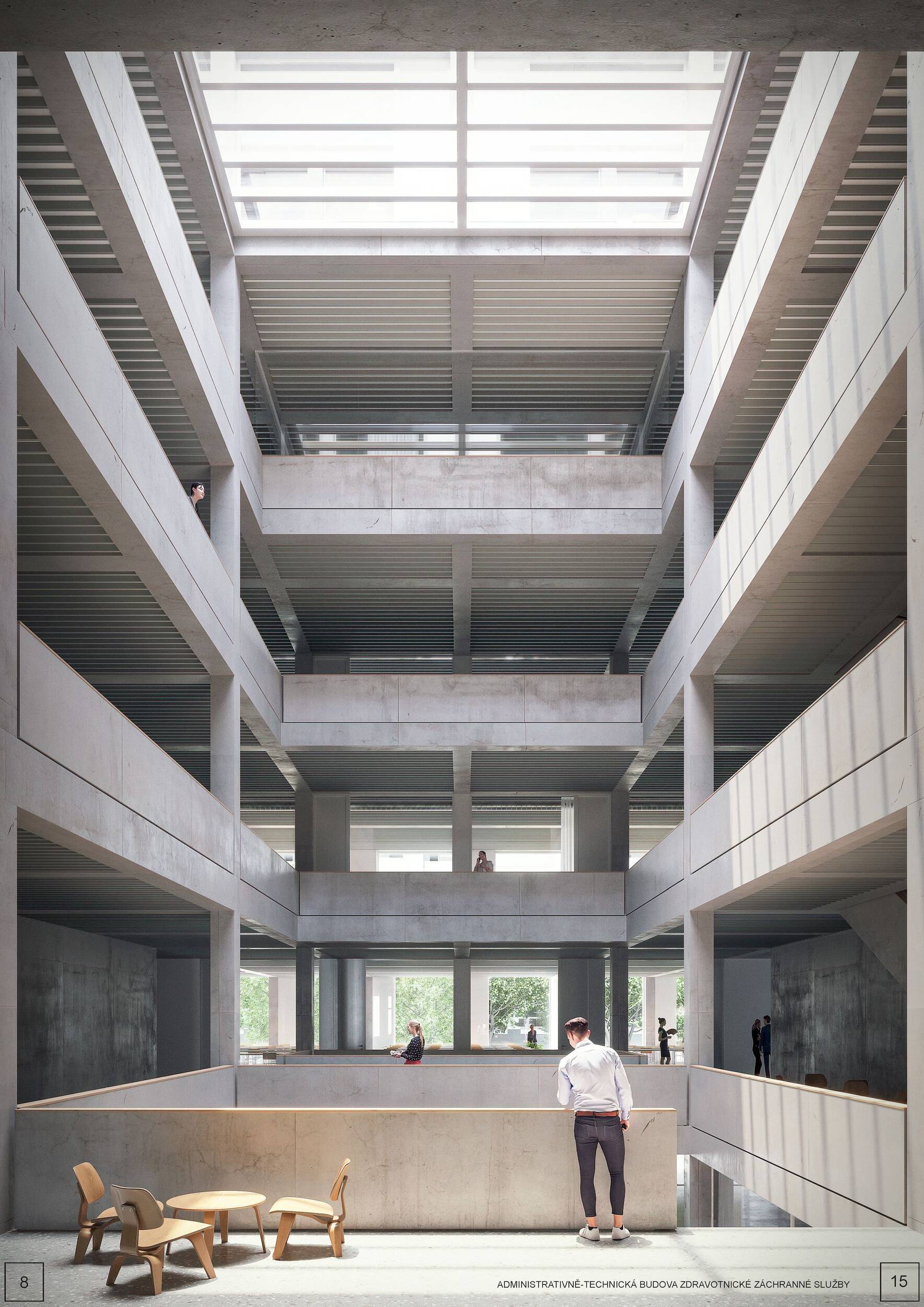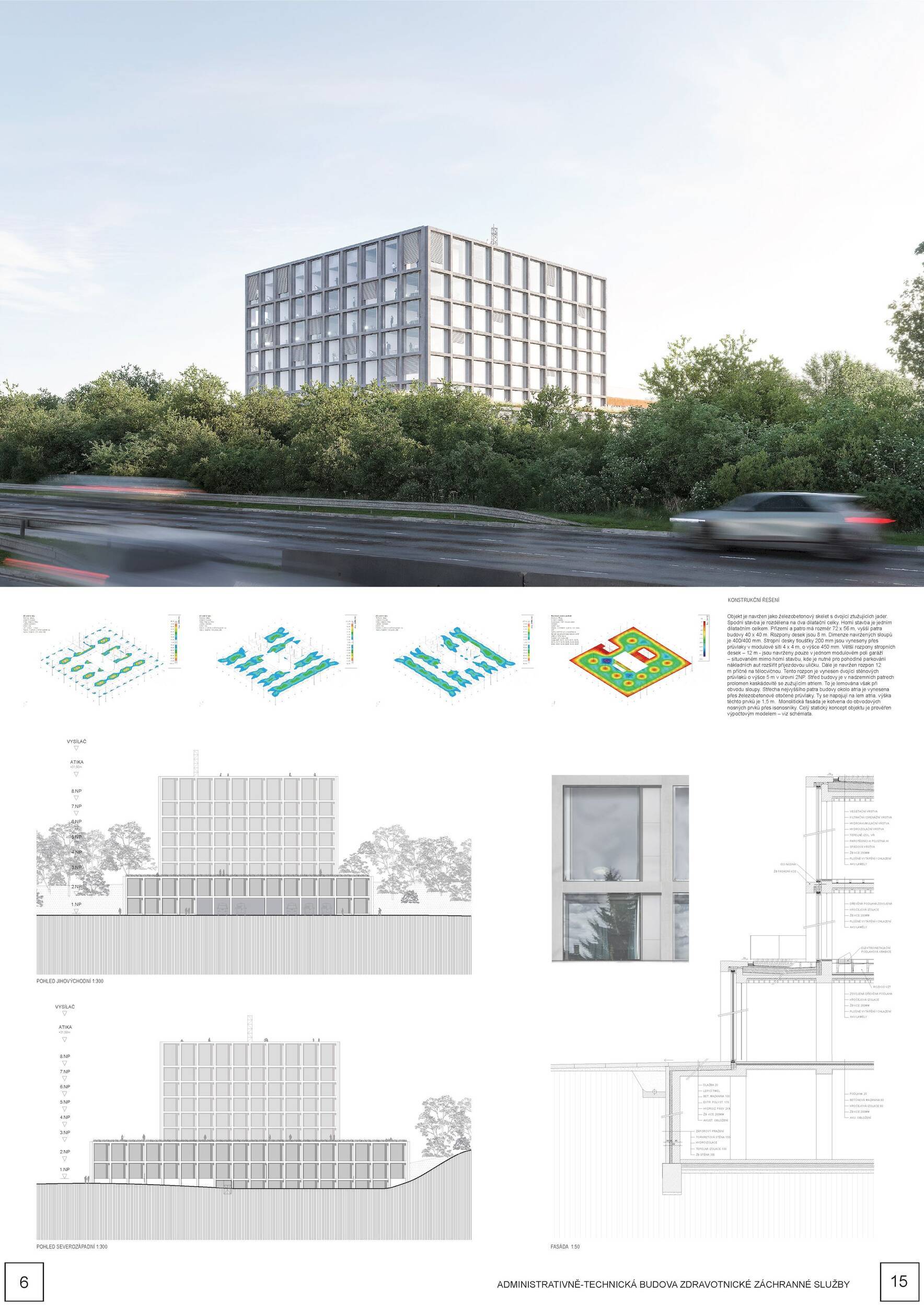 Budova pro Zdravotnickou záchrannou službu v Praze je charakterizována mnoha funkčními sekcemi s různými požadavky na prostor, světlo a velikost. Ty dohromady tvoří jednu instituci, ve které je každá její část klíčová pro efektivní a bezproblémové fungování celku. Návrh klade důraz na tuto specifickou stránku programu a navrhuje budovu fungující na základě opakující se subtilní a zároveň flexibilní struktury. Konstrukce budovy funguje jako kostra, do které jsou umístěny místnosti a funkce různých sekcí. Plné objemy propojují tři krytá atria, vytvářející vnitřní svět pro celou instituci Zdravotnické záchranné služby.