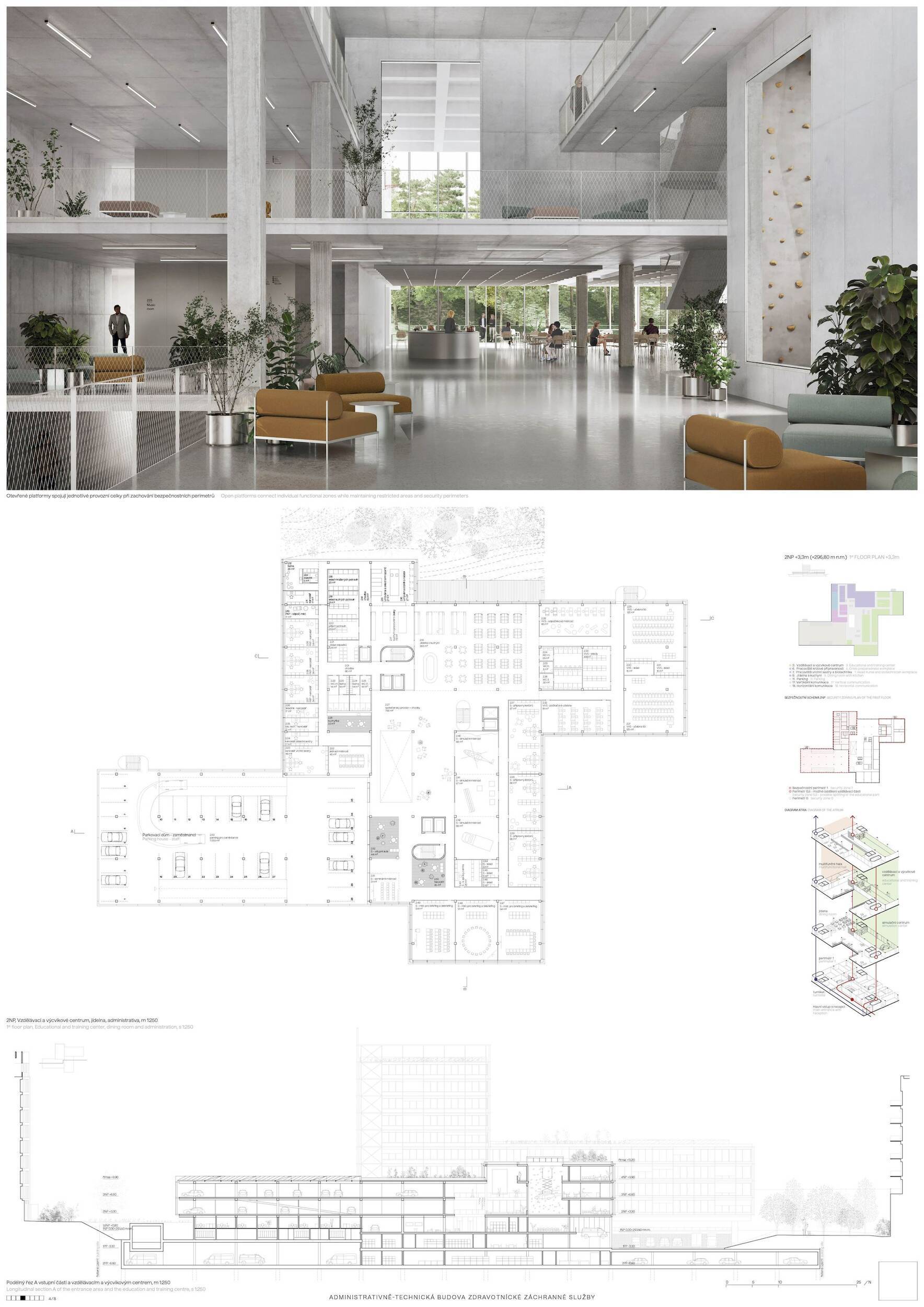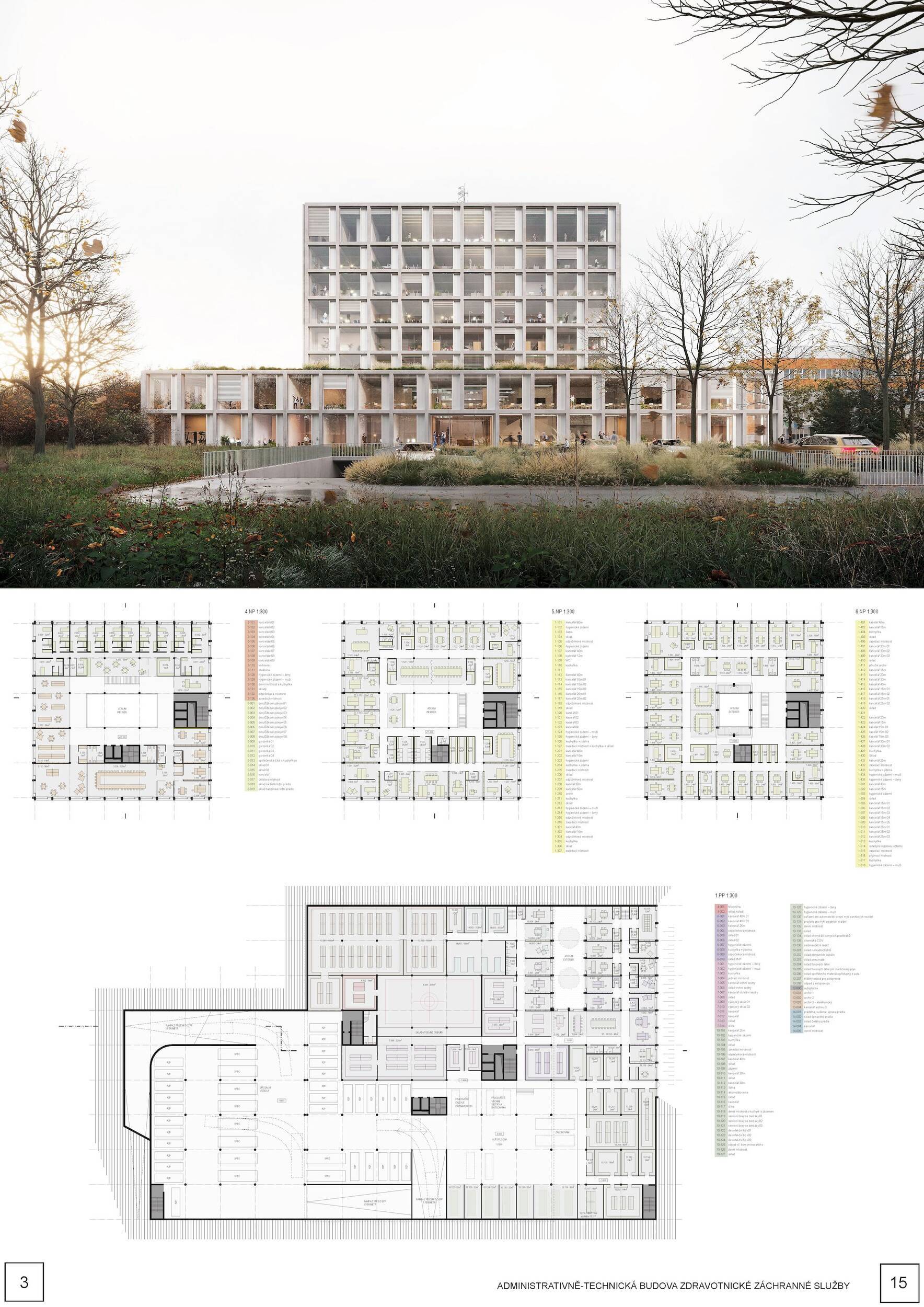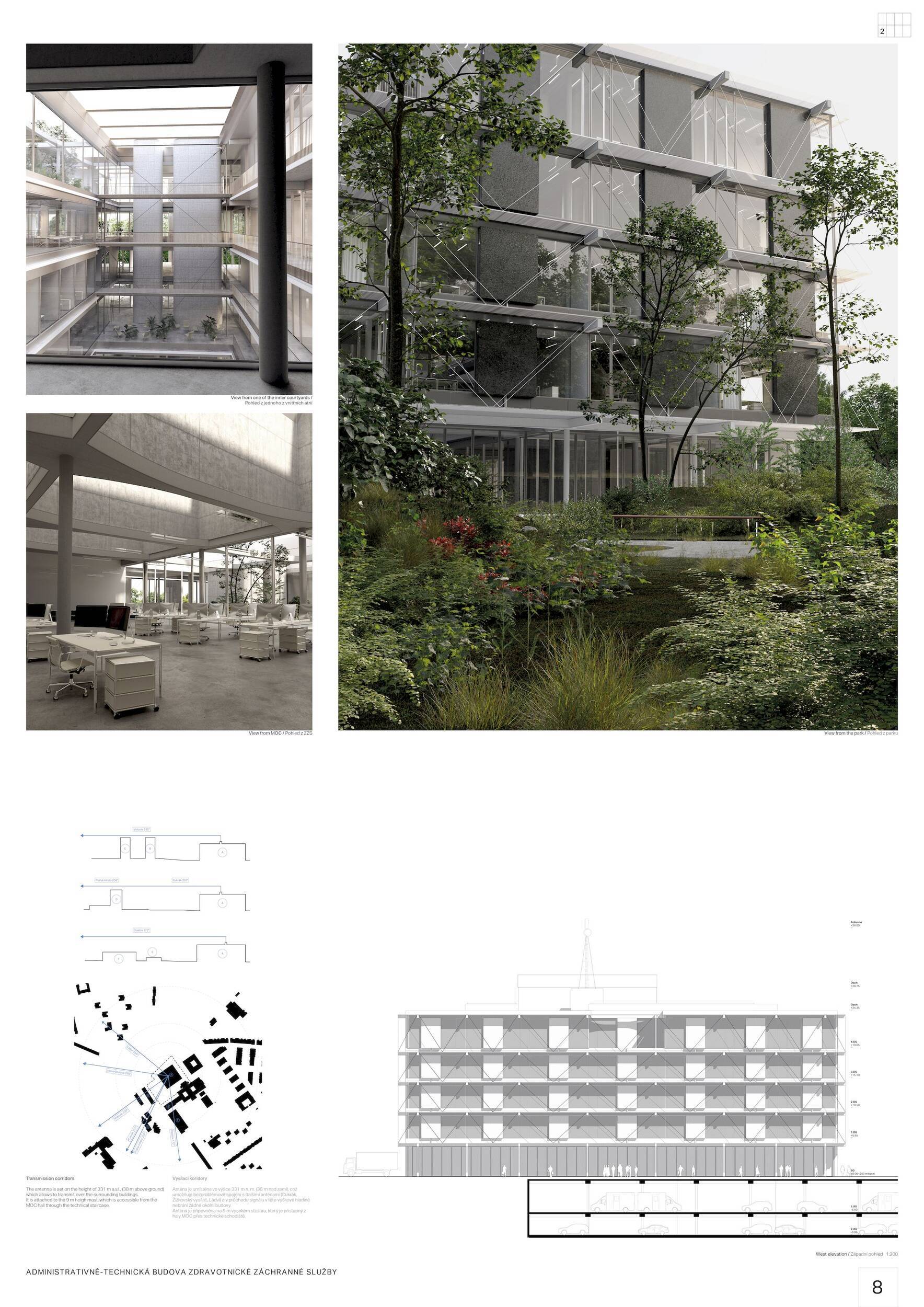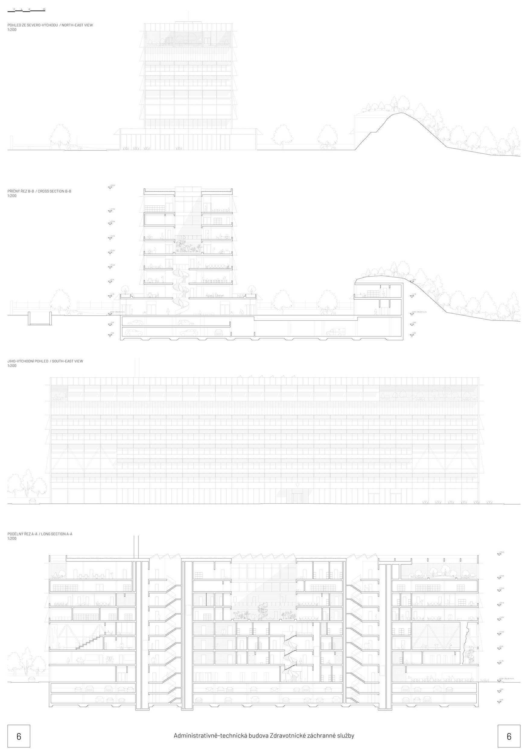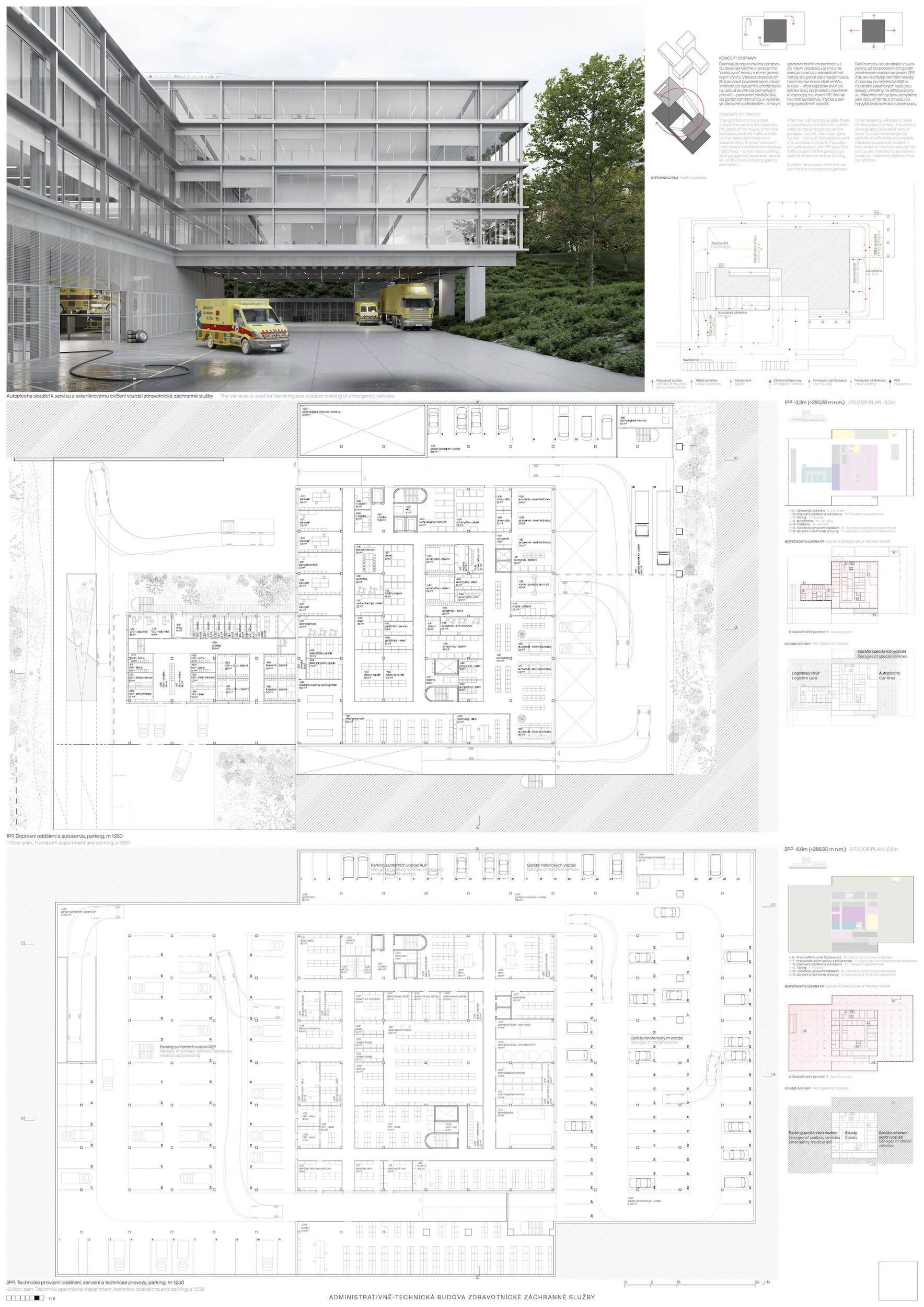 Budova pro Zdravotnickou záchrannou službu v Praze je charakterizována mnoha funkčními sekcemi s různými požadavky na prostor, světlo a velikost. Ty dohromady tvoří jednu instituci, ve které je každá její část klíčová pro efektivní a bezproblémové fungování celku. Návrh klade důraz na tuto specifickou stránku programu a navrhuje budovu fungující na základě opakující se subtilní a zároveň flexibilní struktury. Konstrukce budovy funguje jako kostra, do které jsou umístěny místnosti a funkce různých sekcí. Plné objemy propojují tři krytá atria, vytvářející vnitřní svět pro celou instituci Zdravotnické záchranné služby.