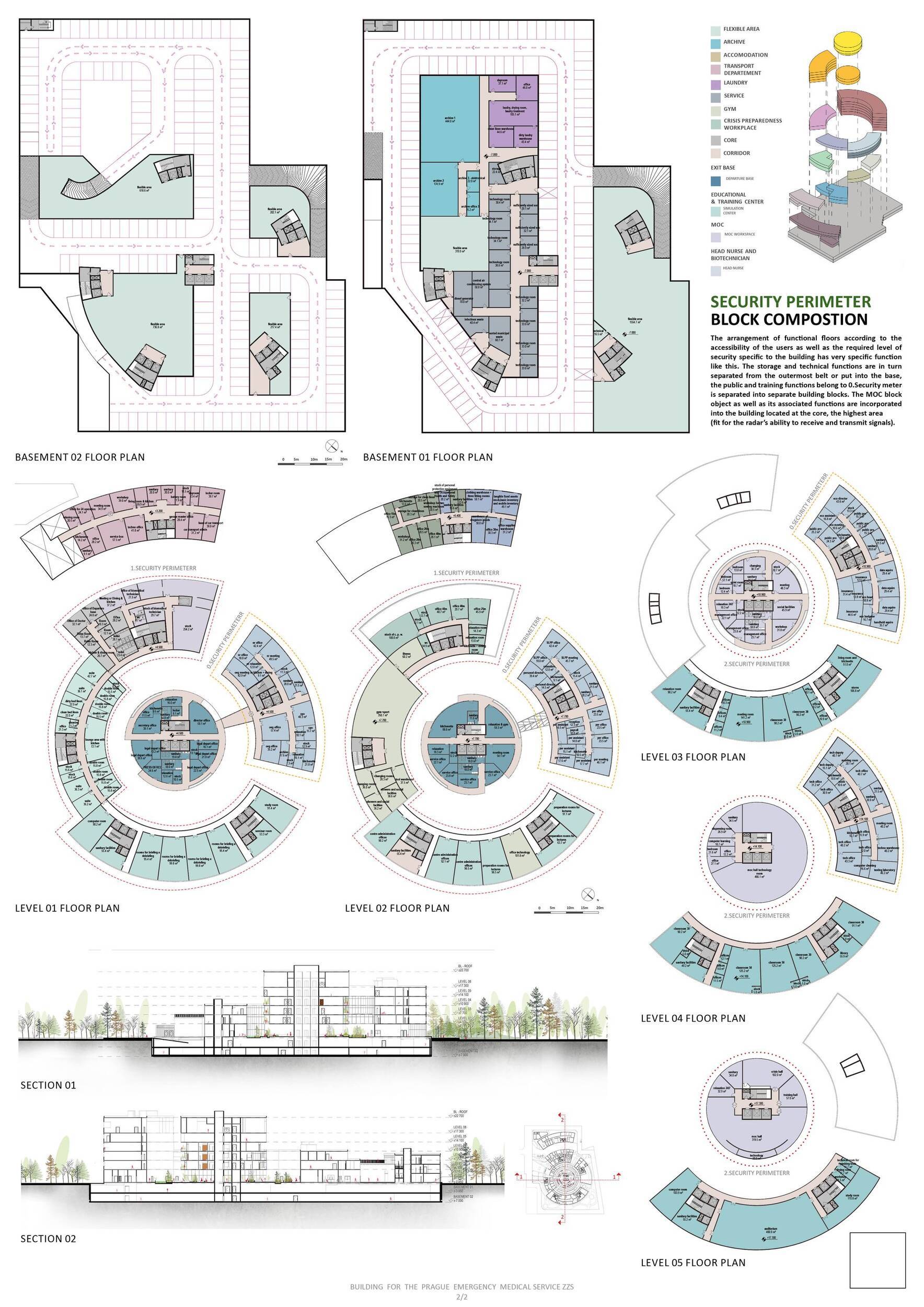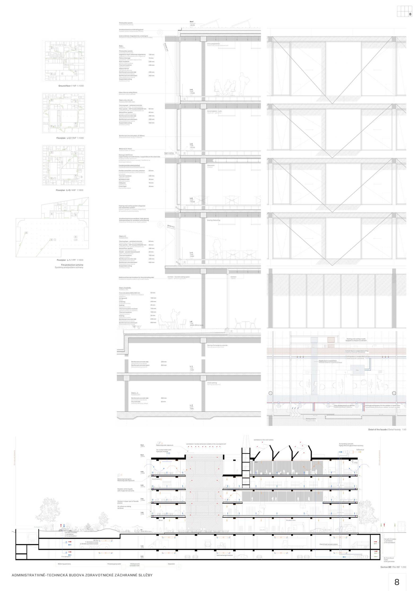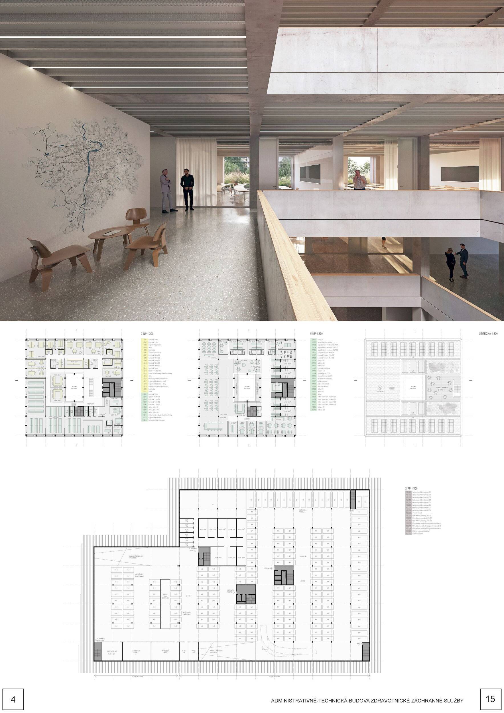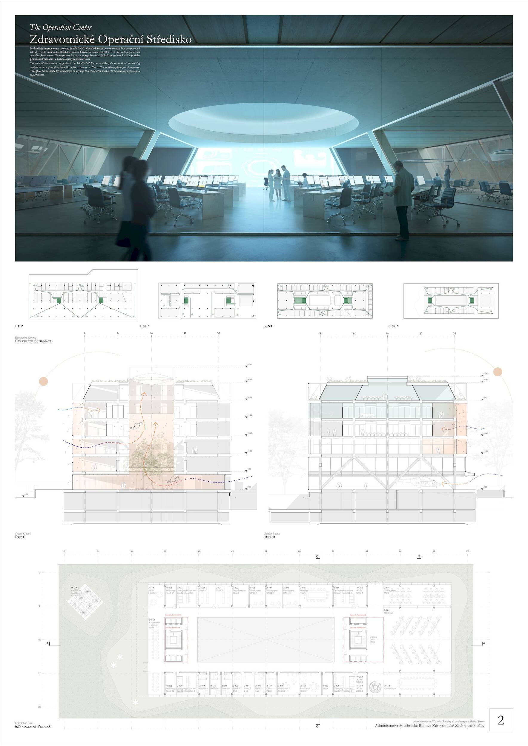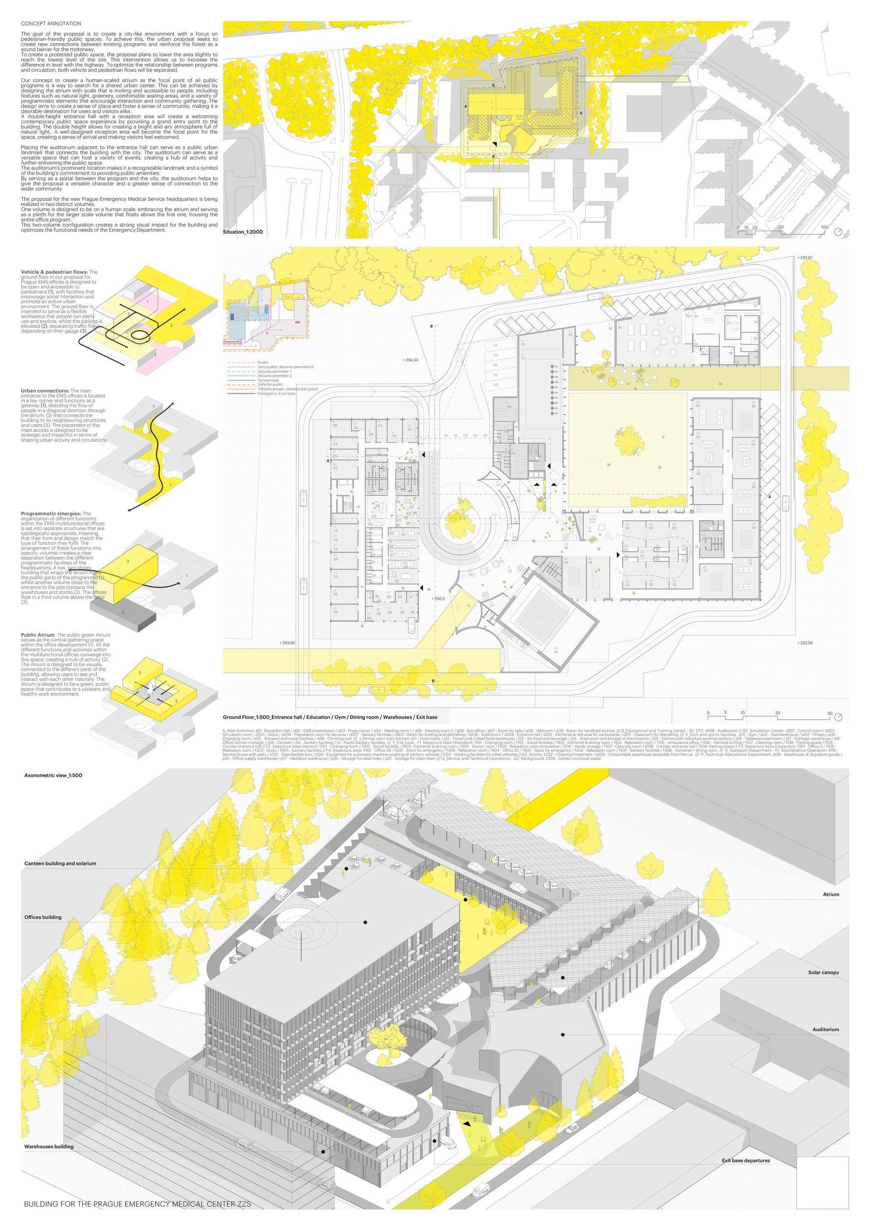 Budova pro Zdravotnickou záchrannou službu v Praze je charakterizována mnoha funkčními sekcemi s různými požadavky na prostor, světlo a velikost. Ty dohromady tvoří jednu instituci, ve které je každá její část klíčová pro efektivní a bezproblémové fungování celku. Návrh klade důraz na tuto specifickou stránku programu a navrhuje budovu fungující na základě opakující se subtilní a zároveň flexibilní struktury. Konstrukce budovy funguje jako kostra, do které jsou umístěny místnosti a funkce různých sekcí. Plné objemy propojují tři krytá atria, vytvářející vnitřní svět pro celou instituci Zdravotnické záchranné služby.