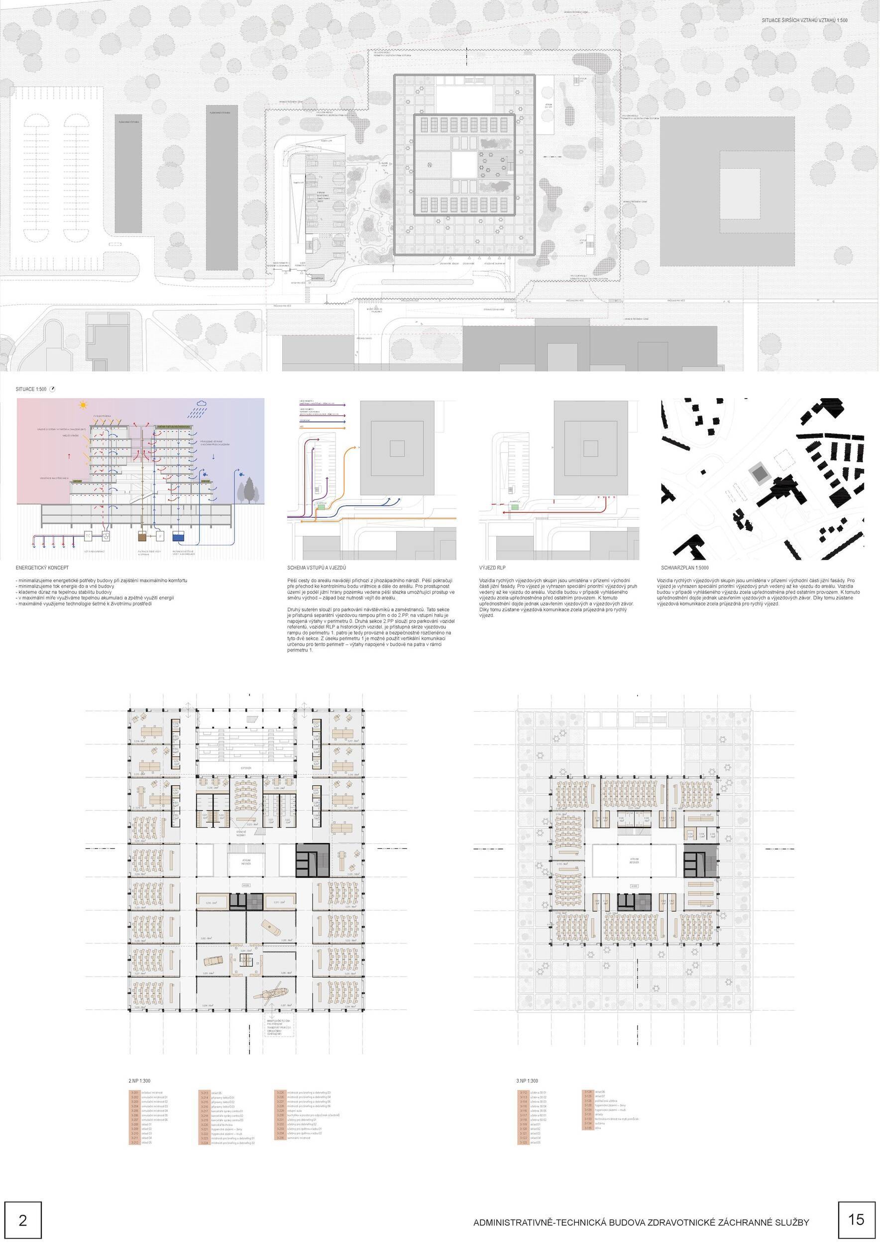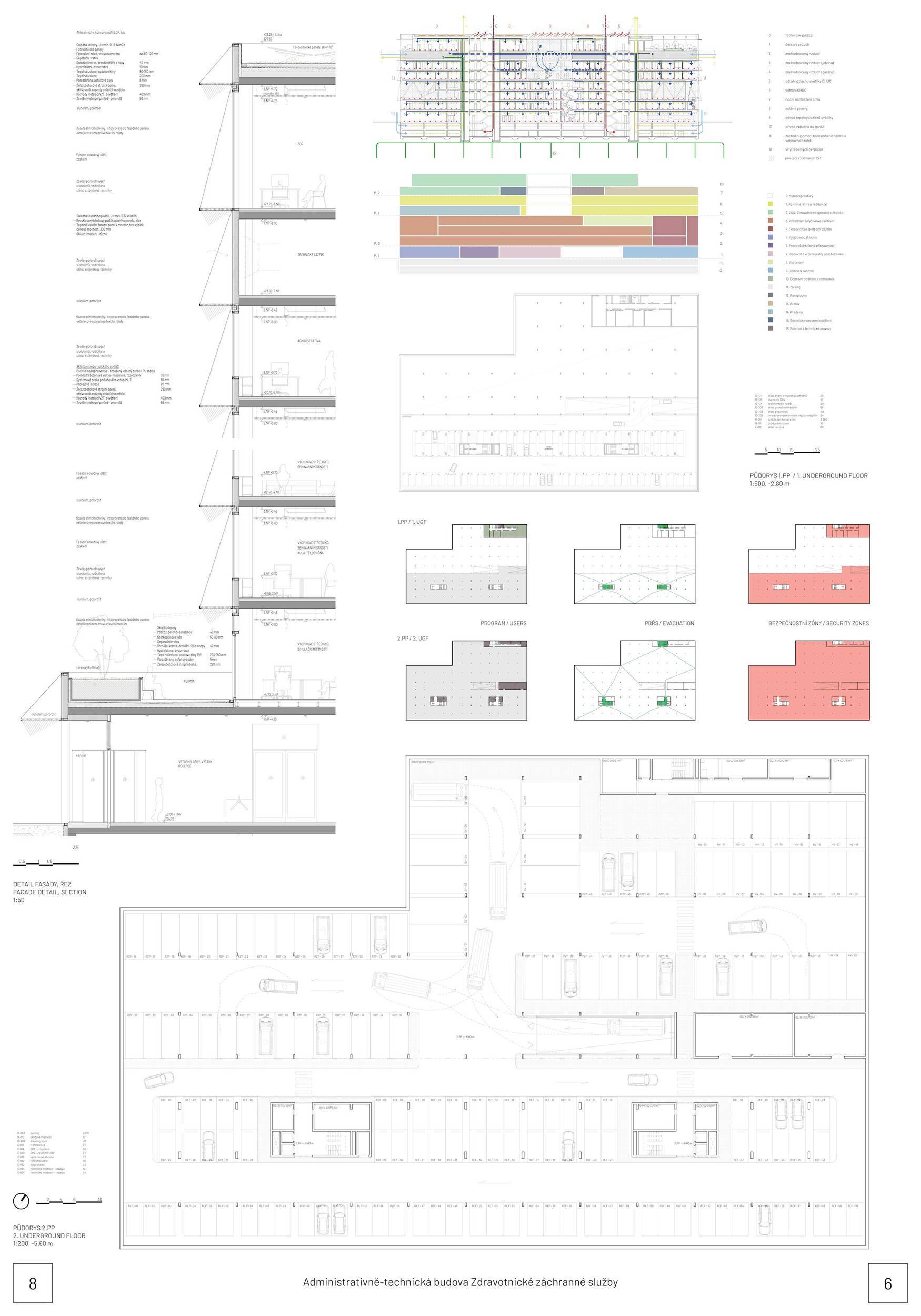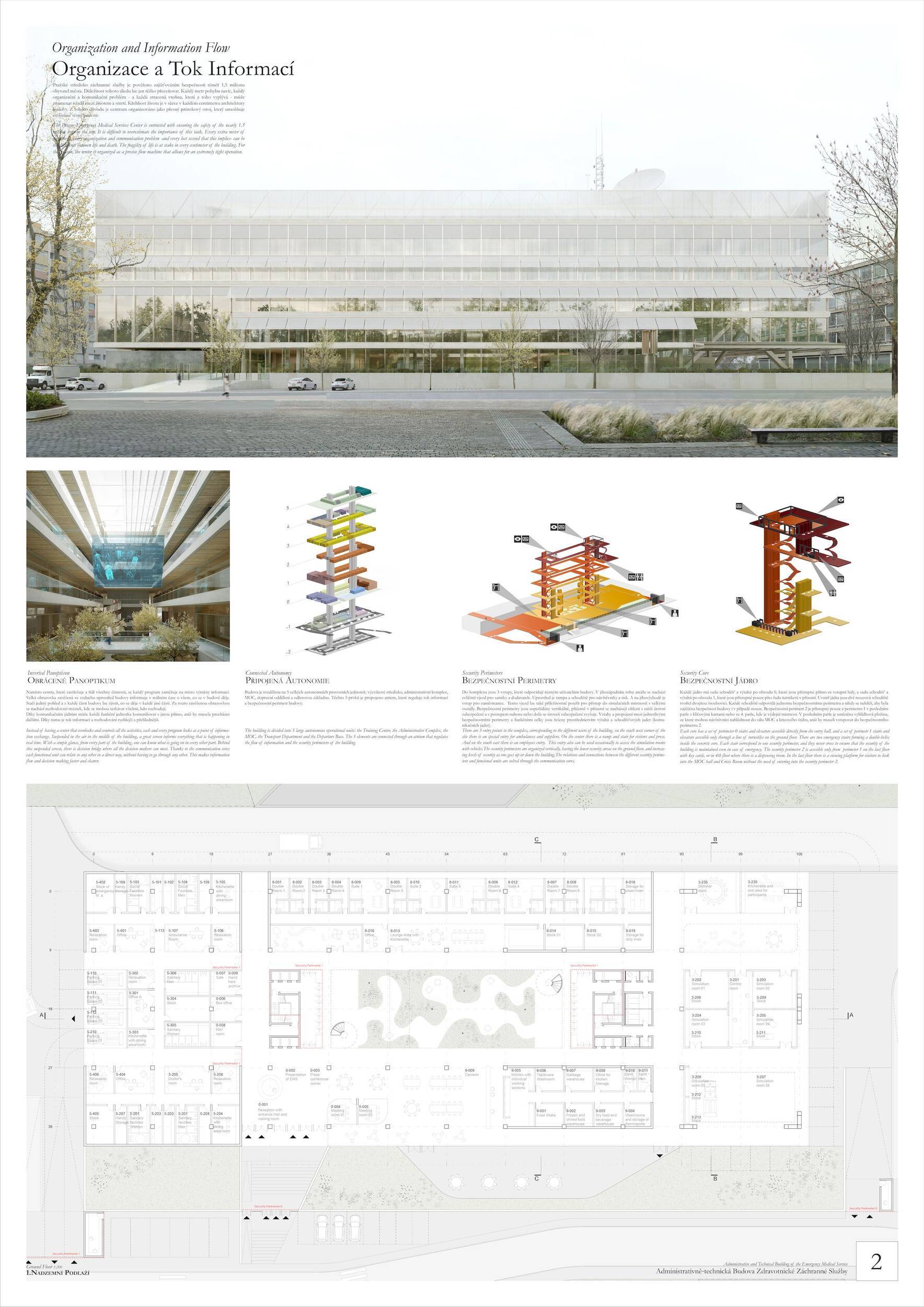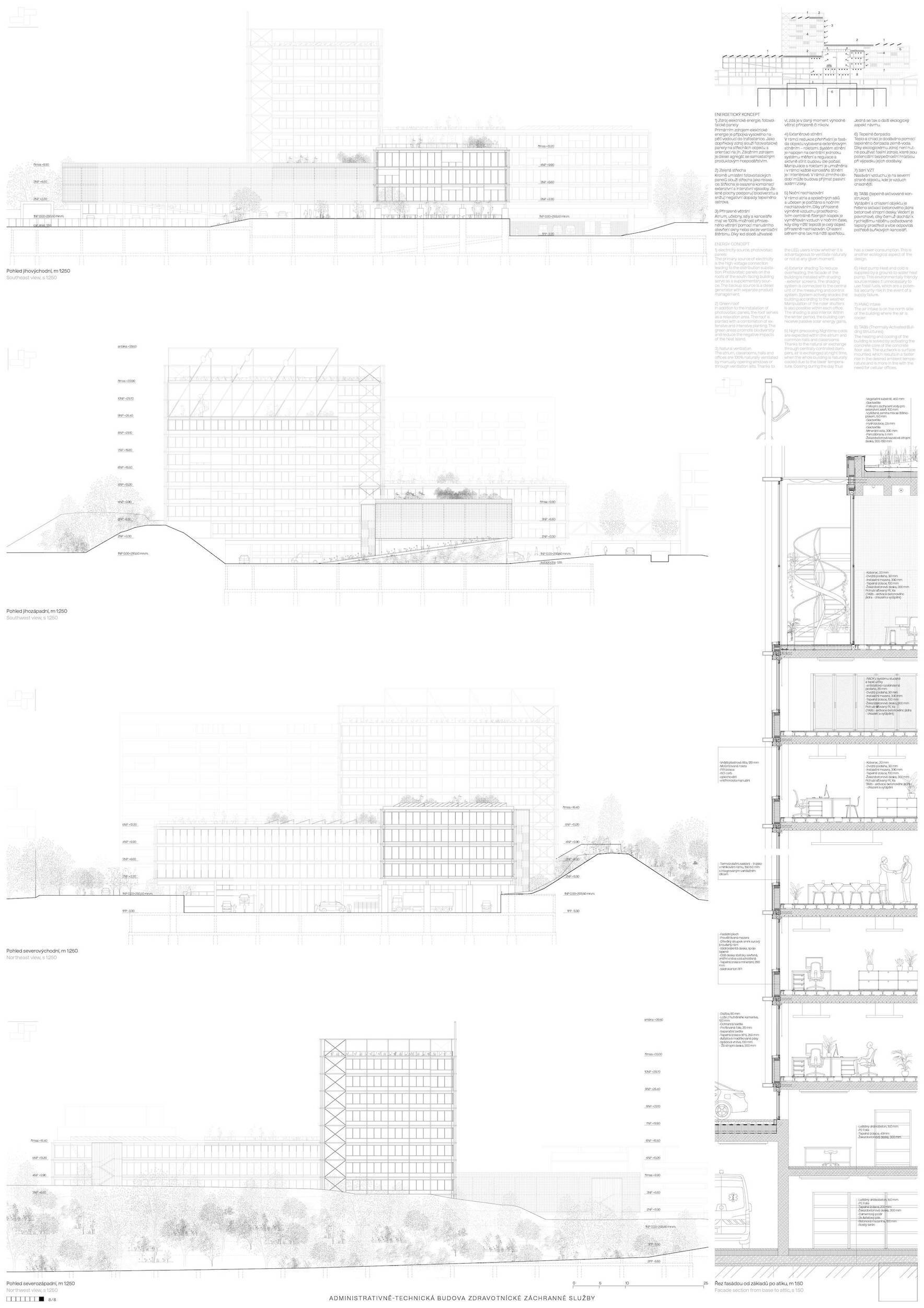 Budova pro Zdravotnickou záchrannou službu v Praze je charakterizována mnoha funkčními sekcemi s různými požadavky na prostor, světlo a velikost. Ty dohromady tvoří jednu instituci, ve které je každá její část klíčová pro efektivní a bezproblémové fungování celku. Návrh klade důraz na tuto specifickou stránku programu a navrhuje budovu fungující na základě opakující se subtilní a zároveň flexibilní struktury. Konstrukce budovy funguje jako kostra, do které jsou umístěny místnosti a funkce různých sekcí. Plné objemy propojují tři krytá atria, vytvářející vnitřní svět pro celou instituci Zdravotnické záchranné služby.