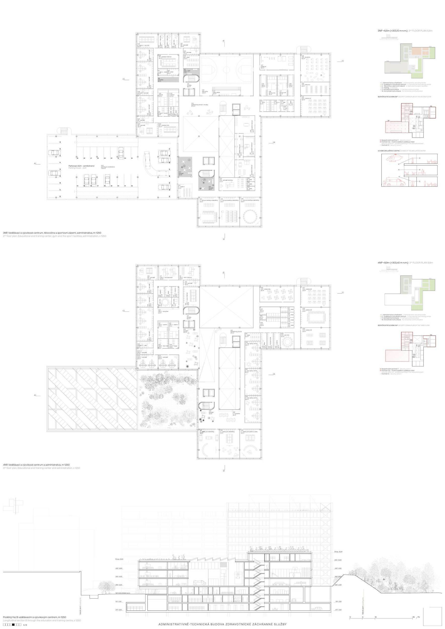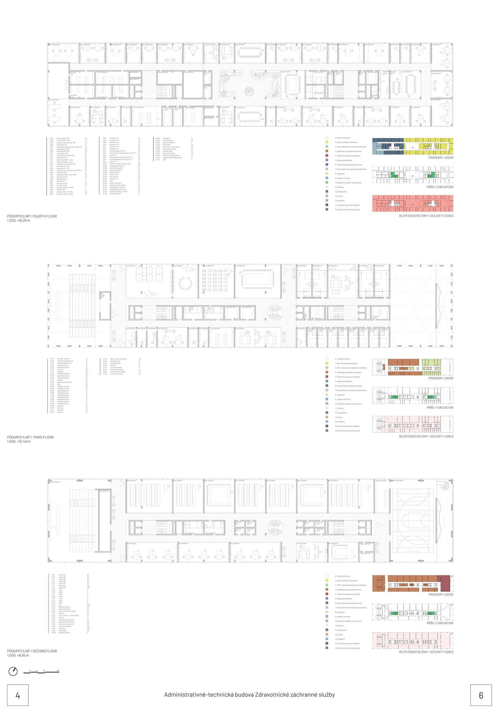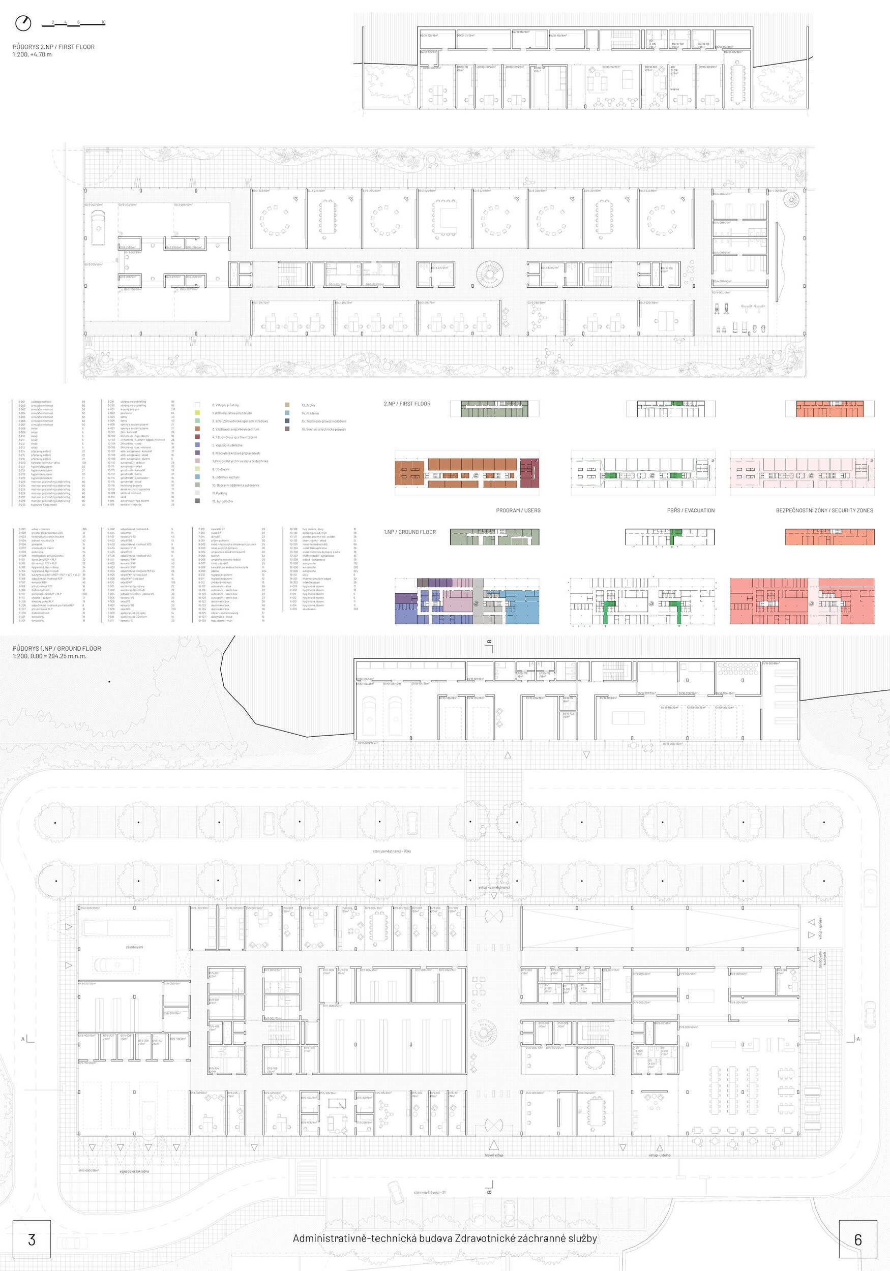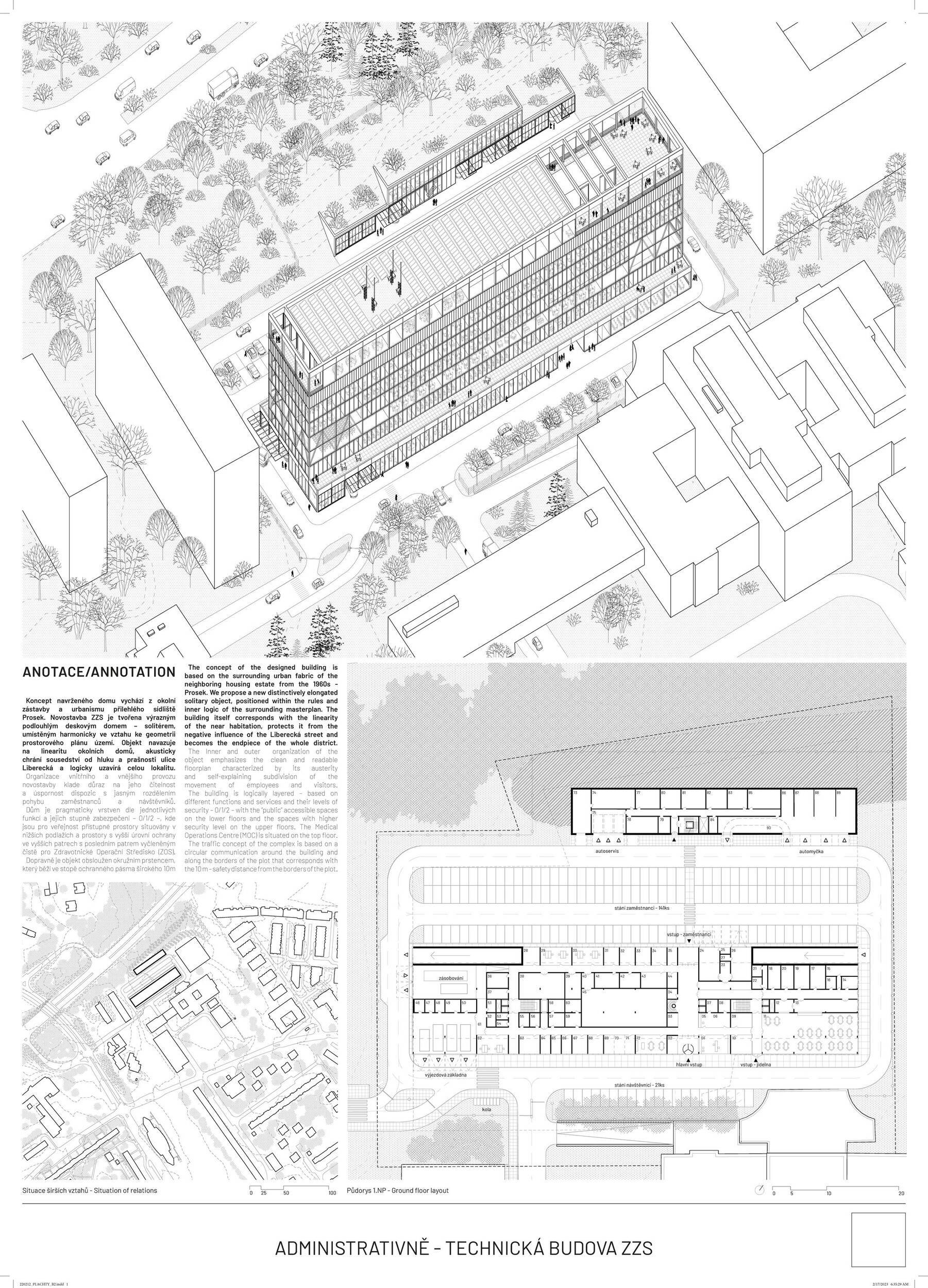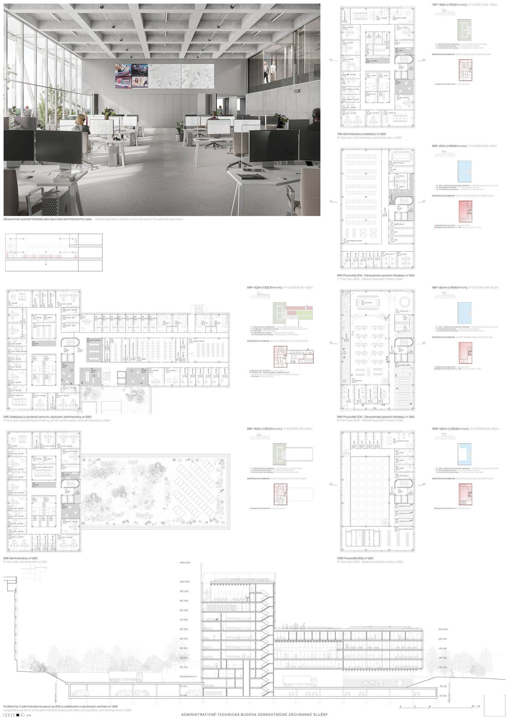 Budova pro Zdravotnickou záchrannou službu v Praze je charakterizována mnoha funkčními sekcemi s různými požadavky na prostor, světlo a velikost. Ty dohromady tvoří jednu instituci, ve které je každá její část klíčová pro efektivní a bezproblémové fungování celku. Návrh klade důraz na tuto specifickou stránku programu a navrhuje budovu fungující na základě opakující se subtilní a zároveň flexibilní struktury. Konstrukce budovy funguje jako kostra, do které jsou umístěny místnosti a funkce různých sekcí. Plné objemy propojují tři krytá atria, vytvářející vnitřní svět pro celou instituci Zdravotnické záchranné služby.
