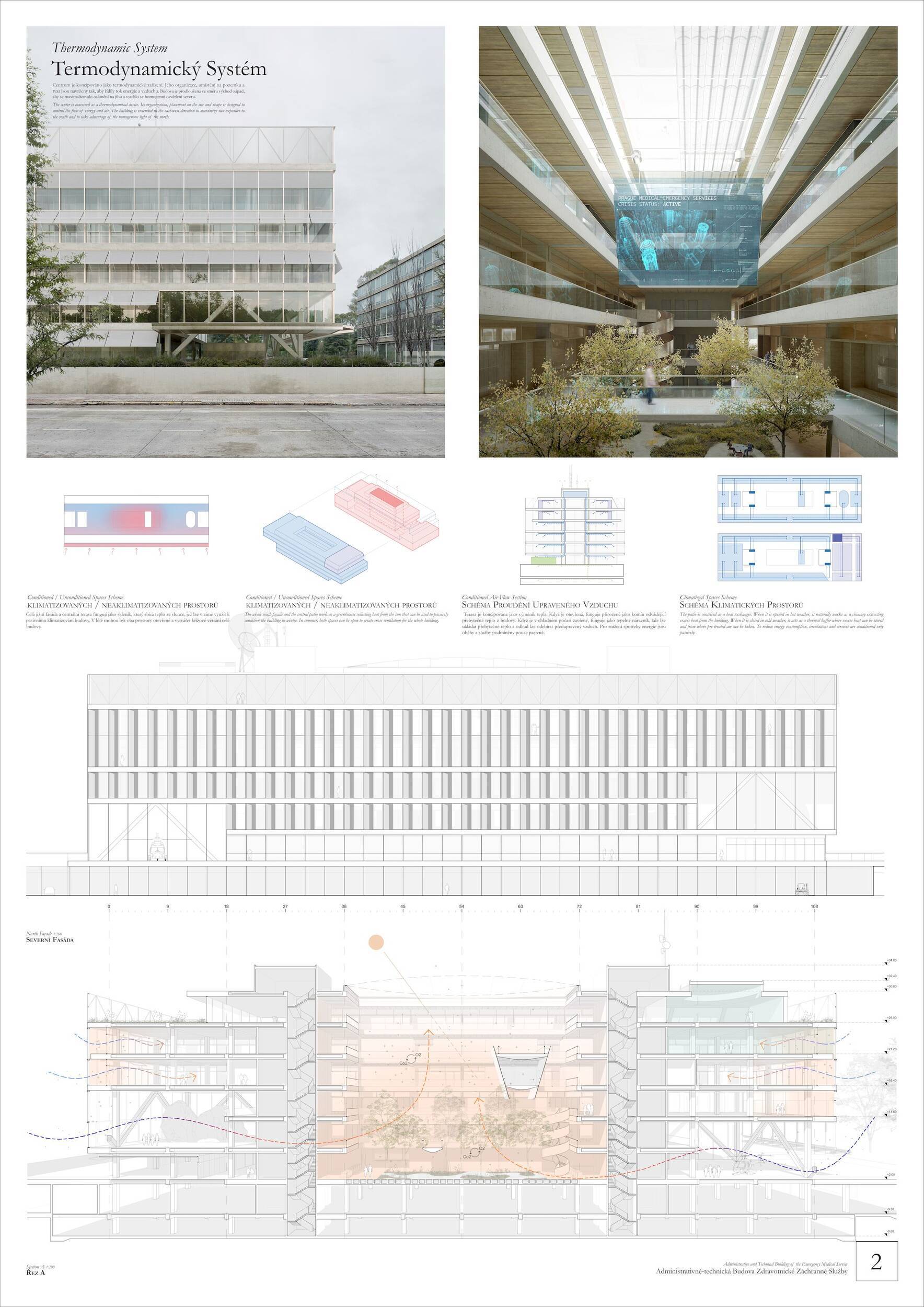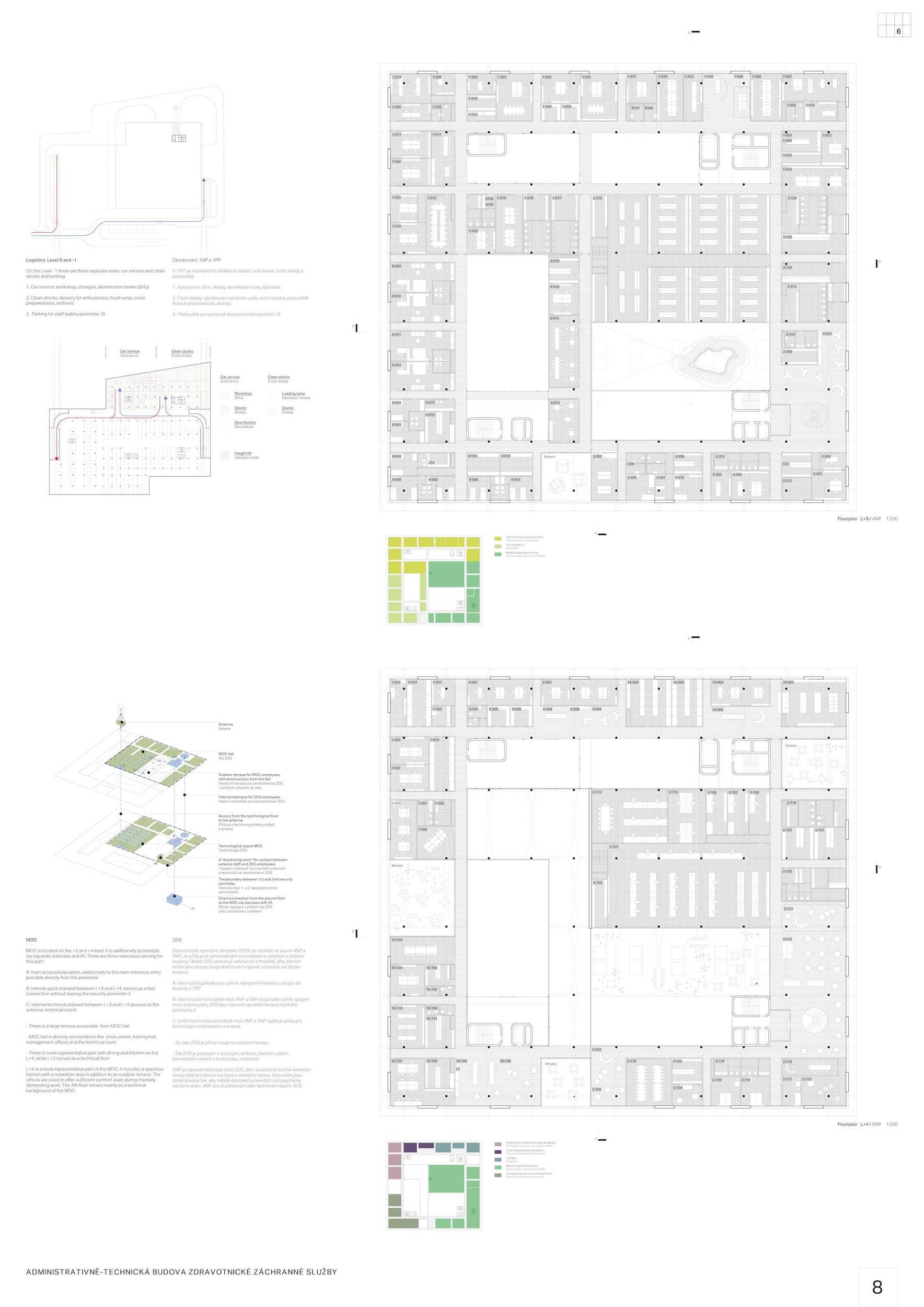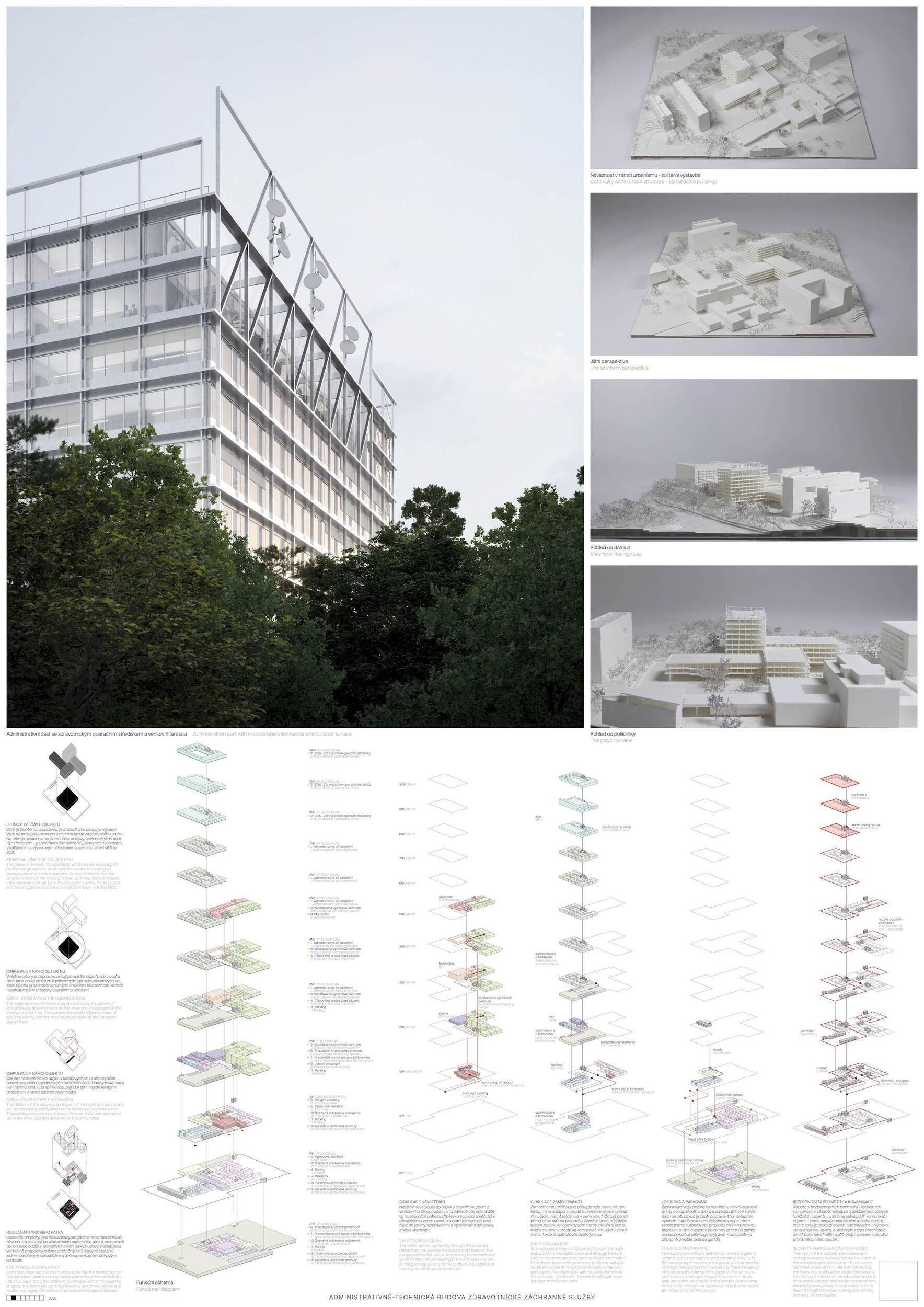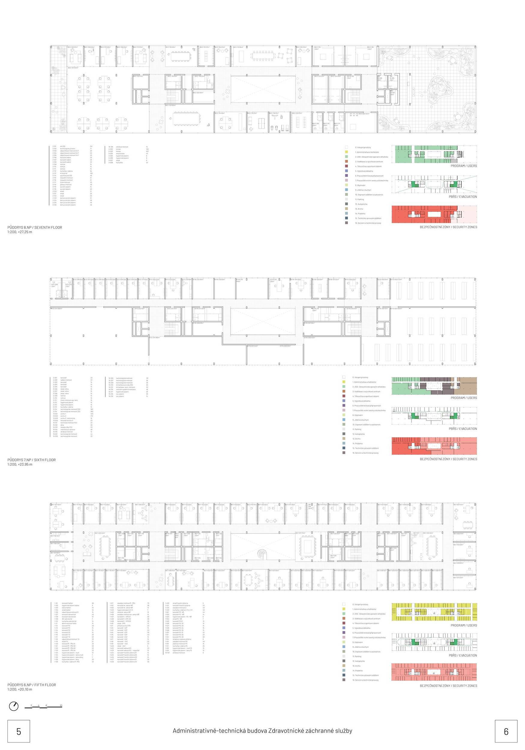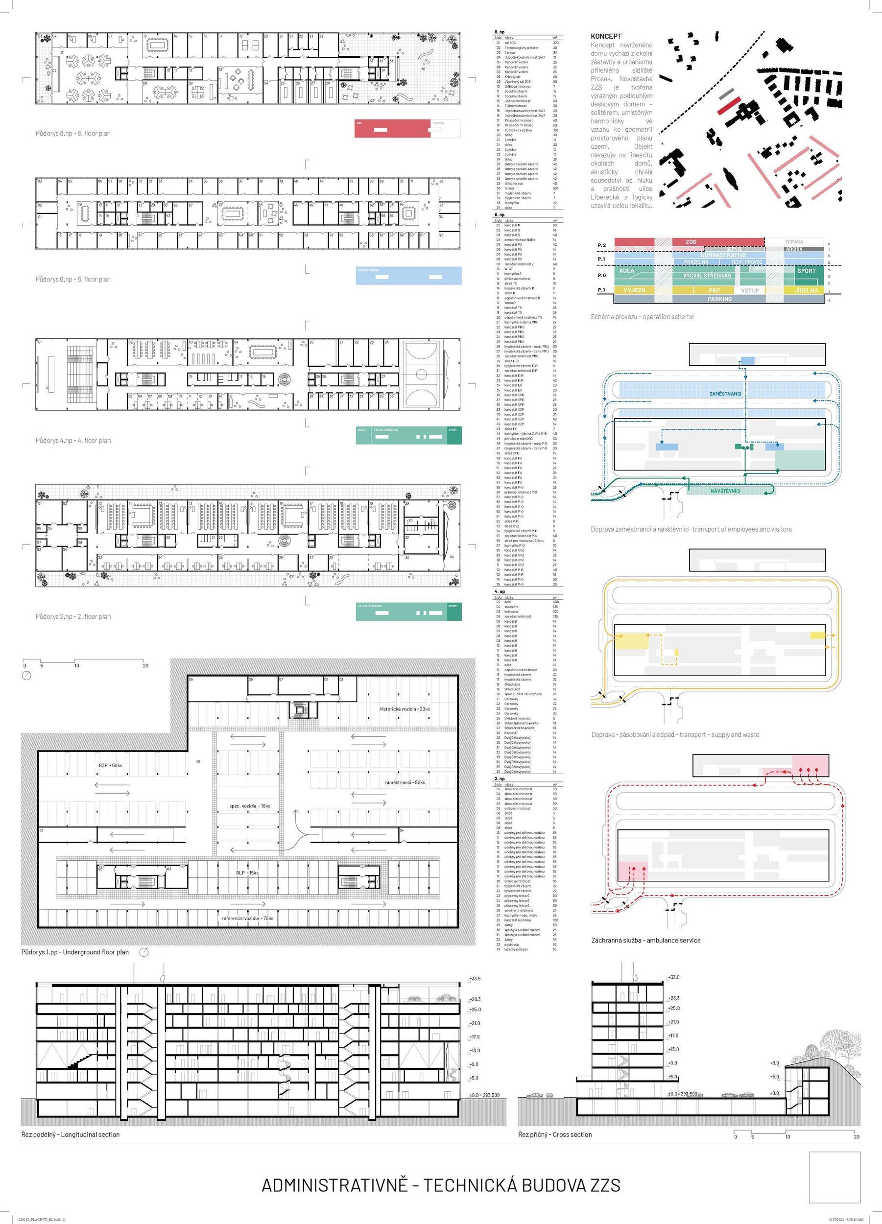 Budova pro Zdravotnickou záchrannou službu v Praze je charakterizována mnoha funkčními sekcemi s různými požadavky na prostor, světlo a velikost. Ty dohromady tvoří jednu instituci, ve které je každá její část klíčová pro efektivní a bezproblémové fungování celku. Návrh klade důraz na tuto specifickou stránku programu a navrhuje budovu fungující na základě opakující se subtilní a zároveň flexibilní struktury. Konstrukce budovy funguje jako kostra, do které jsou umístěny místnosti a funkce různých sekcí. Plné objemy propojují tři krytá atria, vytvářející vnitřní svět pro celou instituci Zdravotnické záchranné služby.