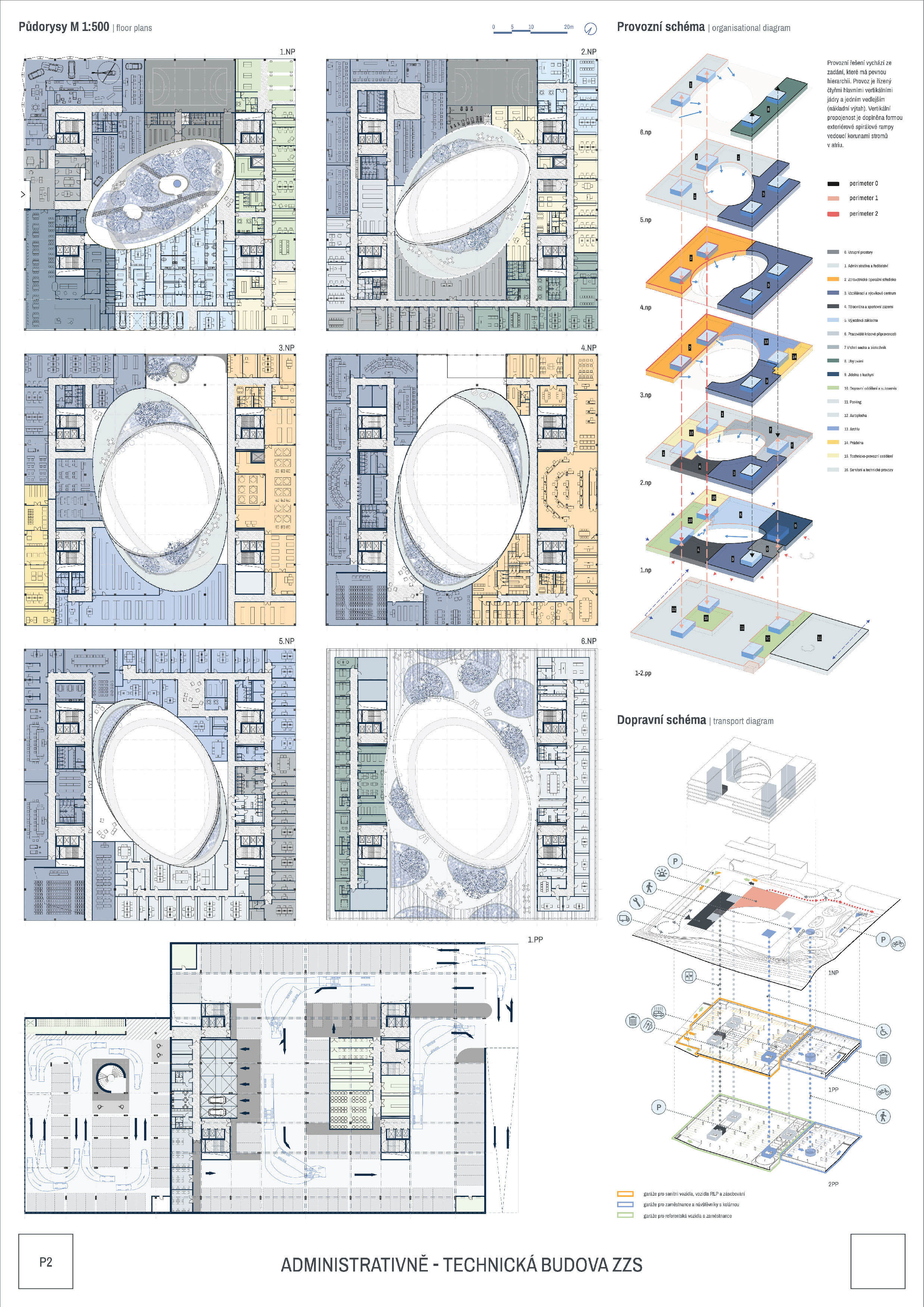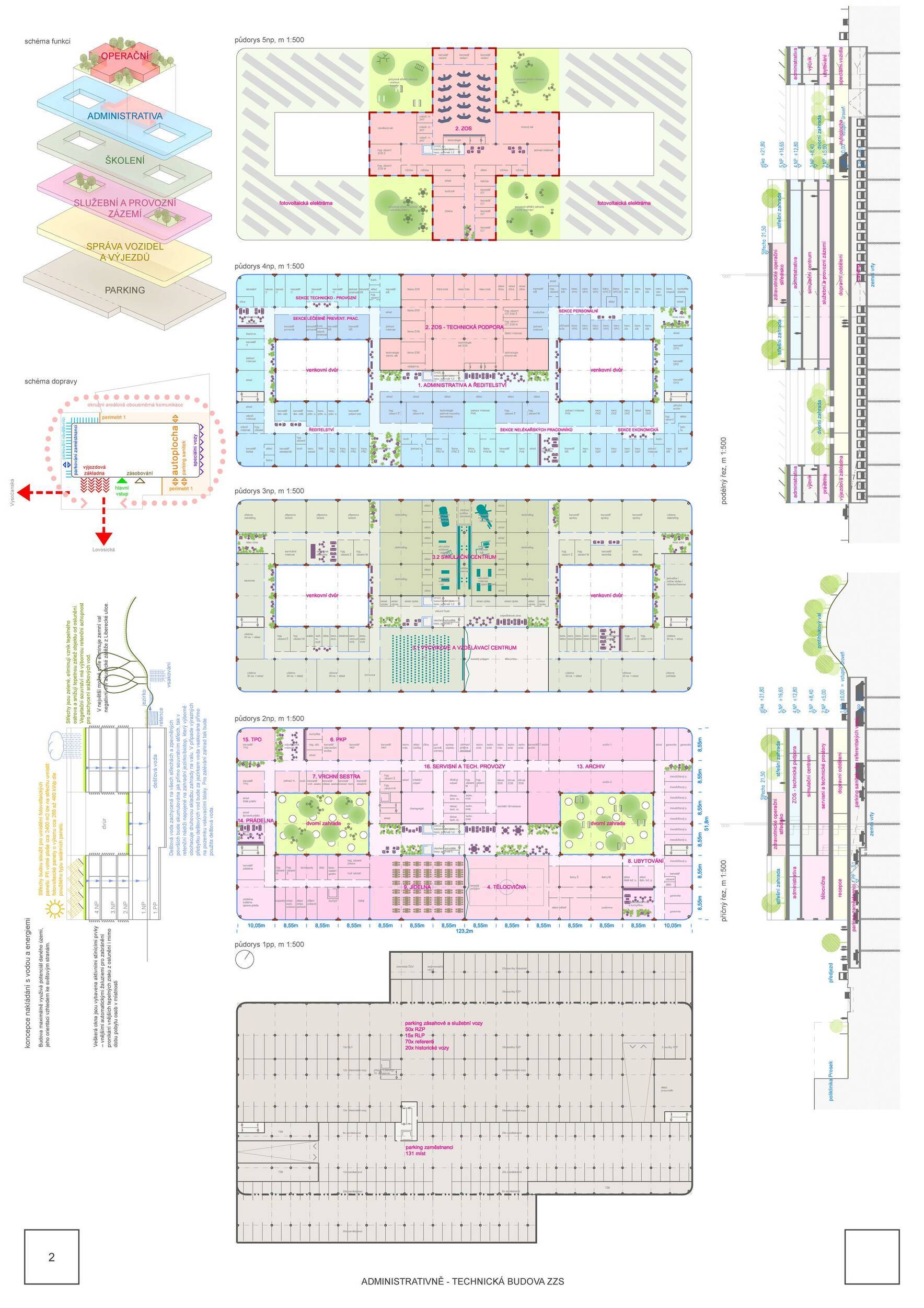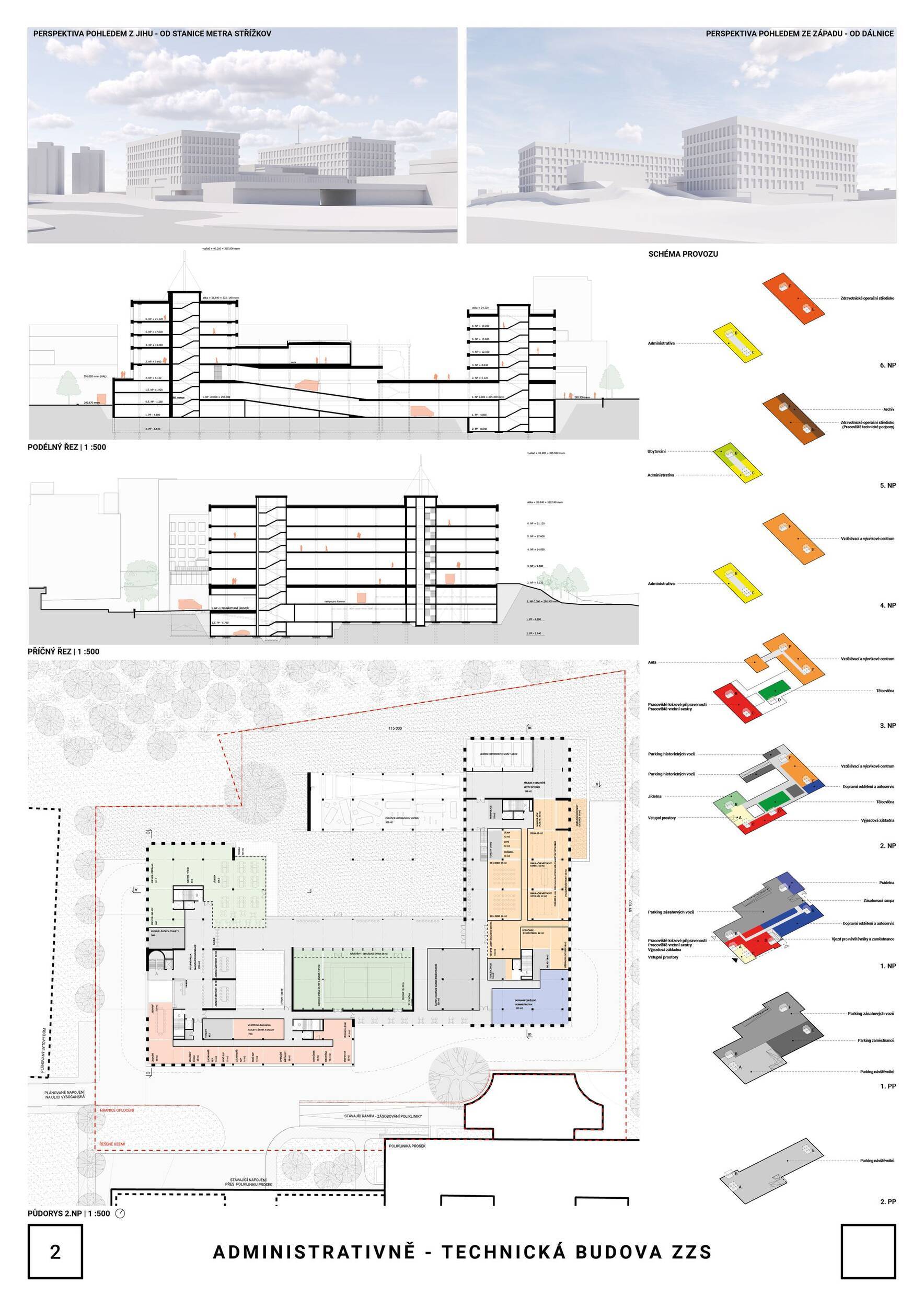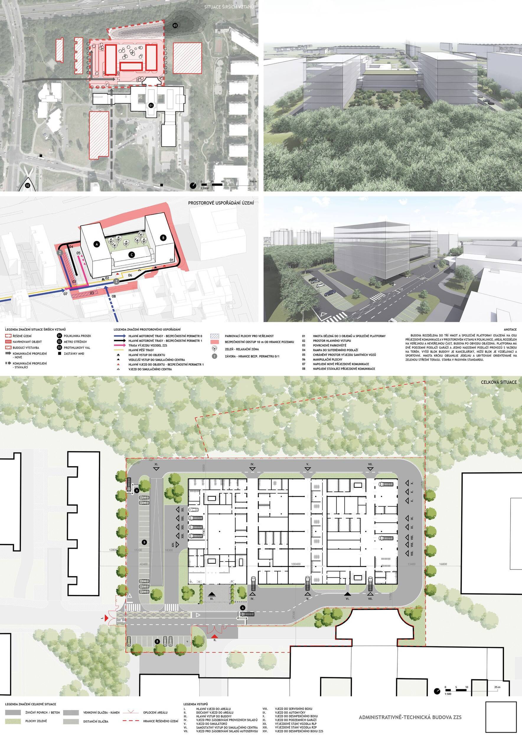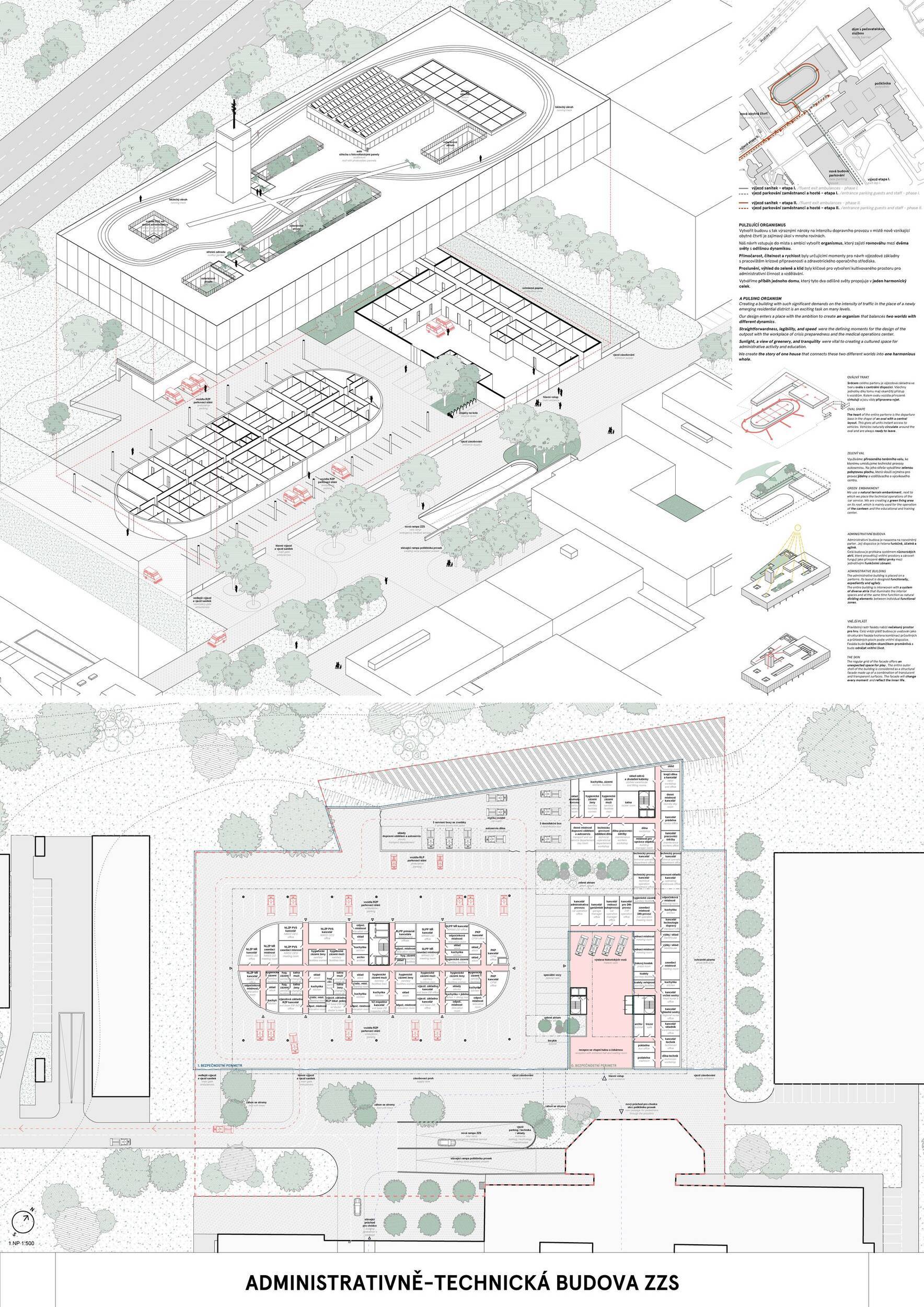 Administrativně-technická budova ZZS bude primárním zázemím všech pražských výjezdových skupin zdravotnické záchranné služby, stěžejní součástí návrhu je tedy pro nás téma „komunikace“. Ať už jde o komunikaci virtuální, provozní, či mezilidskou, ve všech případech má potenciál zachraňovat lidské životy. Bezpečná, chytrá a efektivní organizace domu se tedy stala zásadním předpokladem návrhu. Odpovědí je motiv spirály, která stoupá po jednotlivých bezpečnostních stupních programu a tvoří tak základní páteř pro organizaci provozu celého domu.
