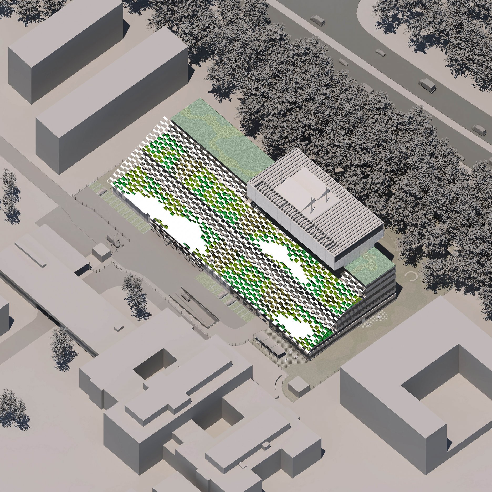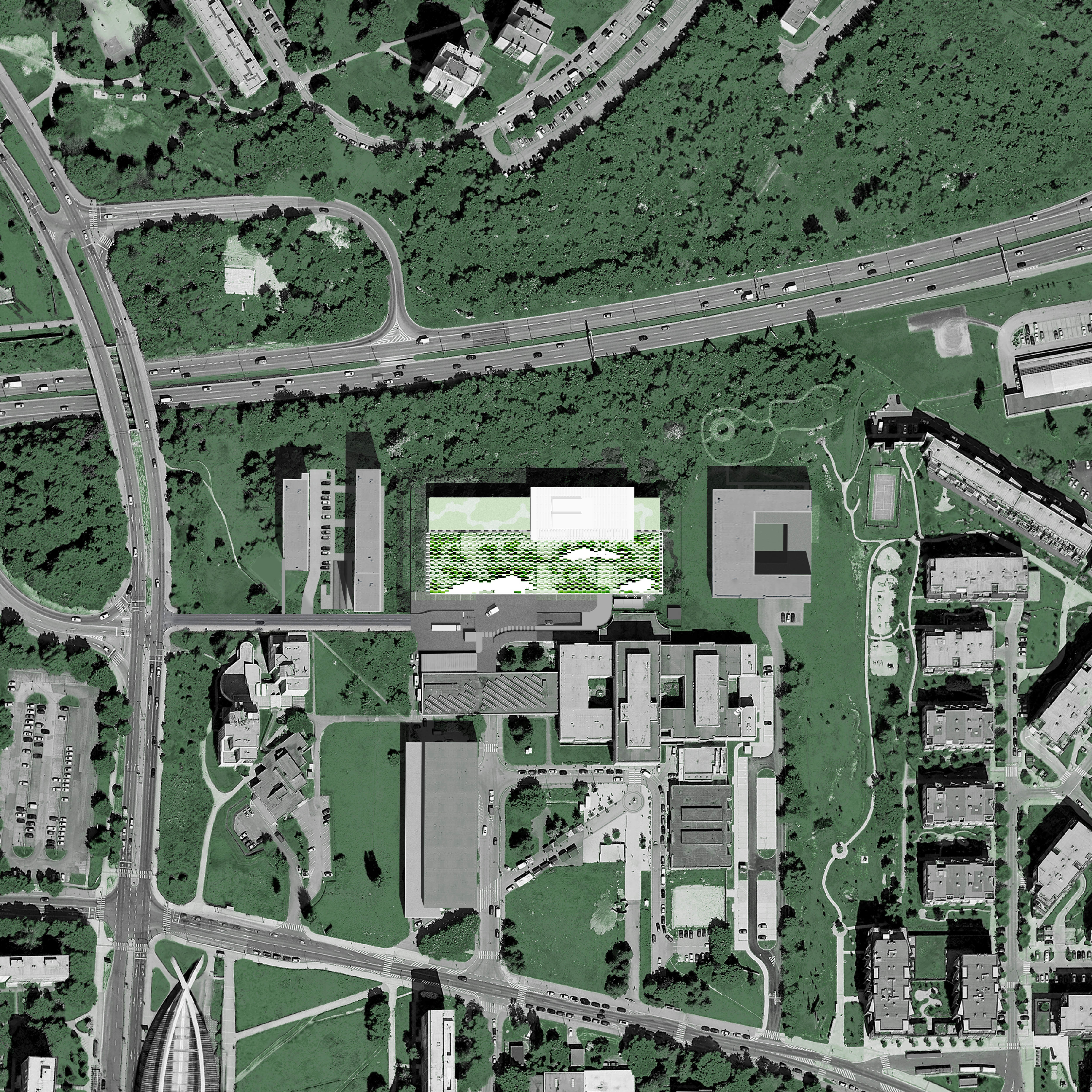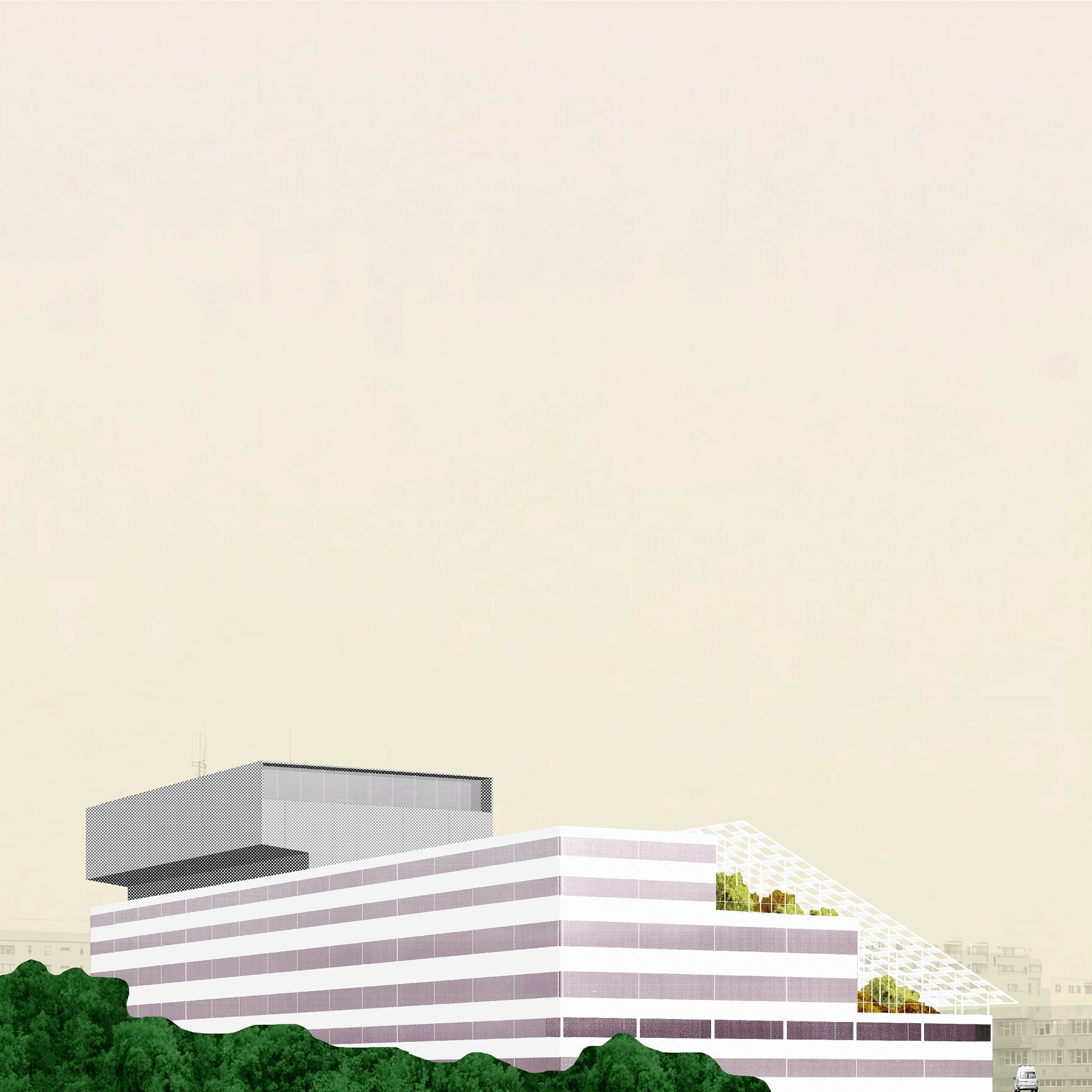 Centrum Zdravotnické záchranné služby hl. m. Prahy musí být hyper propojeno s městem a zároveň před ním téměř skryto. Musí zůstat nepovšimnuto až do té míry, že se rozpustí ve svém kontextu. Jak může tak velká a aktivní budova nepůsobit ve městě rušivě? Jak může zůstat nepovšimnuta, až téměř zmizet na dohled? Aby se s touto výzvou vypořádala, budova jednoduše ustupuje od obvodu pozemku a otevírá dvě nové pohybové osy na svých dvou frontách. Dále je navržen alternativní přístup pro sanitky, který se napojí přímo na Městský okruh malým tunelem, aby nedocházelo k narušení okolí..Budova dává městu prostor, aby kolem ní mohlo nerušeně proudit.