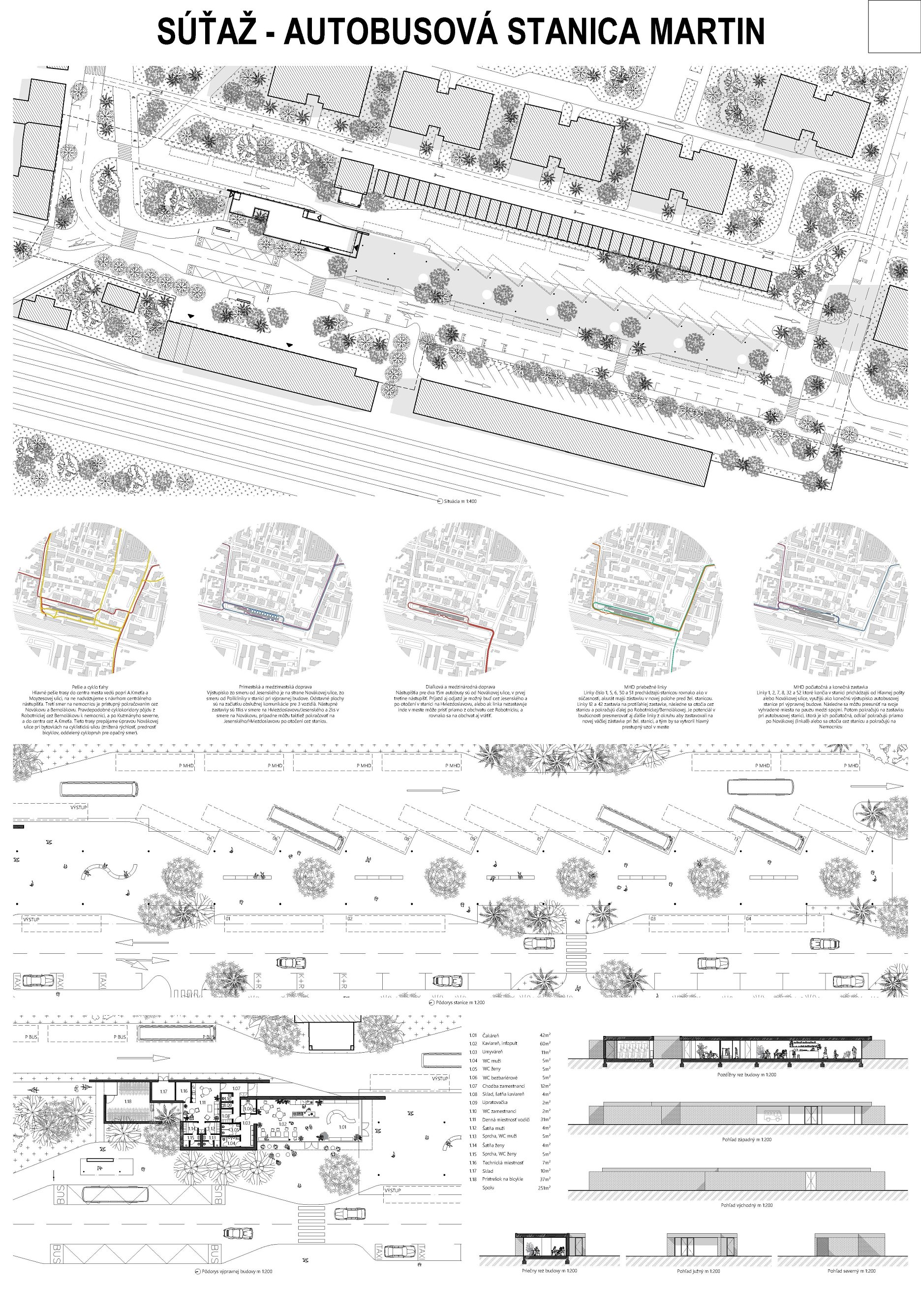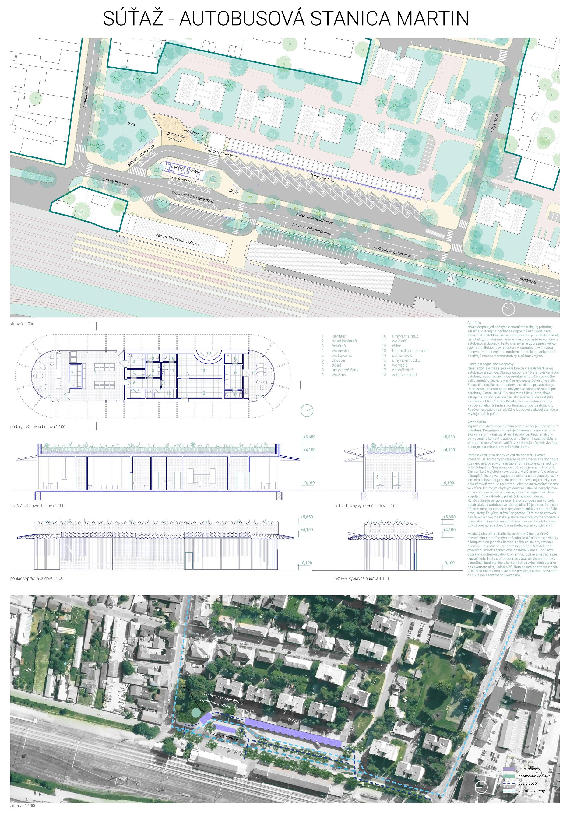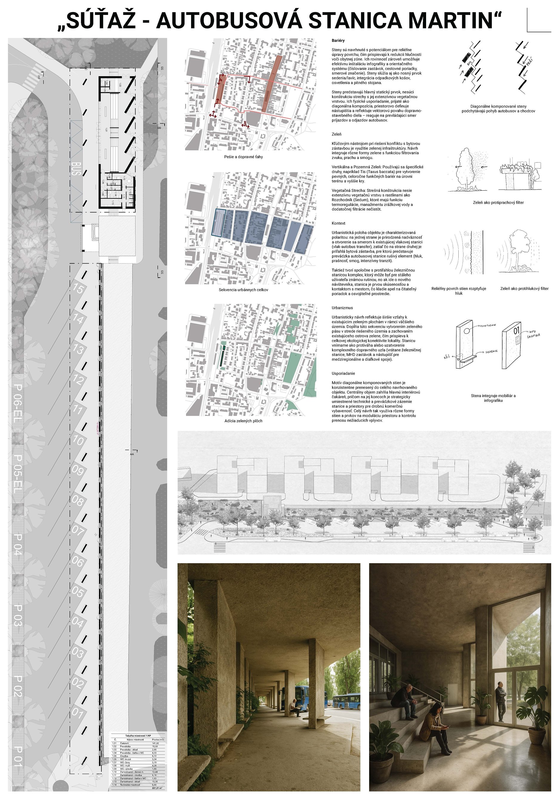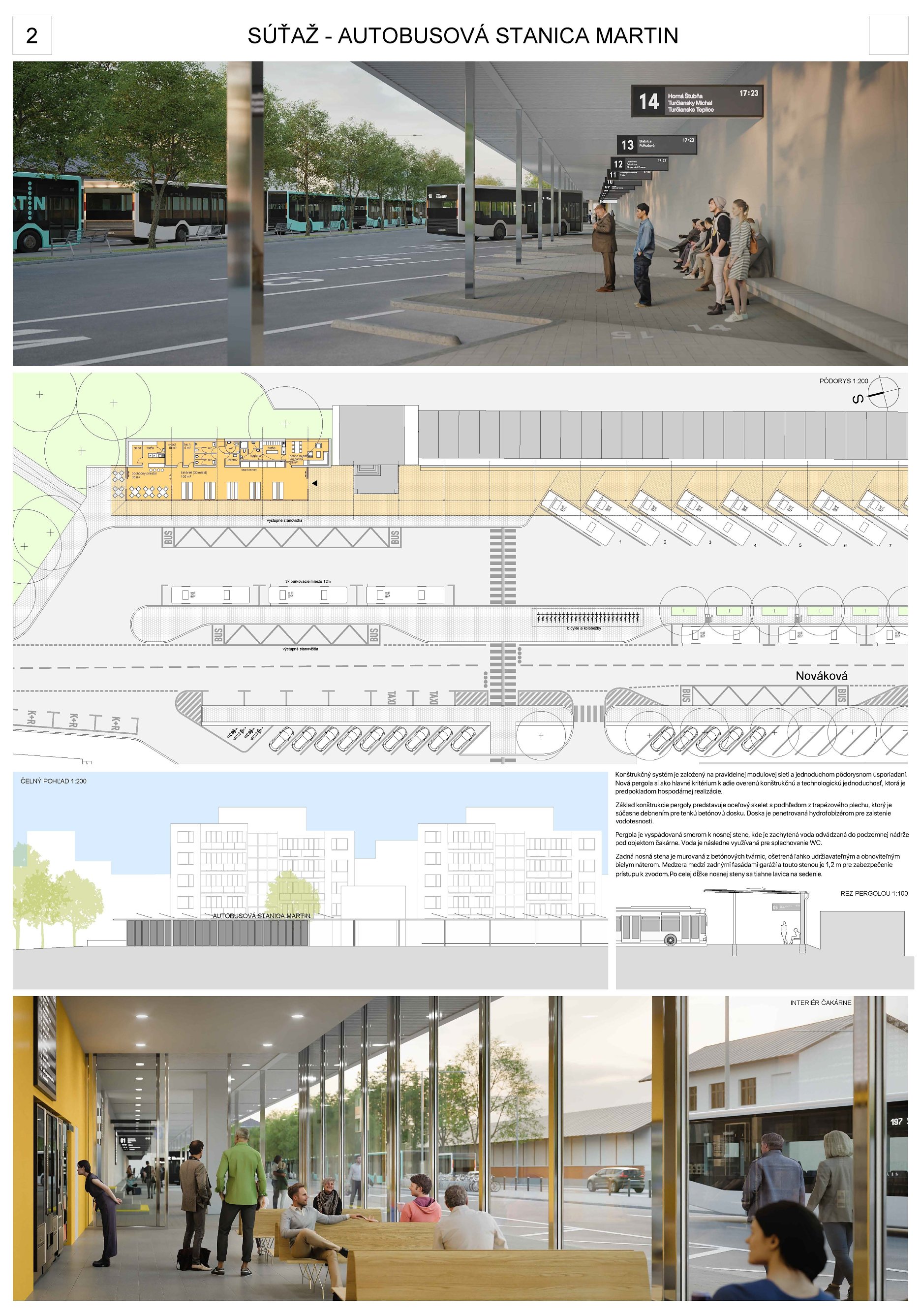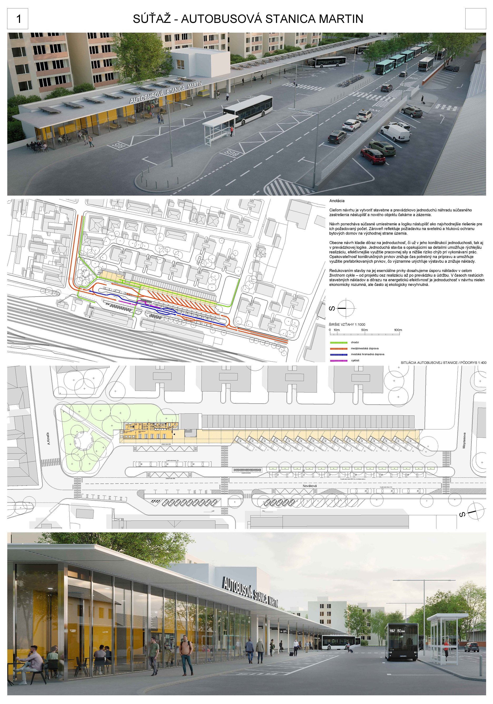 Návrh sa vyznačuje výrazne horizontálnym architektonickým výrazom, ktorý citlivo reaguje na  mierku a charakter okolitej zástavby. V urbanistickom kontexte nepôsobí dominantne, ale  prirodzene dopĺňa existujúcu štruktúru územia, čím podporuje jeho čitateľnosť a priestorovú  kontinuitu. Prináša premyslenú dopravnú koncepciu s plynulou a bezpečnou prevádzkou  pričom urbanisticky sprehľadňuje územie. Autobusová stanica je riešená ako centrálny ostrov  s nástupišťami a pavilónmi, ktoré umožňujú dobrú orientáciu cestujúcich. V rámci dispozičného  riešenia sú všetky hlavné funkcie – prevádzkové priestory pre vodičov diaľkových liniek,  obchodný priestor - kaviareň aj čakáreň - situované v samostatných pozdĺžnych "pavilónoch",  organizovaných pod jednou strechou na úrovni prízemia, pričom zostáva zachovaná možnosť  priečneho aj pozdĺžneho pohybu peších. Na druhej strane obslužné priestory pre čakáreň a  kaviareň sú príliš atomizované (rozptýlené), pričom ich proporcie komplikujú praktické  využitie v reálnej prevádzke. Táto atomizácia má priamy negatívny dopad na stavebné náklady.  Hoci lineárna kompozícia nástupíšť pôsobí esteticky, prevádzková réžia takto rozdrobeného  zázemia je pre správcu menej efektívna. Figúra stanice s lightboxami a nápisom „MARTIN“ je  kvalitná, no nepreváži funkčné limity úzkych vnútorných priestorov.