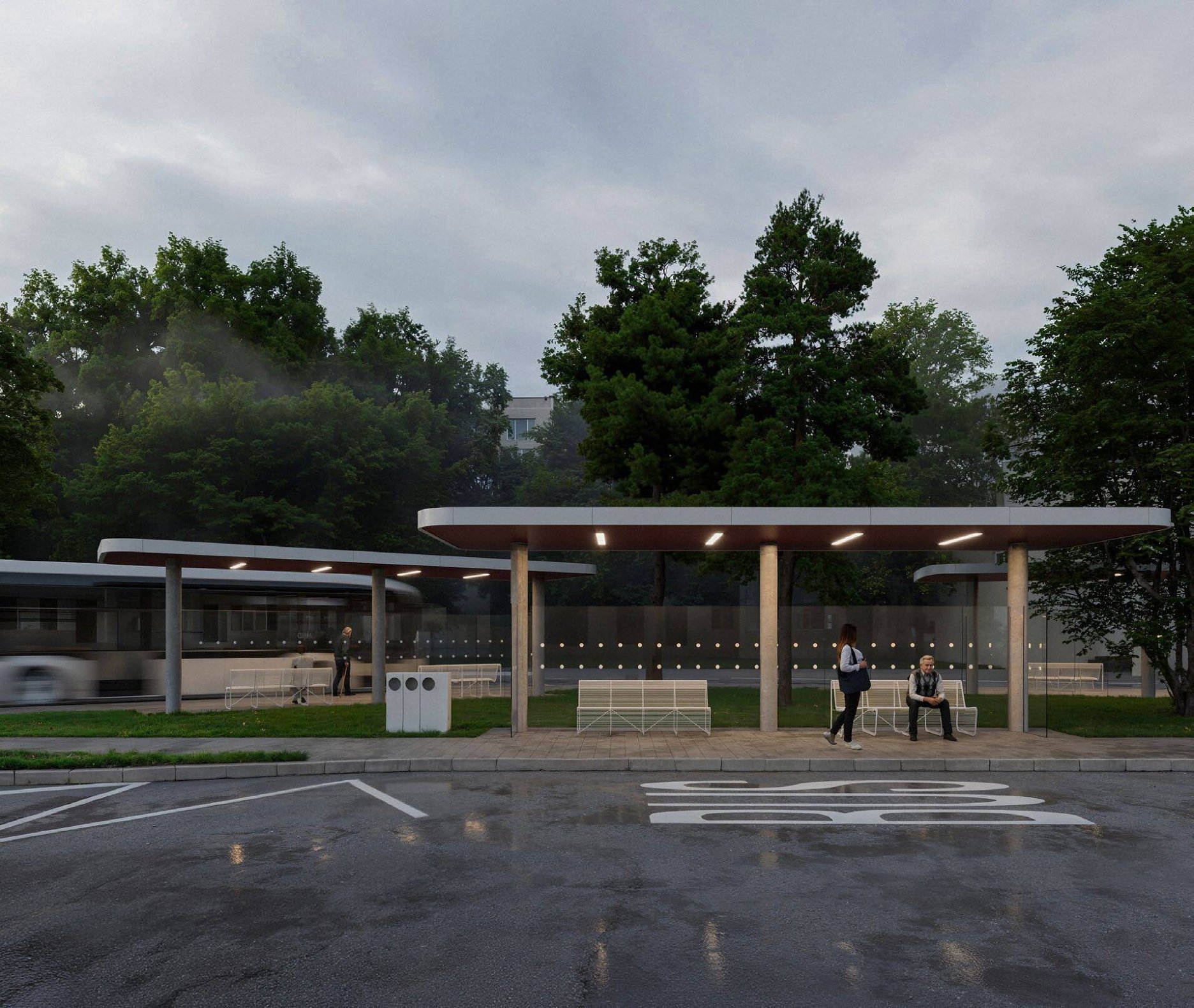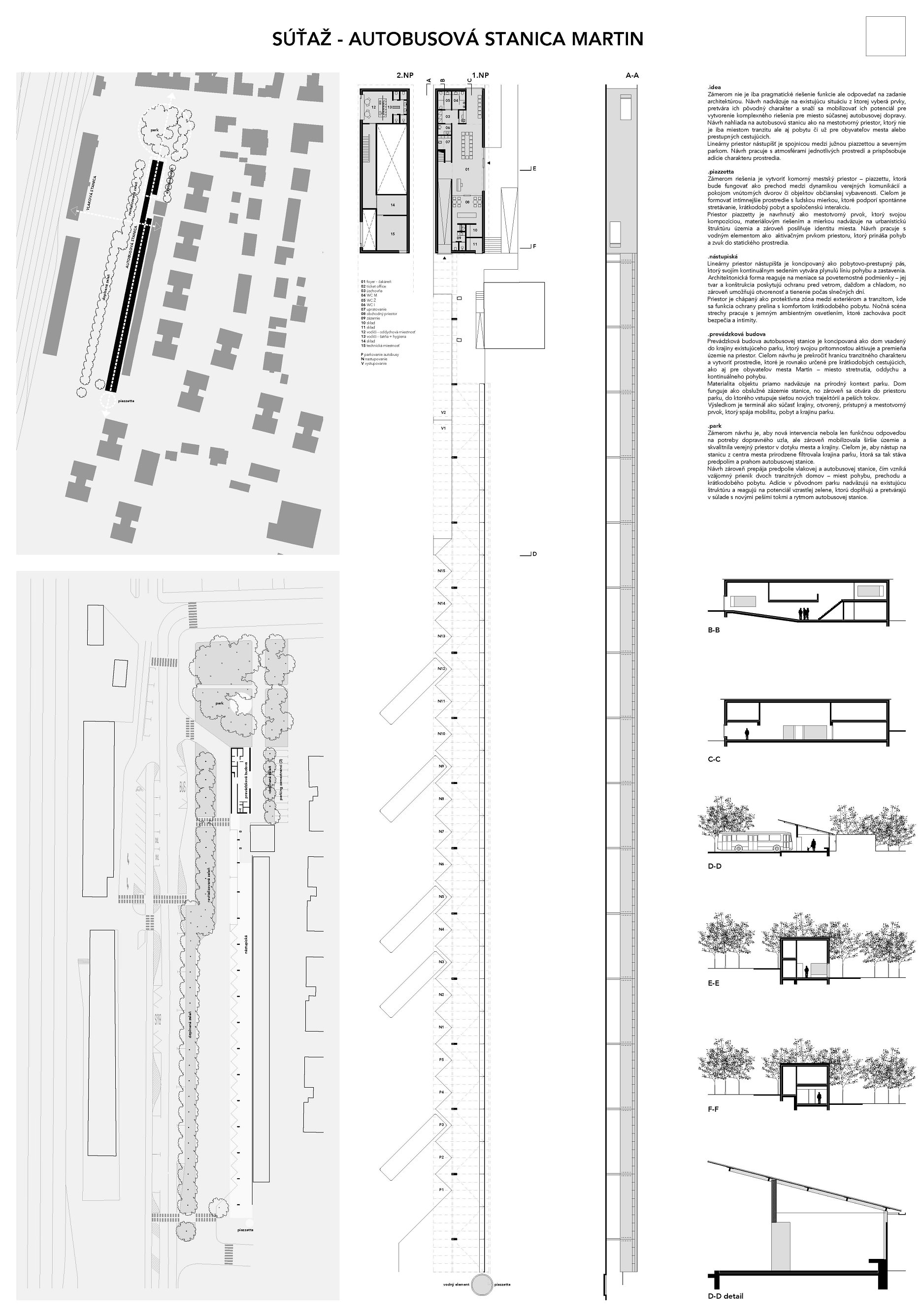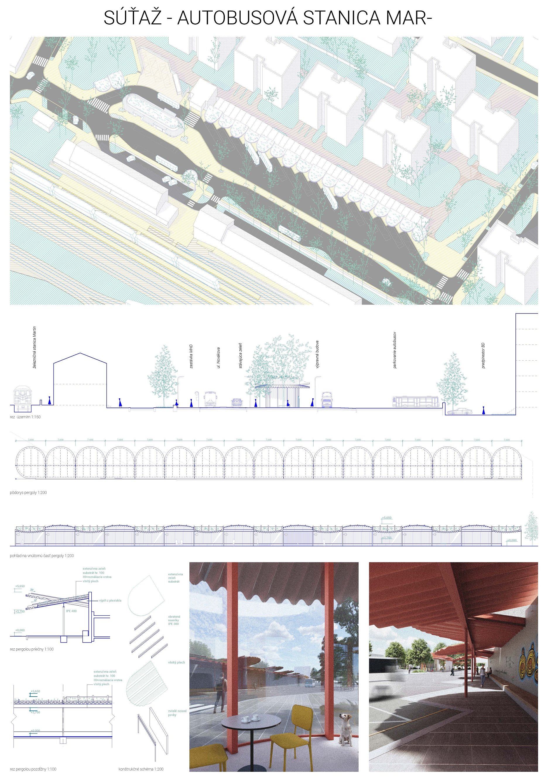 Autobusová stanica s architektonicky disciplinovanou koncepciou. Koncept „dlhého ostrova“  levitujúceho na veľkých stĺpoch vytvára suchú a bezpečnú cestu pre peších. Autorom sa  podarilo pod spoločnú strechu integrovať 15 nástupíšť, výstupiská aj zastávku MHD.  Prevádzkový objekt je sústredený do jednoduchej hmoty kvádra, čo zaručuje efektívnu  prevádzku. Prízemie slúži cestujúcim ako čakáreň a kaviareň, zatiaľ čo poschodie poskytuje  zázemie pre šoférov. Efektívne organizuje dopravné toky a zároveň zlepšuje verejný priestor.  Pred stanicou vzniká malé zelené námestie, ktoré slúži ako exteriérová čakáreň, pobytový  priestor a miesto pre kaviareň. Tým sa výrazne oživuje prostredie, ktorému inak dominuje  doprava. Dopravné riešenie formou slučky zabezpečuje plynulý pohyb bez kolízií. Masívne  kruhové stĺpy veľmi dobre integrujú lavičky pre cestujúcich a vytvárajú tak komfortný priestor  stanice, pričom priestor nástupíšť je navyše veľmi dobre krytý pred nepriazňou počasia.  Odvodnenie strechy do vnútra stĺpov slúži ako zásobník pre polievanie, čo je progresívne  vodozádržné opatrenie. Podhľad zo zeleného kompozitného pororoštu s integrovaným  osvetlením dodáva priestoru moderný technický výraz. Návrh spĺňa všetky kapacitné  požiadavky zadania pri zachovaní vysokej miery verejného priestoru (piazzetta).
