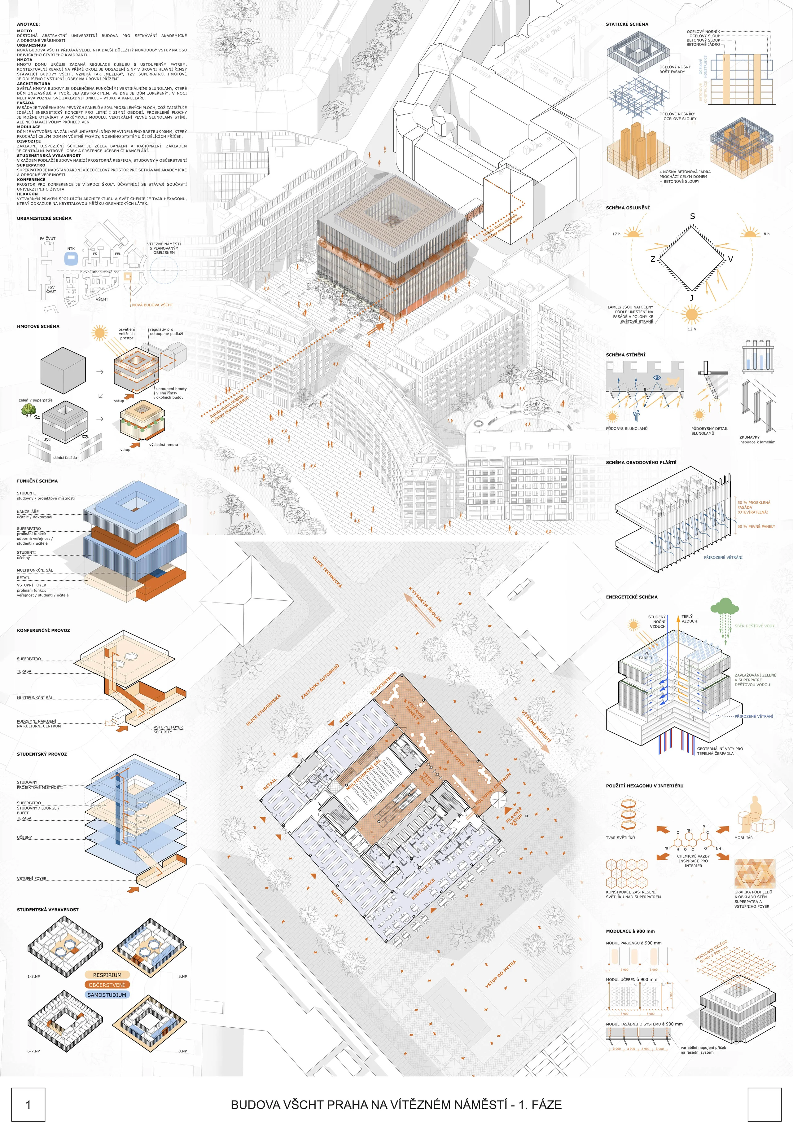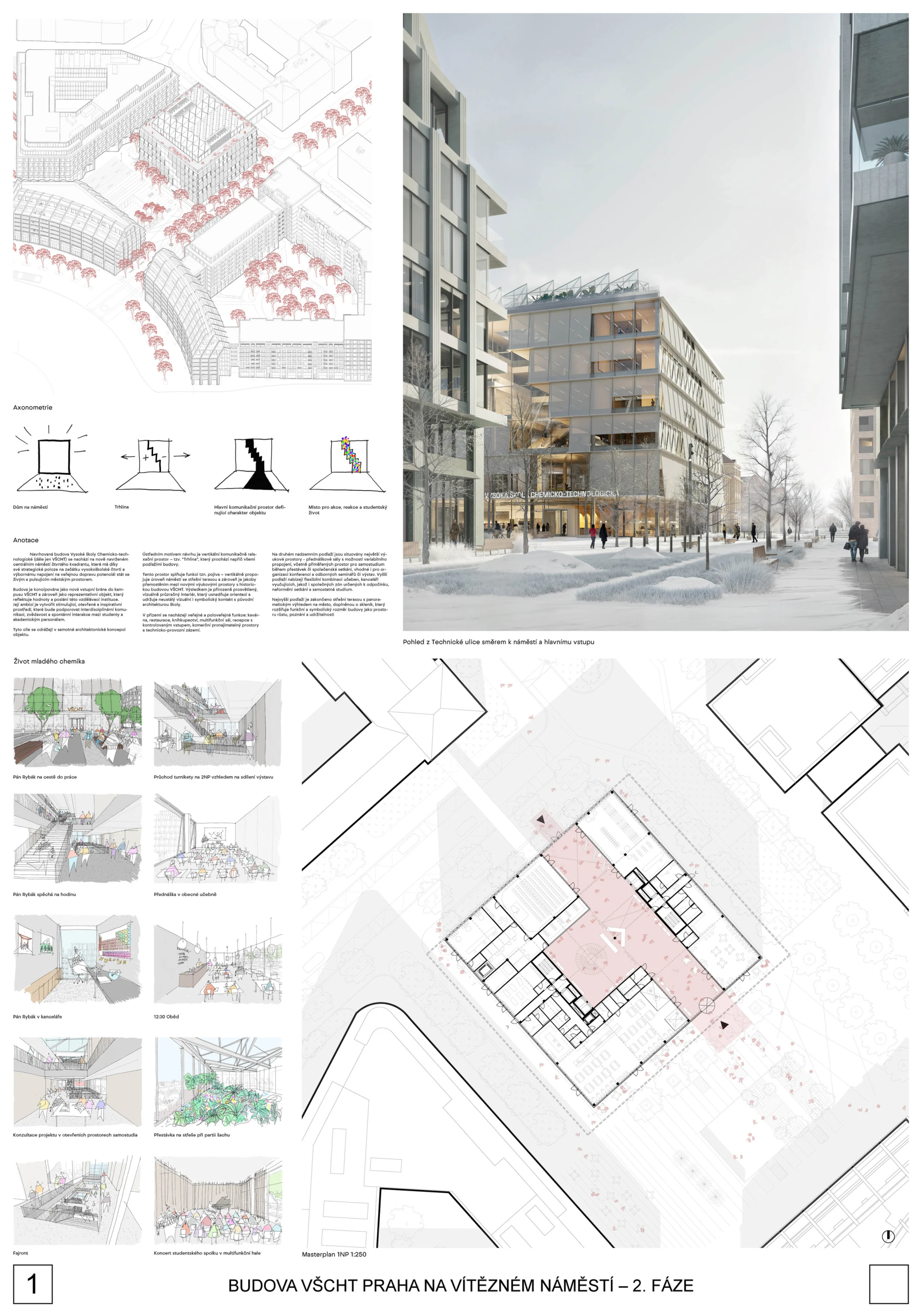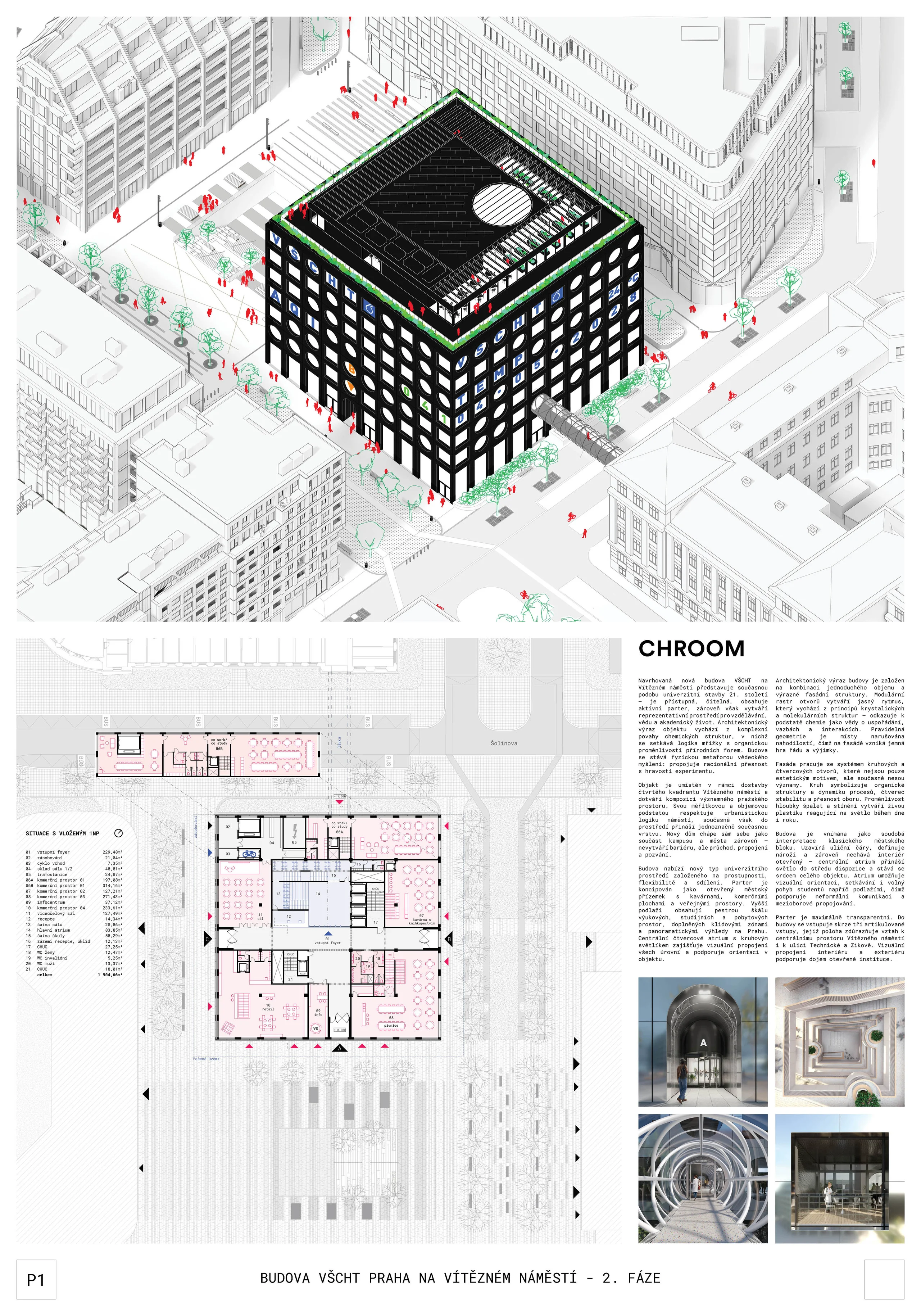 Jej predmetom bol komplexný architektonický návrh stavby, ktorá má vstúpiť do plánovanej dostavby Vítězného náměstí v rámci projektu Fourth Quadrant a prepojiť súčasný areál VŠCHT s novou zástavbou a dejvickým univerzitným kampusom.