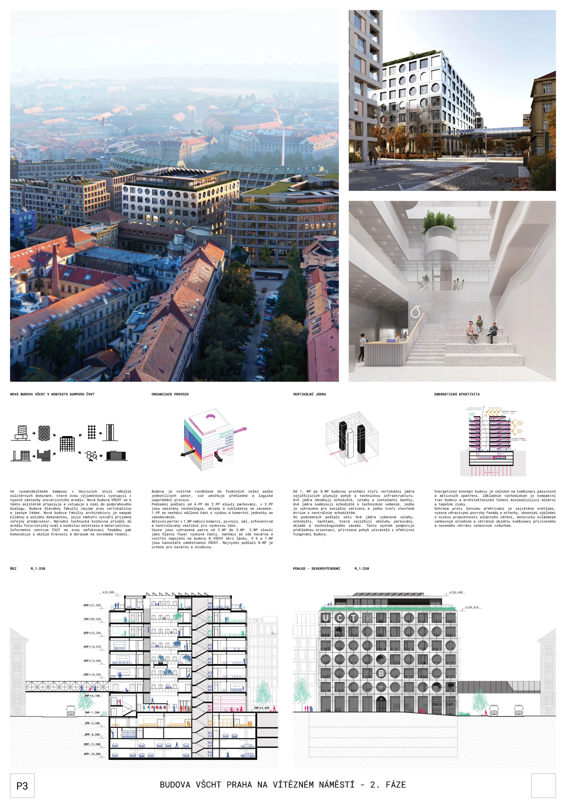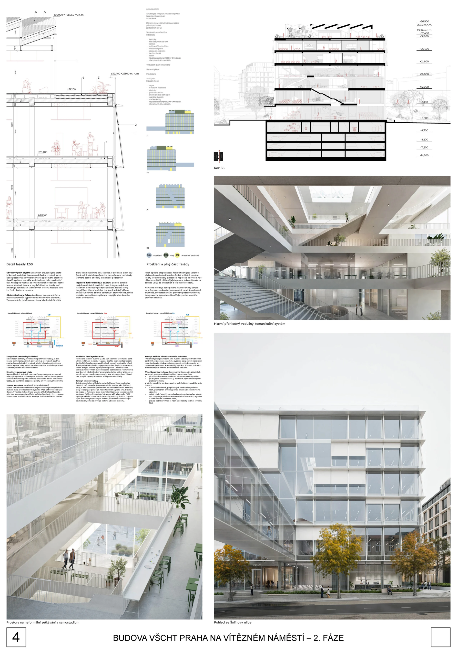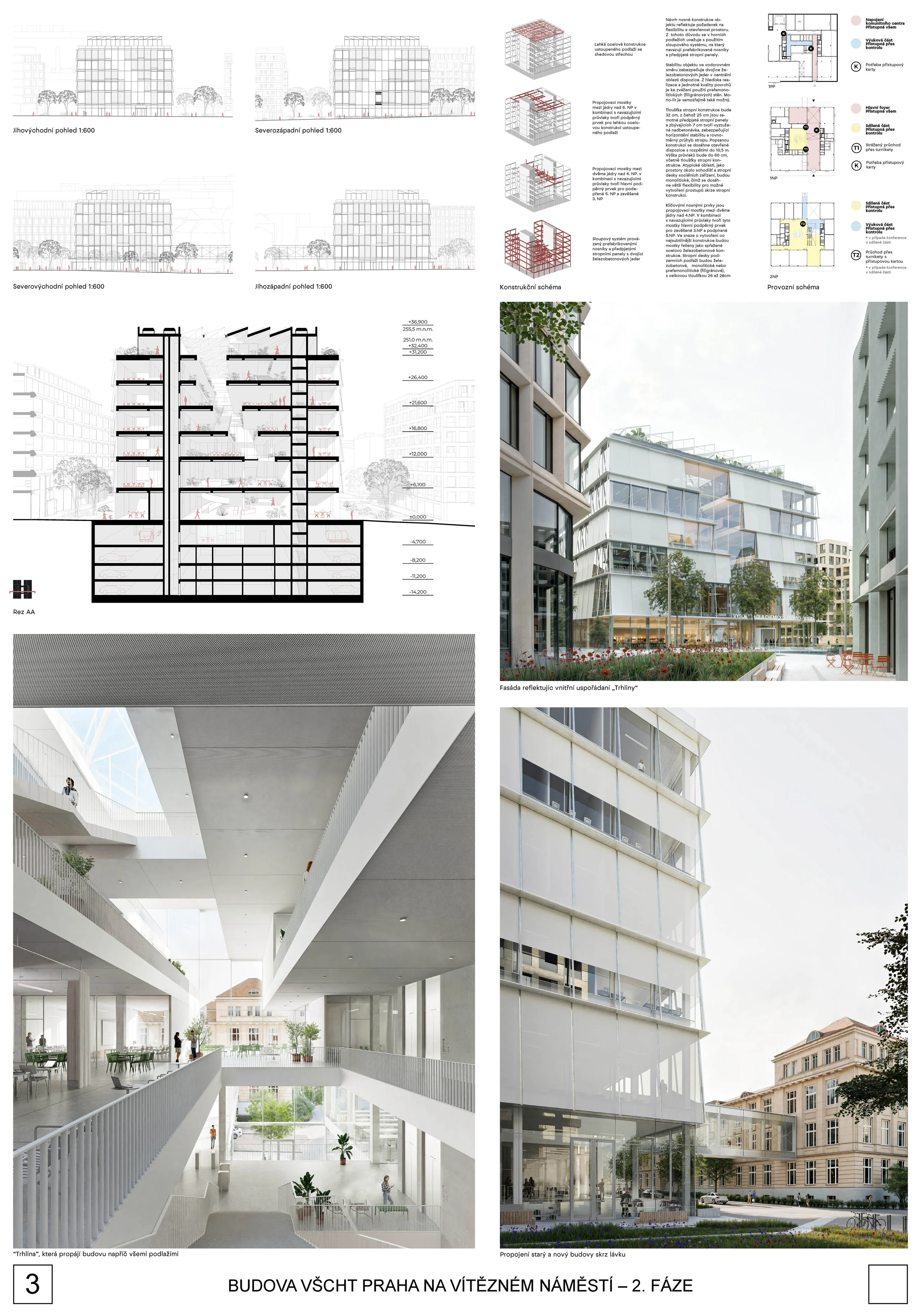 Porota navíc konstatuje, že lze nadále pracovat s oběma verzemi fasády z první i druhé fáze soutěže. Dispoziční řešení je kvalitní jak ve výukové, tak v kancelářské části a bez zásadních výhrad je i řešení vstupního podlaží s dostatečně velkými komerčními plochami. Vstupní část je logicky orientovaná podél Technické ulice a propojuje tak nové náměstí s ulici Šolínova. Je zde transparentní vstupní lobby, které poskytne vhodný přechod mezi veřejným venkovním prostorem a přes turnikety kontrolovaným interiérem univerzitní budovy. Vertikální komunikace a jádra jsou v principu umístěna správně a dispozice typických pater jsou dostatečně variabilní. Velikost rozptylových ploch v atriích je dostatečná a přehledná, ke zvážení je pouze velikost a tvar atriových otvorů.