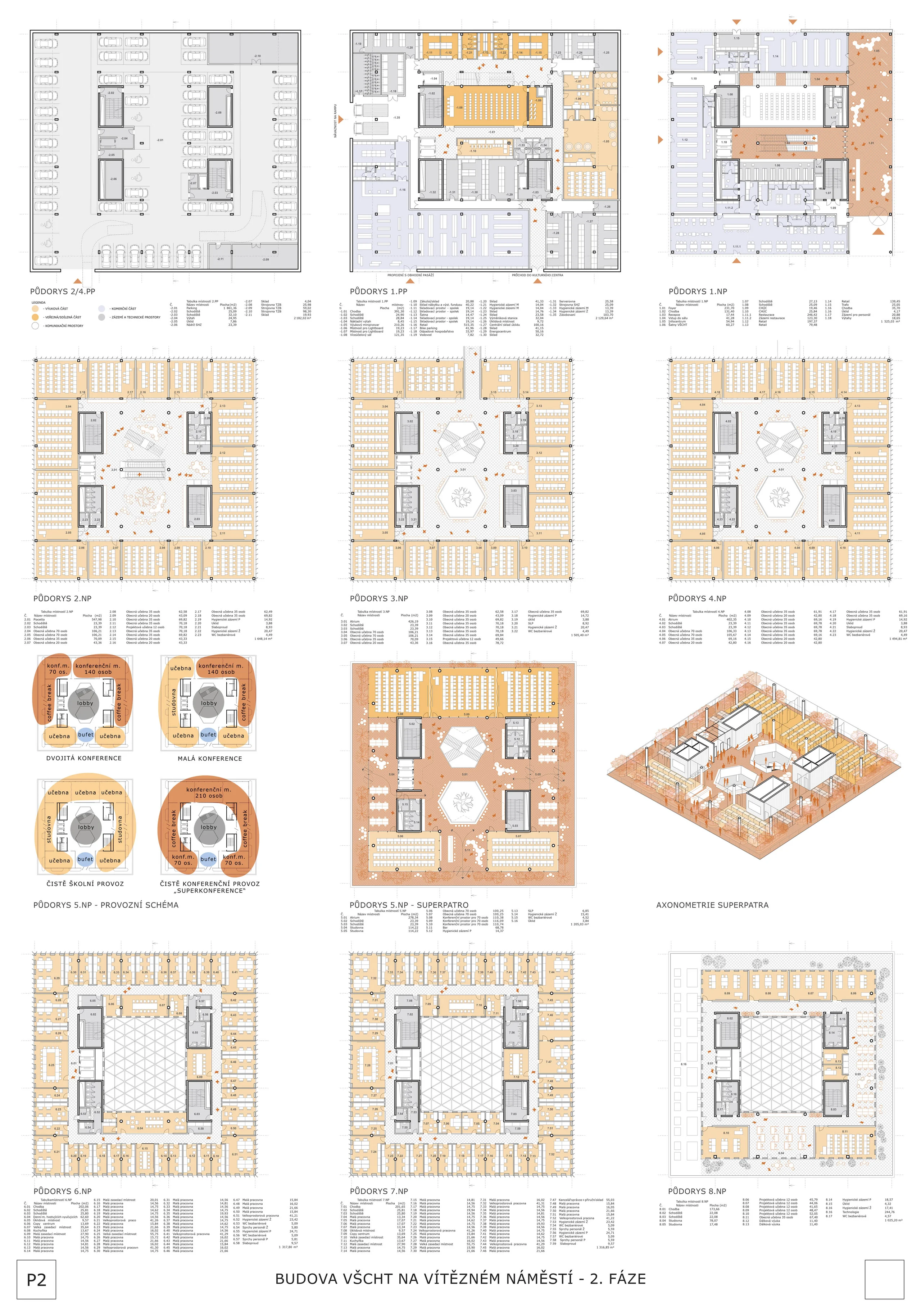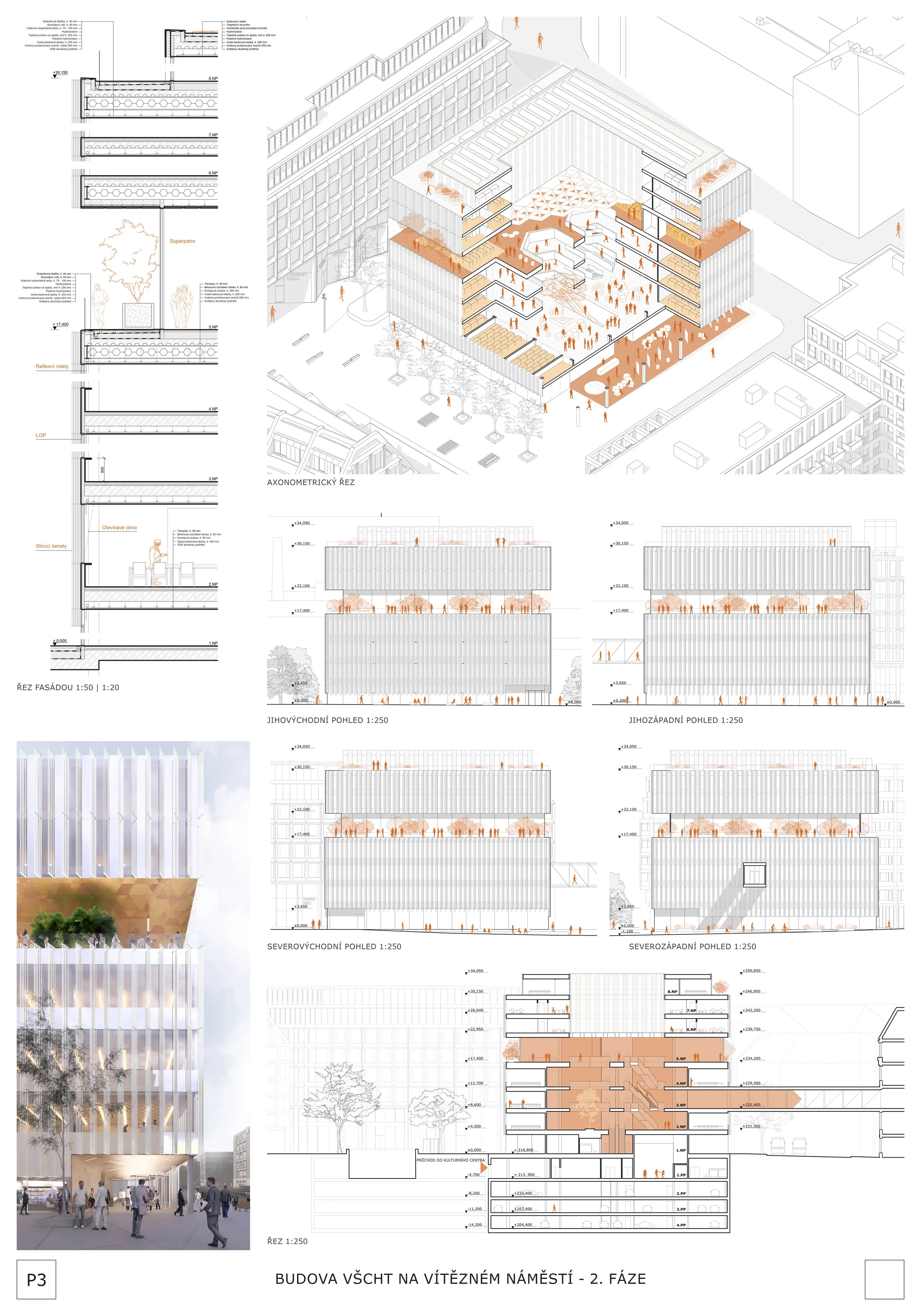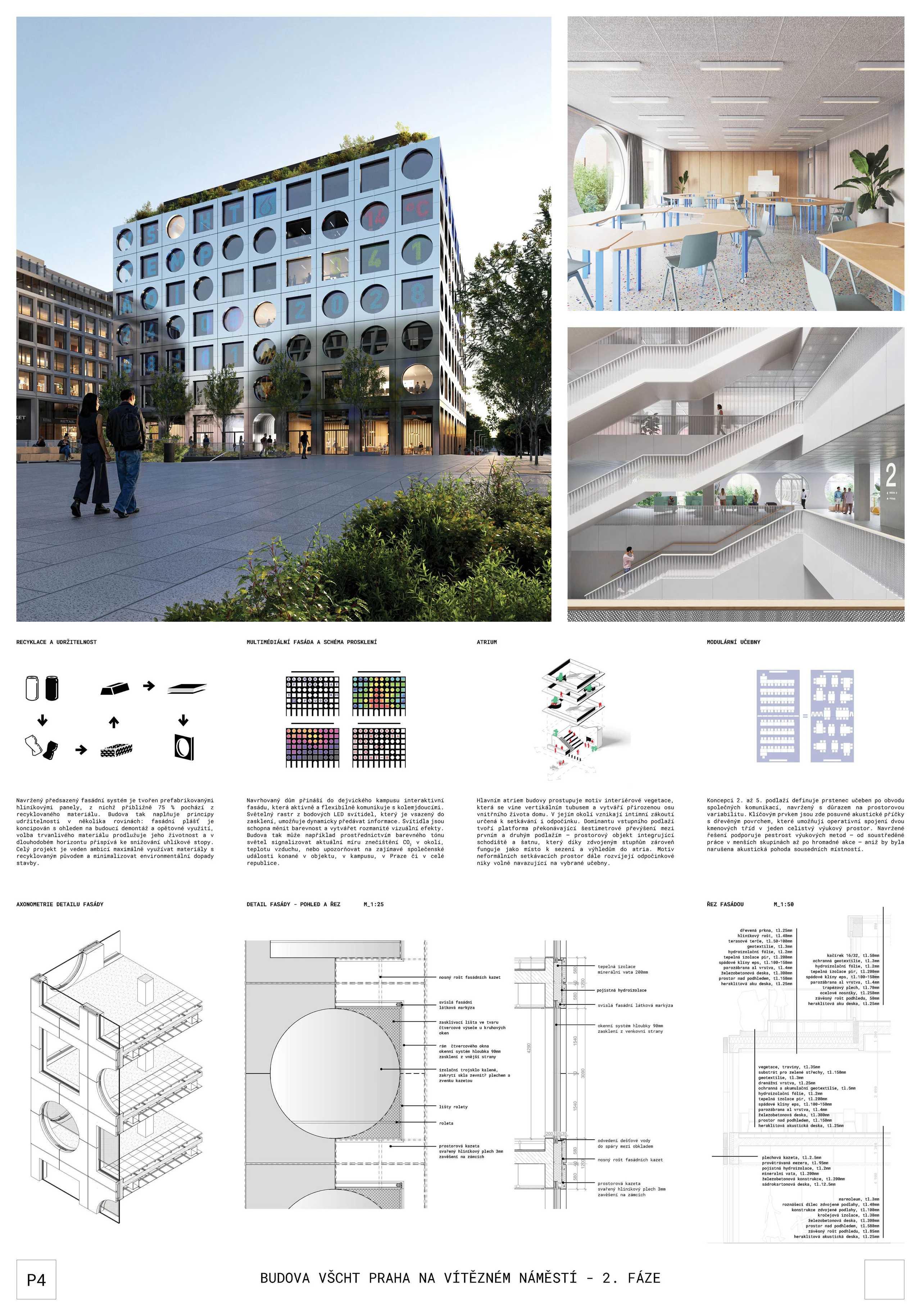 Porota navíc konstatuje, že lze nadále pracovat s oběma verzemi fasády z první i druhé fáze soutěže. Dispoziční řešení je kvalitní jak ve výukové, tak v kancelářské části a bez zásadních výhrad je i řešení vstupního podlaží s dostatečně velkými komerčními plochami. Vstupní část je logicky orientovaná podél Technické ulice a propojuje tak nové náměstí s ulici Šolínova. Je zde transparentní vstupní lobby, které poskytne vhodný přechod mezi veřejným venkovním prostorem a přes turnikety kontrolovaným interiérem univerzitní budovy. Vertikální komunikace a jádra jsou v principu umístěna správně a dispozice typických pater jsou dostatečně variabilní. Velikost rozptylových ploch v atriích je dostatečná a přehledná, ke zvážení je pouze velikost a tvar atriových otvorů.