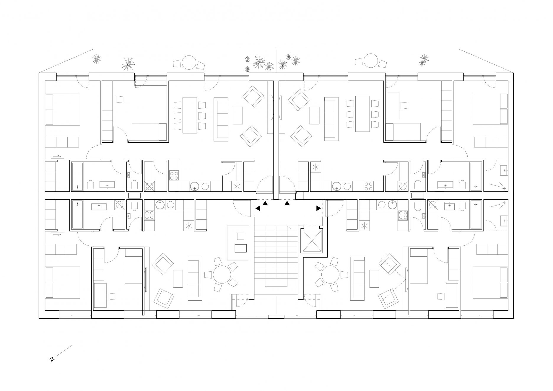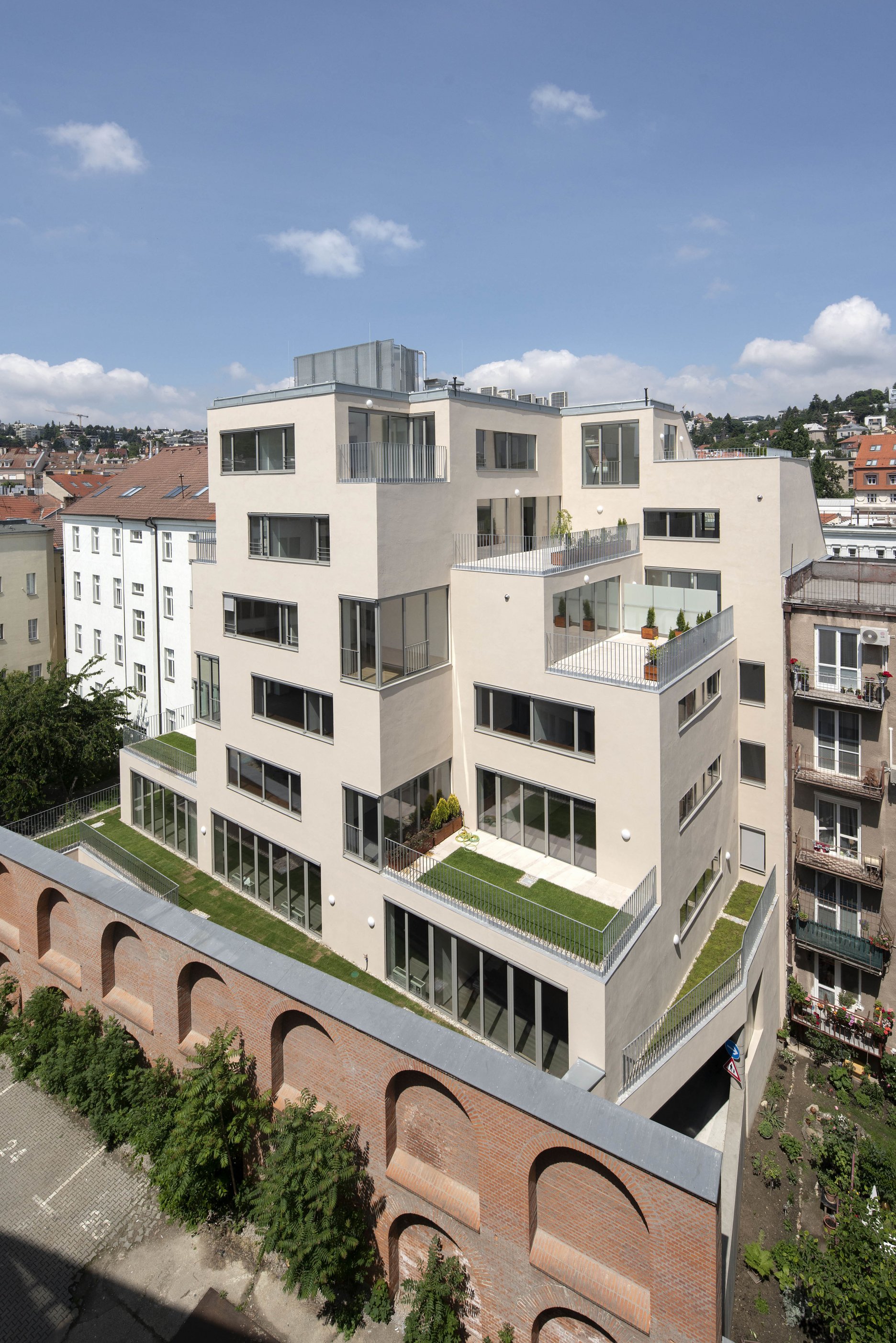 "Kľúčovou architektonickou otázkou návrhu objektu bola voľba takých postupov, ktoré reagujú na historický kontext miesta a zároveň jednoznačne identifikujú túto architektúru ako dnešnú, súčasnú. Okolitú historickú architektúru charakteristickú bohatým reliéfnym klasicistným zdobením sa návrh pokúša interpretovať súčasným architektonickým vokabulárom, ktorý abstrahuje ver-tikálne (smerom na hor) a horizontálne (smerom k susedovi z 20 teho storočia). Rovnako použité materiály, ušlachtilé omietky, drevo.... prezentujú jednak celistvosť vlastného objemu a vzťah s okolím. Architektúra dvornej strany je v detaile prostejšia, tak ako u susedov, dôraz je kladený na drobnejšie proporcie, zeleň na terasách a strechách a svetlotechnické podmienky, ktorých dopad je zrejmý hlavne z uličnej strany."