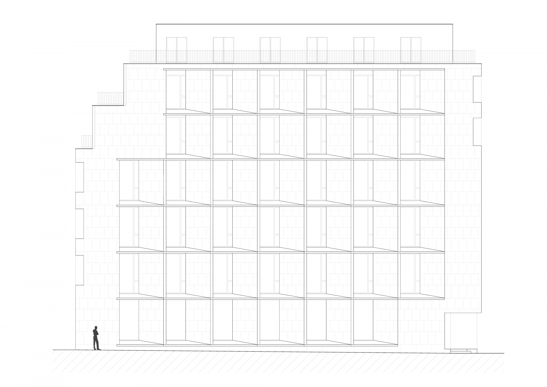"Snahou autorov bolo postaviť mestský panský dom v strede hlavného mesta – svojou identitou, tektonikou, materialitou a detailom. Od začiatku sme si stanovili ako princíp – urobiť budovu s 3 tvárami. Dosiahli sme to plasticitou fasády. Z jednej strany pôsobí ako kamenná plastická stena a z druhej ako stena s otvormi a z frontálneho pohľadu ako raster otvorov. Jednoduchá šikmina okenného ostenia, ako reakcia na zalomenie cesty. Je paradoxné, že napriek kamennému pôsobeniu budovy je táto vlastne vyskladaná zo síce masívnych, ale okenných otvorov. Tie oddeľuje titerná horizontála betónového prefabrikátu. Od začiatku sme kládli veľký dôraz na detail, materialitu a logiku fasády."